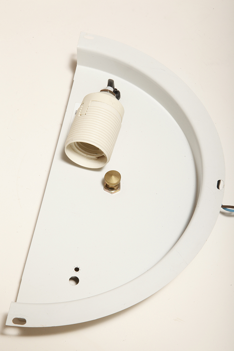 Lampka nie posiada wgnieceń, czy pęknięć. Jedyna znaczącą oznaką lat które ma za sobą to kilka punktowych rys na zewnętrznej stronie głowicy. Widoczne pod pewnym kontem. Pokazaliśmy to na zdjęciach. W zestawieniu z surowością naturalnego koloru blachy z której wykonany jest kinkiet tworzy to spójną całość.