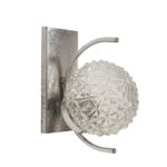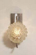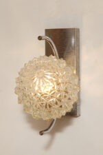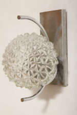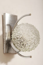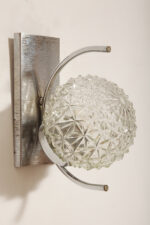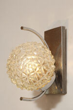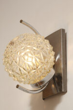 Jednopunktowy kinkiet z fakturowym szklanym kloszem w kształcie kuli i tylną metalową błyszczącą ścianką z okrągłą chromowaną obejmą No 1, Włochy, lata 60/70
