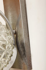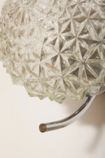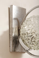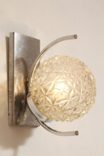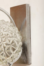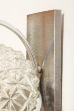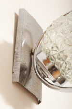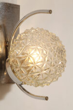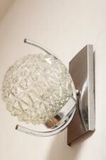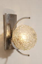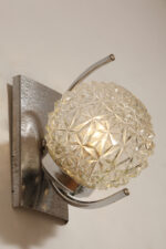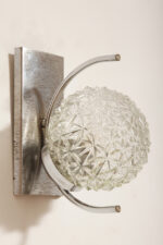 Jednopunktowy kinkiet z fakturowym szklanym kloszem w kształcie kuli i tylną metalową błyszczącą ścianką z okrągłą chromowaną obejmą No 2, Włochy, lata 60/70