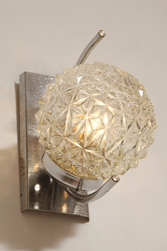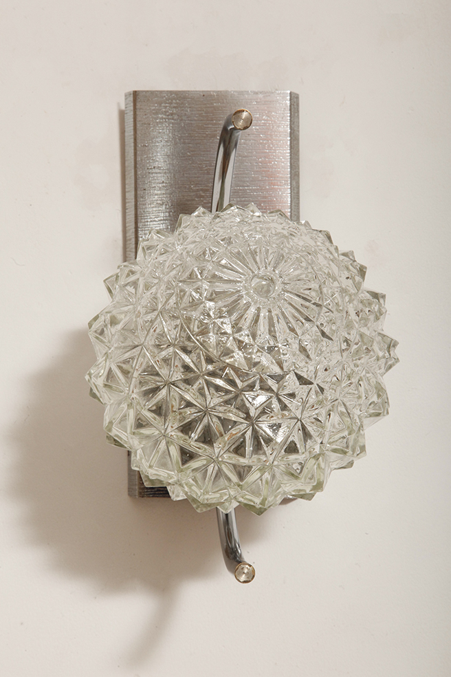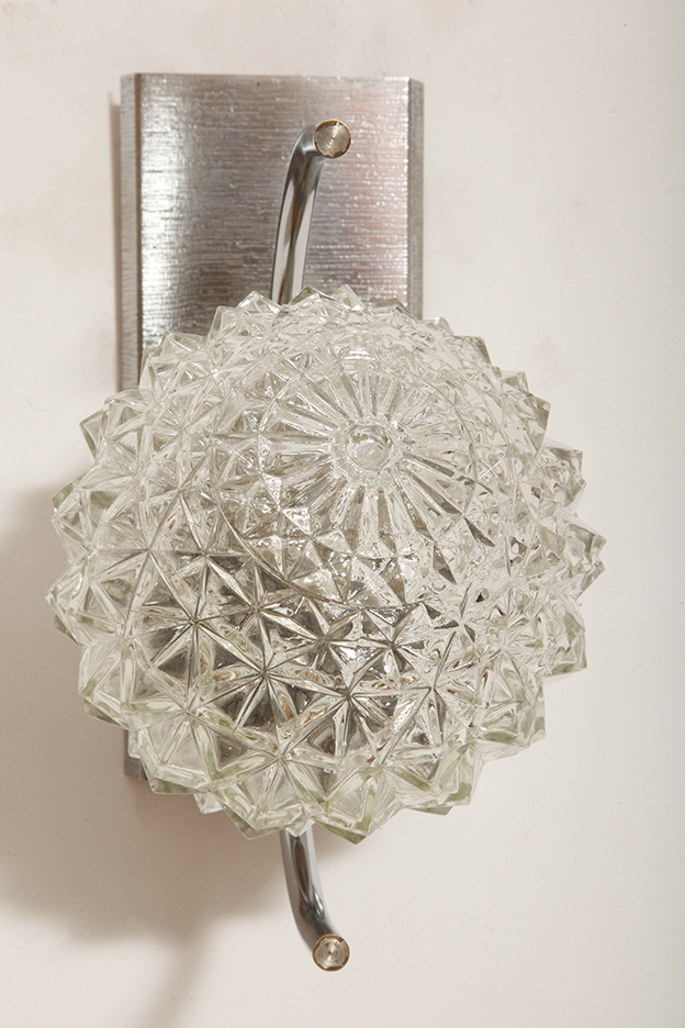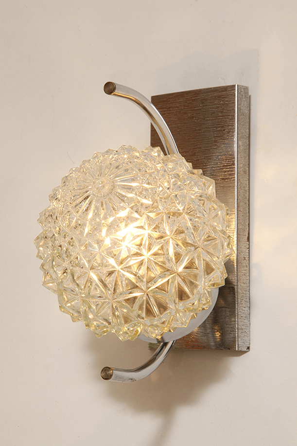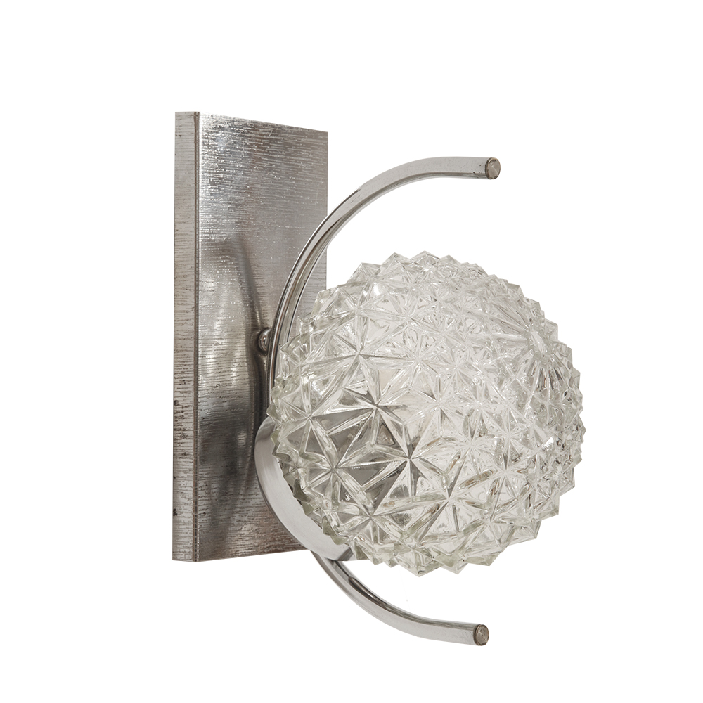 Jednopunktowy kinkiet z fakturowym szklanym kloszem w kształcie kuli i tylną metalową błyszczącą ścianką z okrągłą chromowaną obejmą No 1, Włochy, lata 60/70