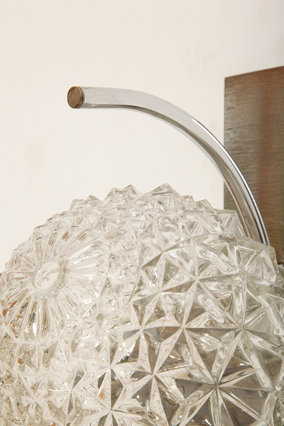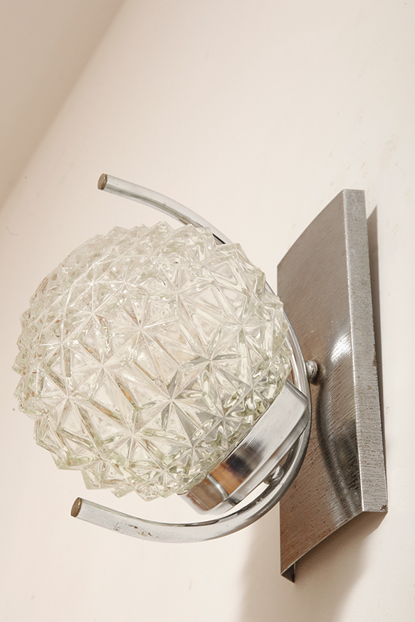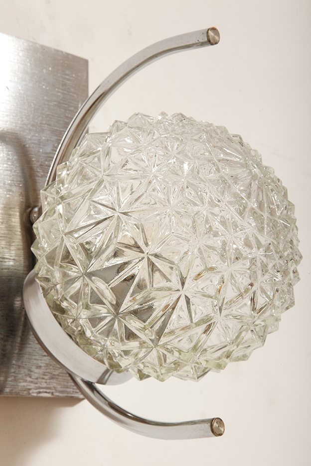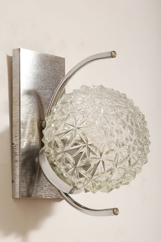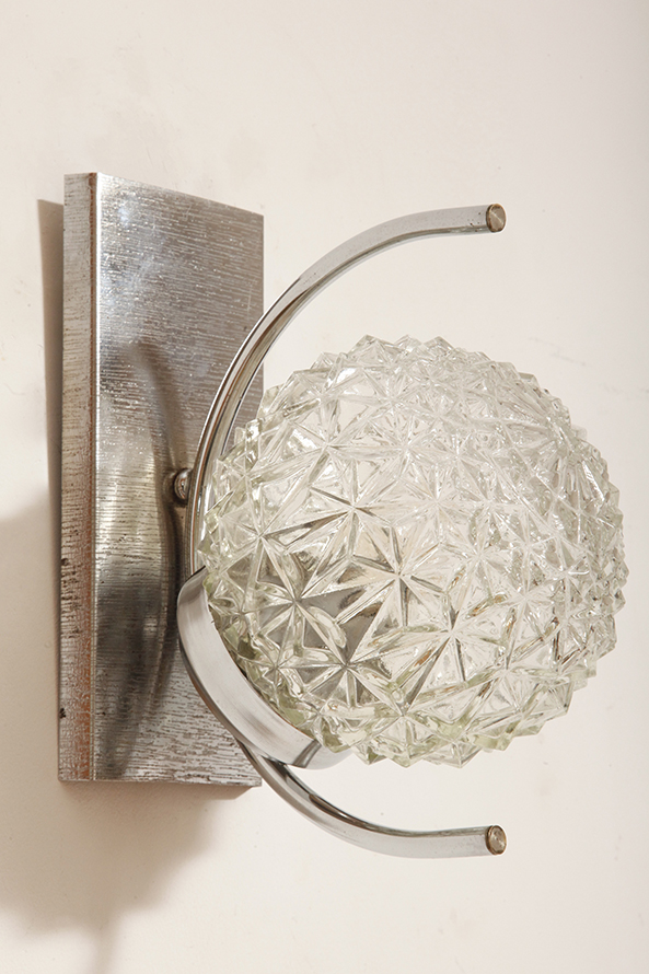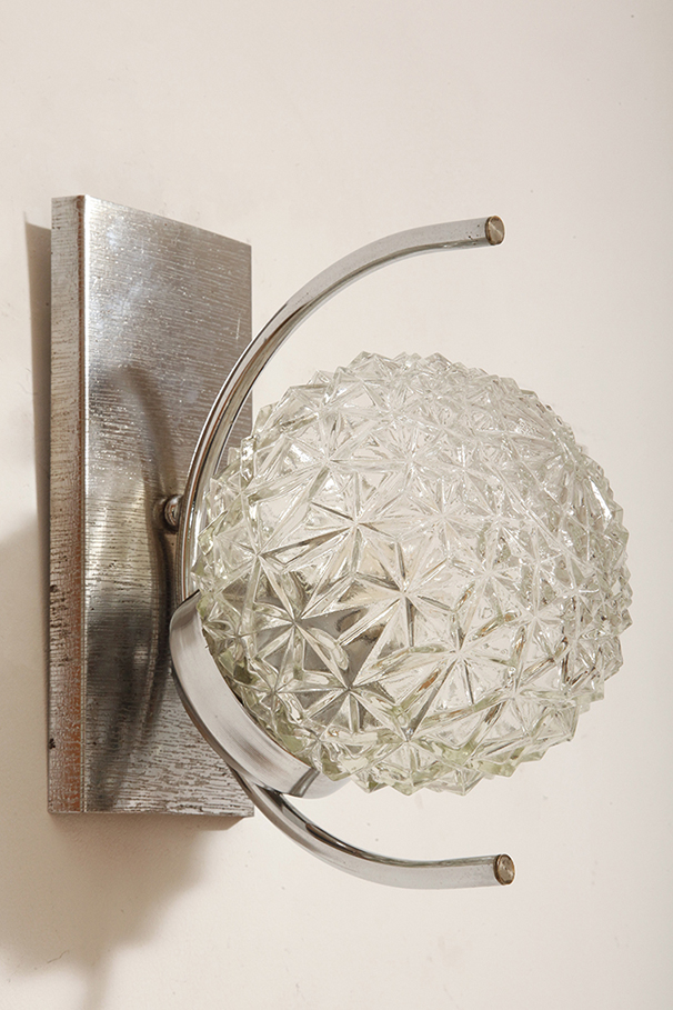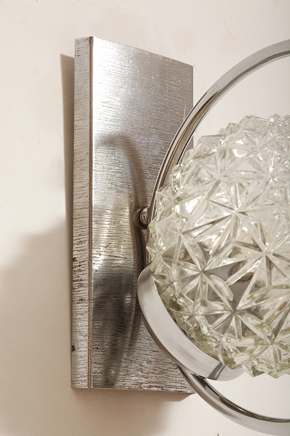 Jednopunktowy kinkiet z fakturowym szklanym kloszem w kształcie kuli i tylną metalową błyszczącą ścianką z okrągłą chromowaną obejmą No 2, Włochy, lata 60/70