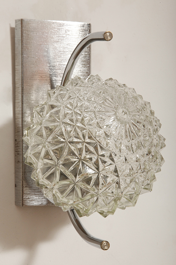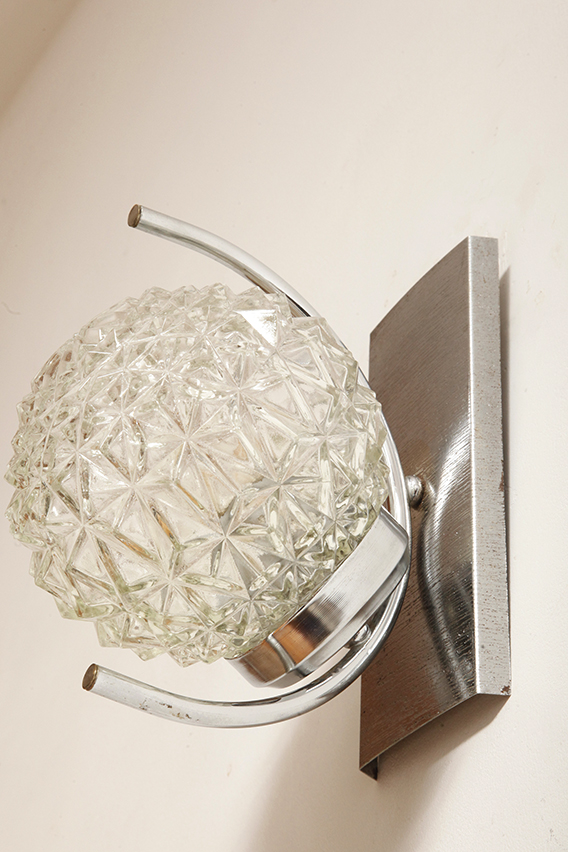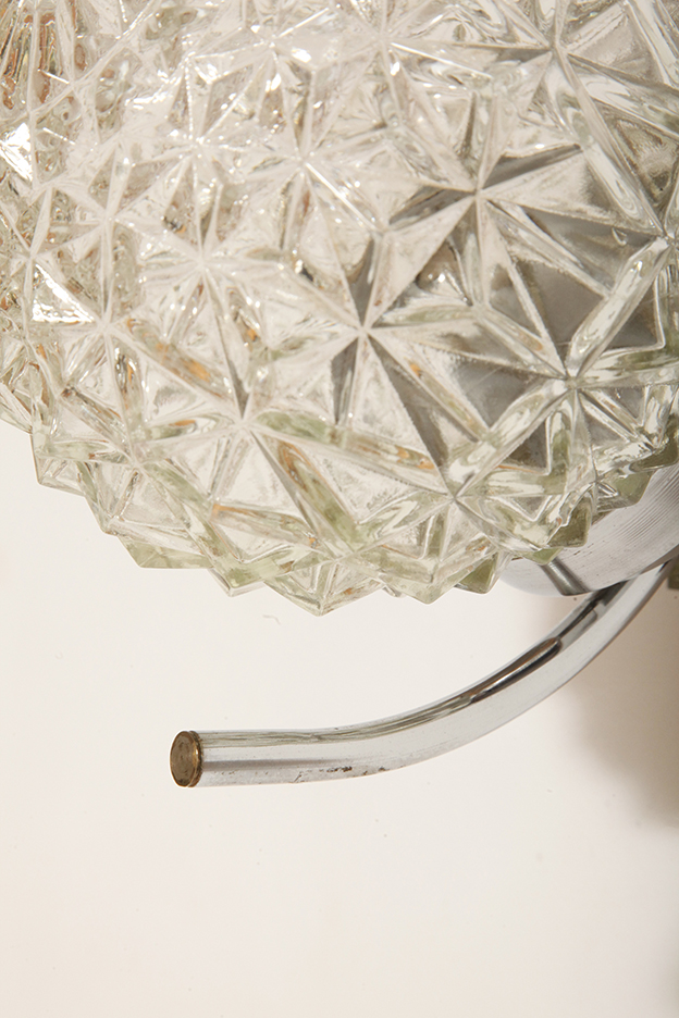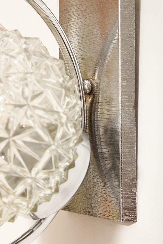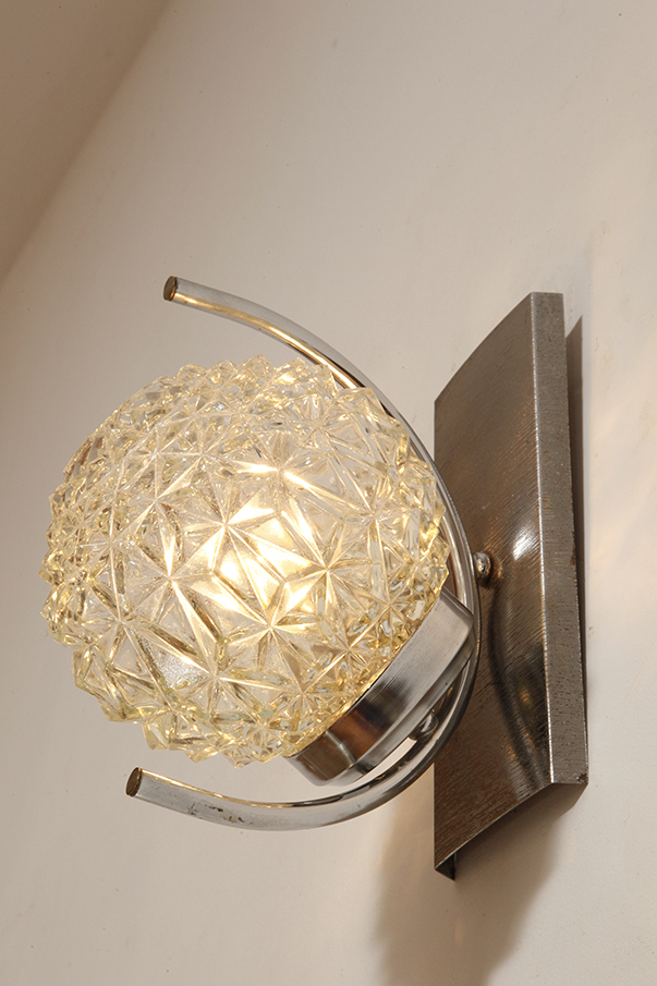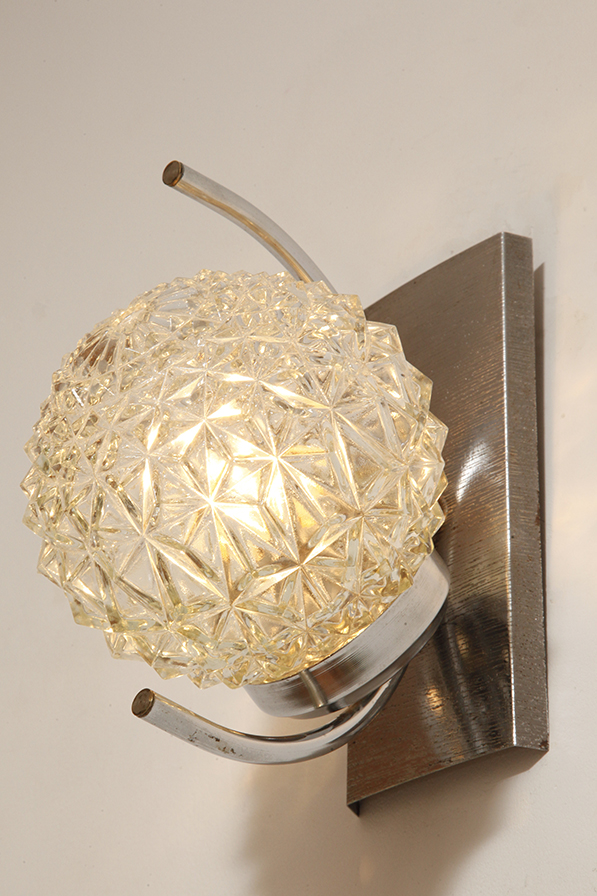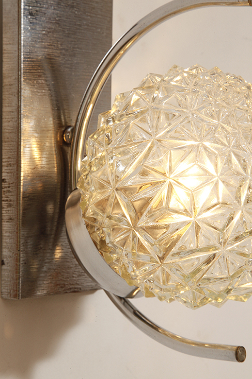 Jednopunktowy kinkiet z fakturowym szklanym kloszem w kształcie kuli i tylną metalową błyszczącą ścianką z okrągłą chromowaną obejmą No 2, Włochy, lata 60/70