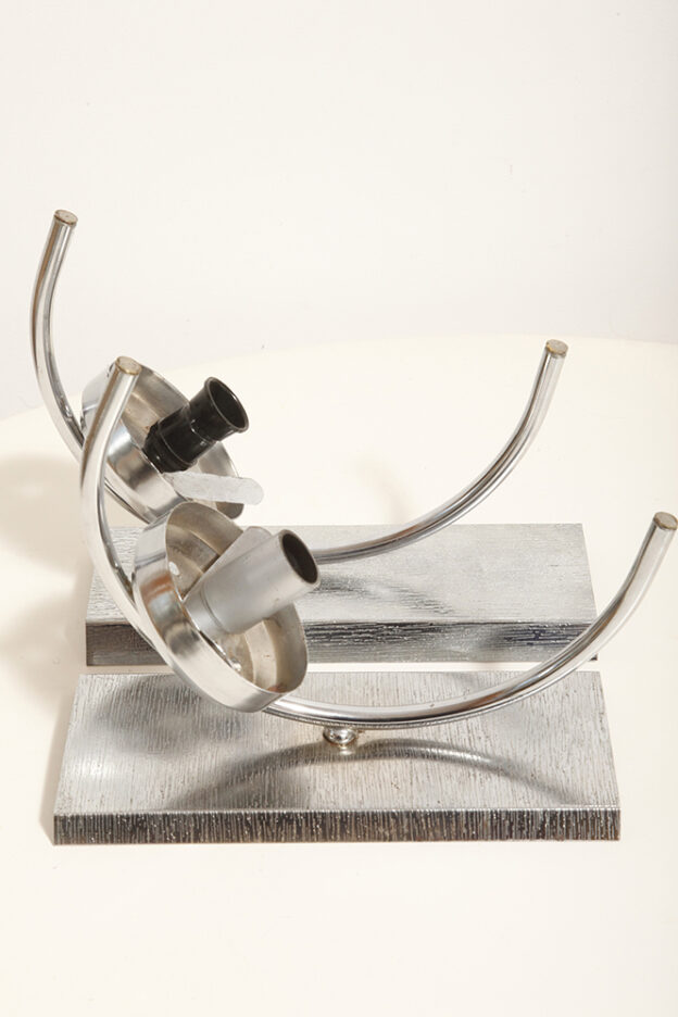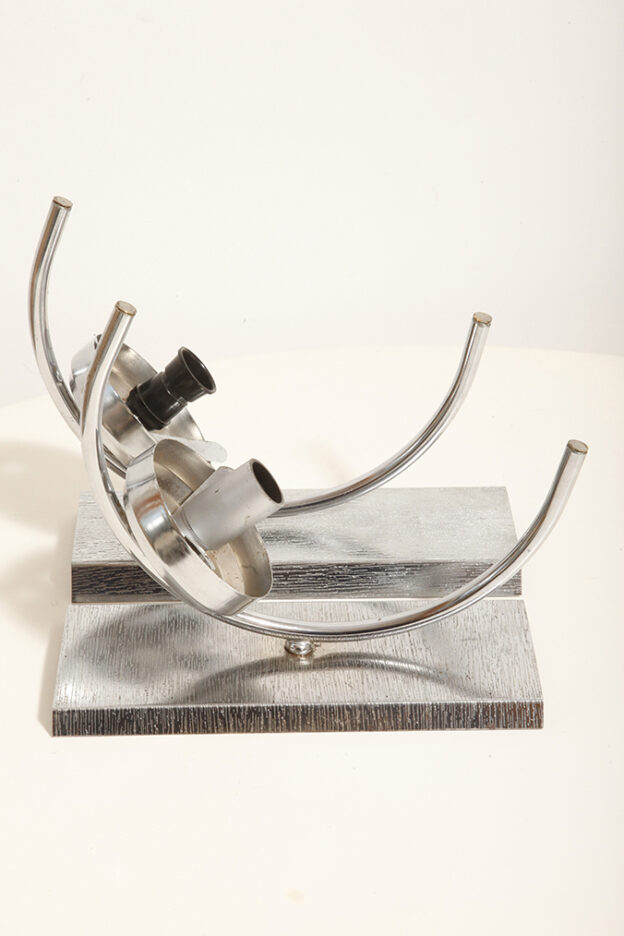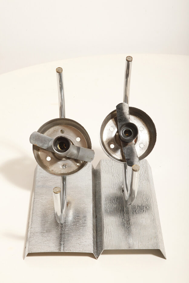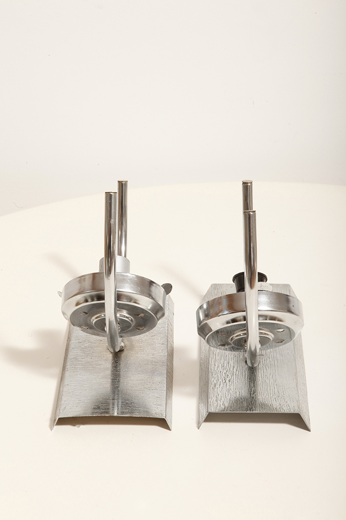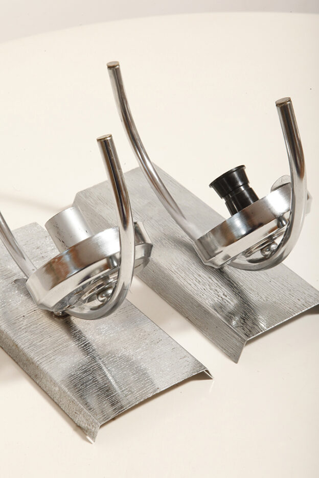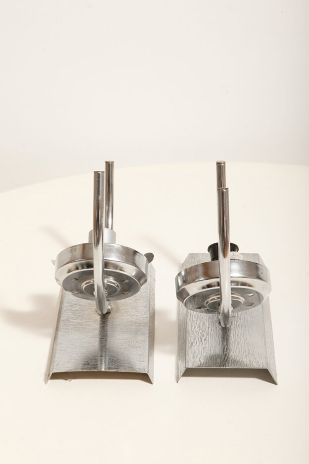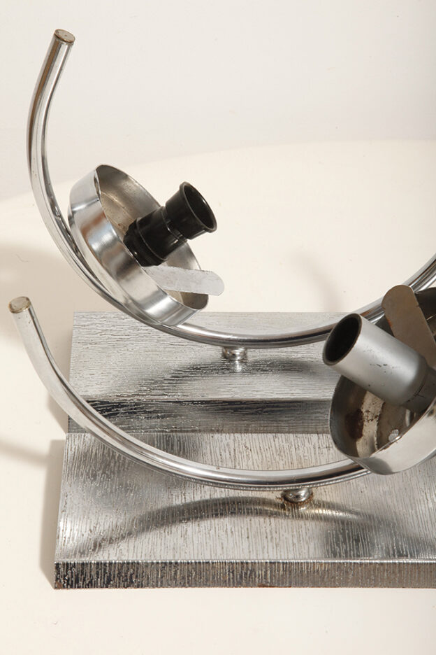 Stawiam na to, że kinkiet jest ręczną robotą jakiegoś niedużego włoskiego zakładu którego właściciel miał różnego typu sny i marzenia. Trochę w nich był o kosmosie, trochę o eleganckich lampach, nieco brutalizmu i wyszło co wyszło. Wszystkiego po trochu. I to jest niewątpliwa zaleta tych kinkietów (mamy drugi bardzo podobny, ale na tyle inny, że wystawiliśmy go oddzielnie – link do niego umieszczamy na dole). Dla ułatwienia i pokazania różnic między nimi zamieściliśmy kilka zdjęć gdy są obok siebie. Moim zdaniem można je potraktować równie dobrze jako komplet.