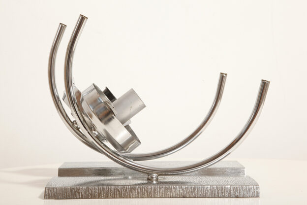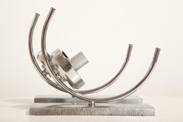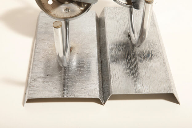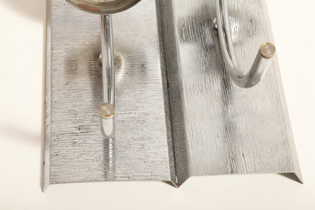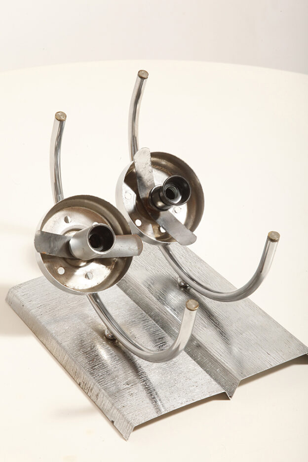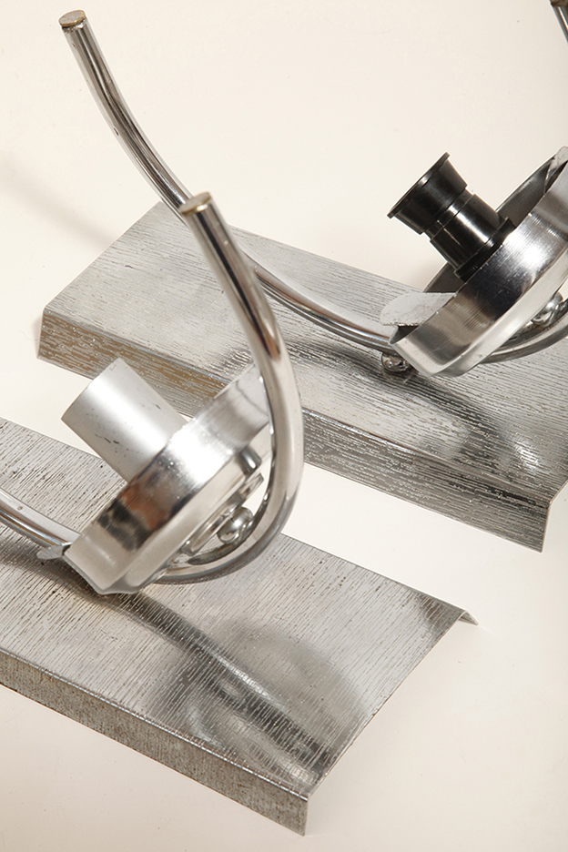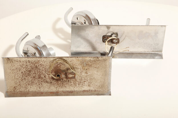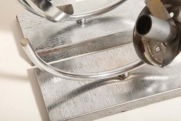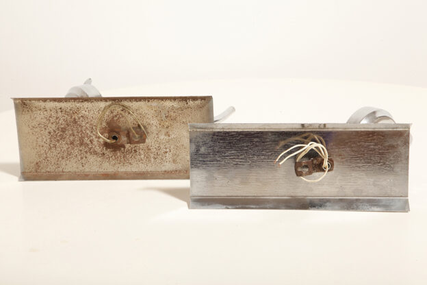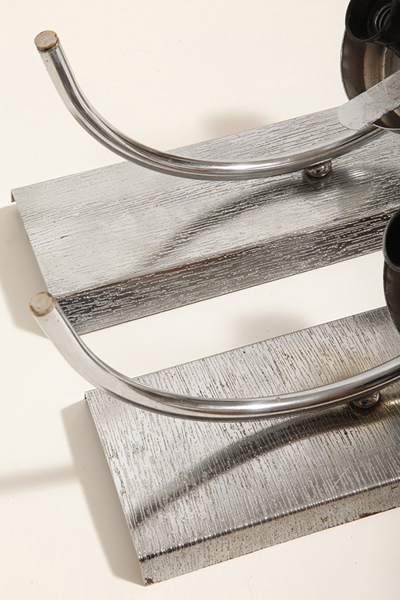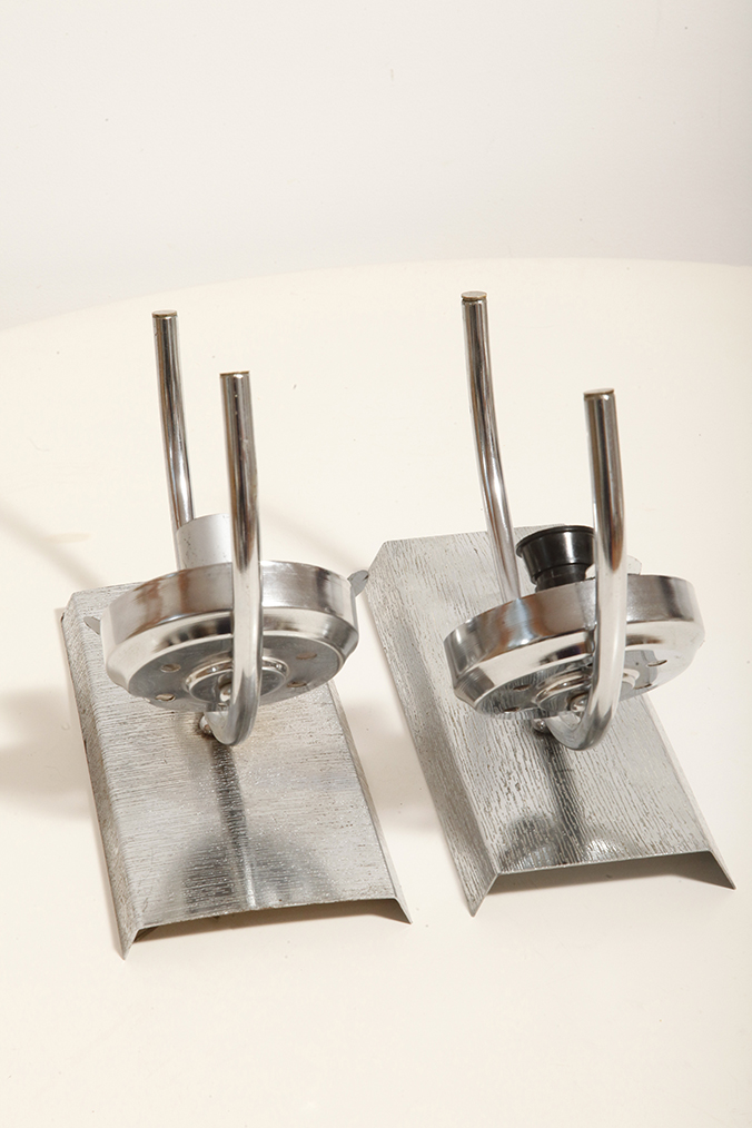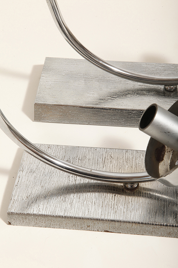 Stawiam na to, że kinkiet jest ręczną robotą jakiegoś niedużego włoskiego zakładu którego właściciel miał różnego typu sny i marzenia. Trochę w nich był o kosmosie, trochę o eleganckich lampach, nieco brutalizmu i wyszło co wyszło. Wszystkiego po trochu. I to jest niewątpliwa zaleta tych kinkietów (mamy drugi bardzo podobny, ale na tyle inny, że wystawiliśmy go oddzielnie – link do niego umieszczamy na dole). Dla ułatwienia i pokazania różnic między nimi zamieściliśmy kilka zdjęć gdy są obok siebie. Moim zdaniem można je potraktować równie dobrze jako komplet.