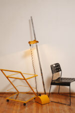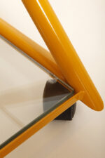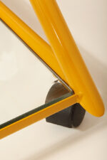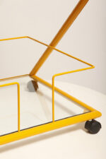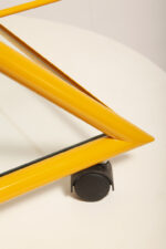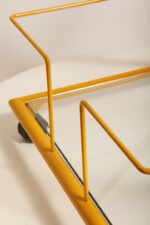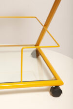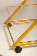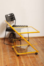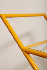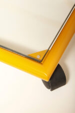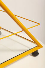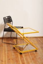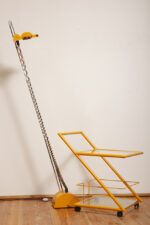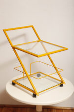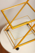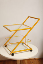 Konstrukcja jest przez nas całkowicie odnowiona / na nowo polakierowana w kolorze melonowym (odcień żółtego) stąd wygląda jak nówka sztuka. Jedynie szklane blaty noszą ślady użytkowania. Mam na myśli drobne użytkowe zarysowania (takie zawsze się znajdą w przedmiotach vintage) i jedno nieduże i niegroźne odpryśniecie w rogu dolnego blatu. Zrobiliśmy mu zdjęcia choć jest bardzo nieśmiały i niewiele go widać. Pomiędzy blatami poprowadzony jest sztywny pręt mający służyć do blokowania np. butelek z soczkami i mlekiem. Nie inaczej.