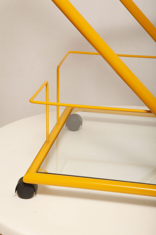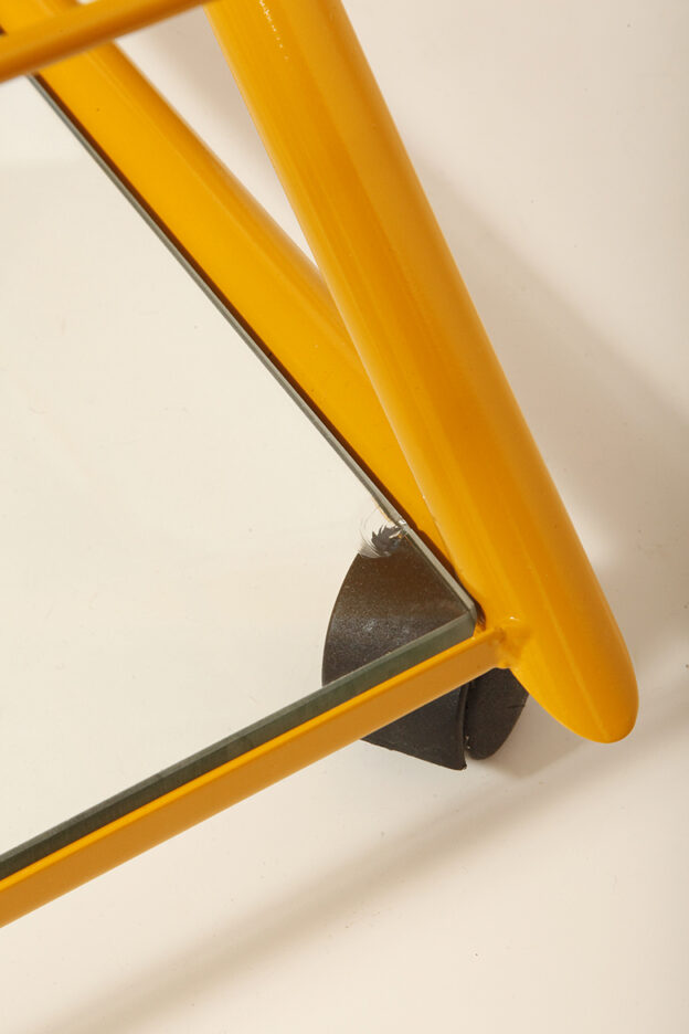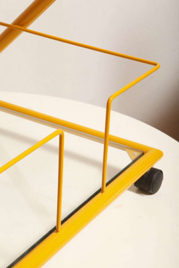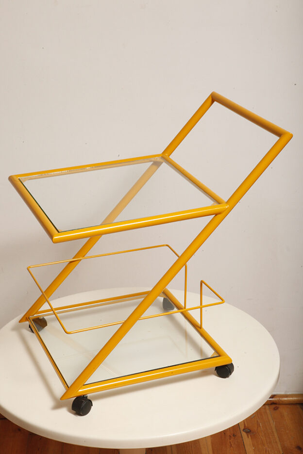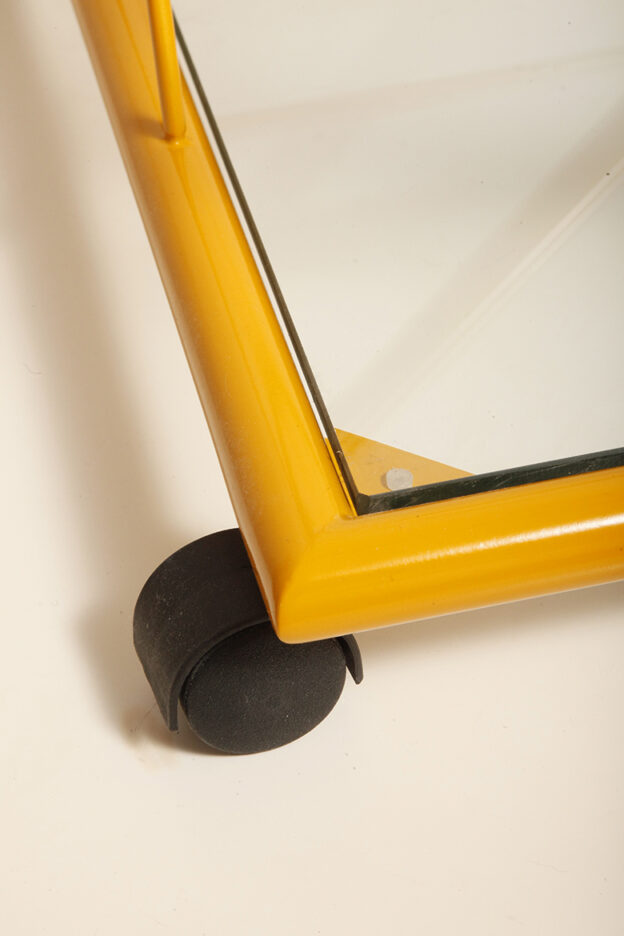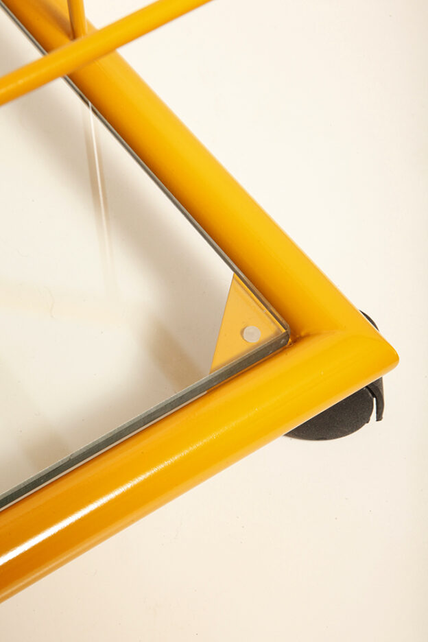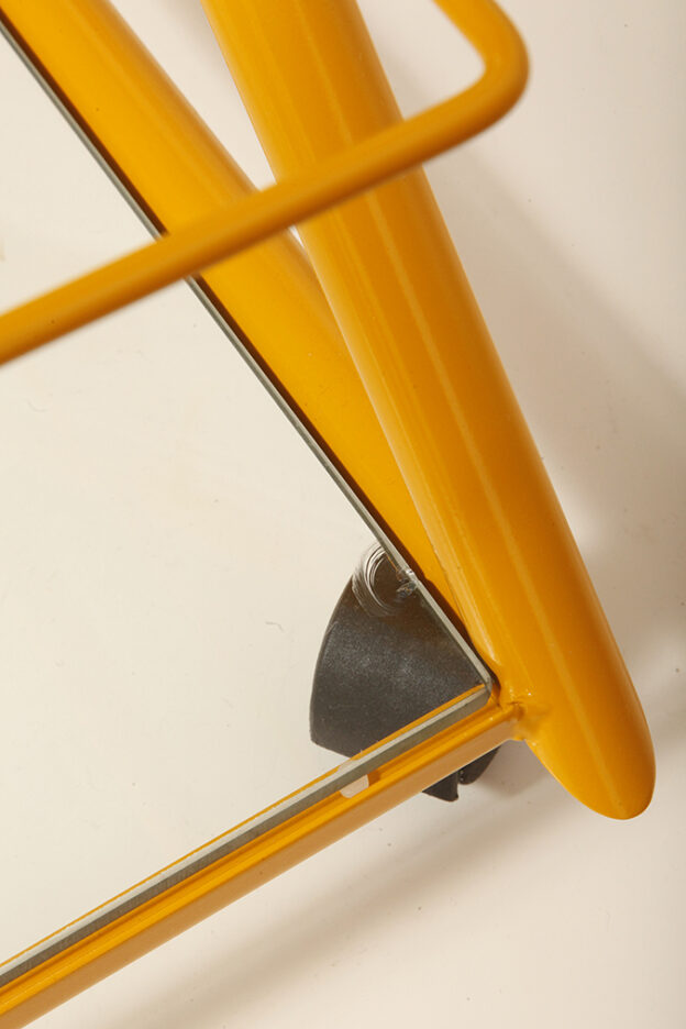 Konstrukcja jest przez nas całkowicie odnowiona / na nowo polakierowana w kolorze melonowym (odcień żółtego) stąd wygląda jak nówka sztuka. Jedynie szklane blaty noszą ślady użytkowania. Mam na myśli drobne użytkowe zarysowania (takie zawsze się znajdą w przedmiotach vintage) i jedno nieduże i niegroźne odpryśniecie w rogu dolnego blatu. Zrobiliśmy mu zdjęcia choć jest bardzo nieśmiały i niewiele go widać. Pomiędzy blatami poprowadzony jest sztywny pręt mający służyć do blokowania np. butelek z soczkami i mlekiem. Nie inaczej.