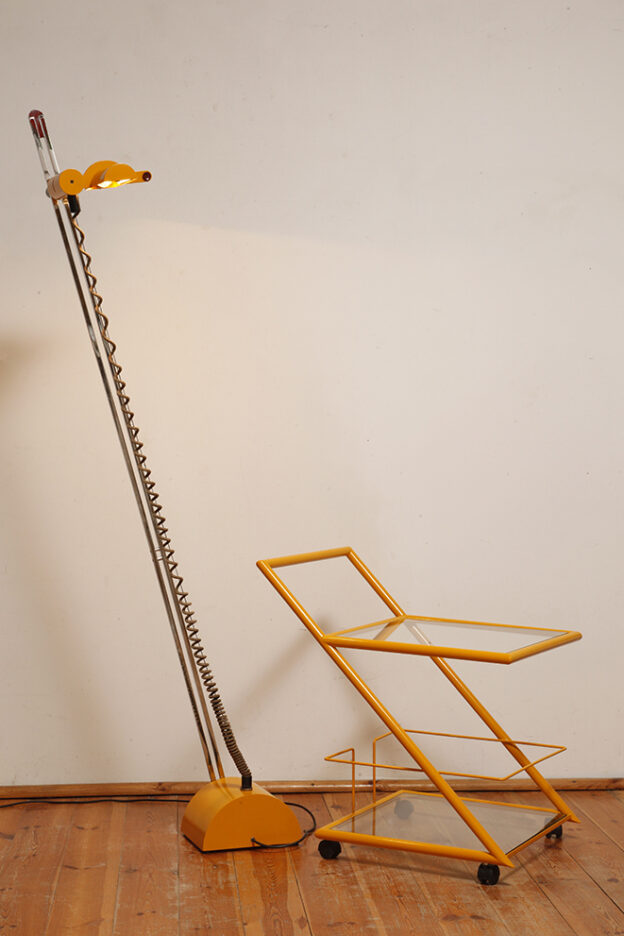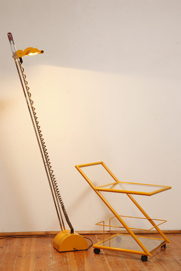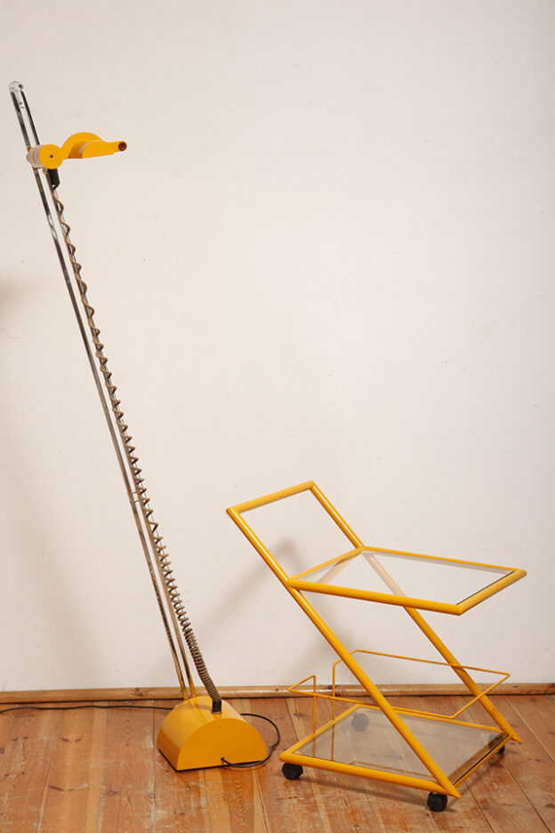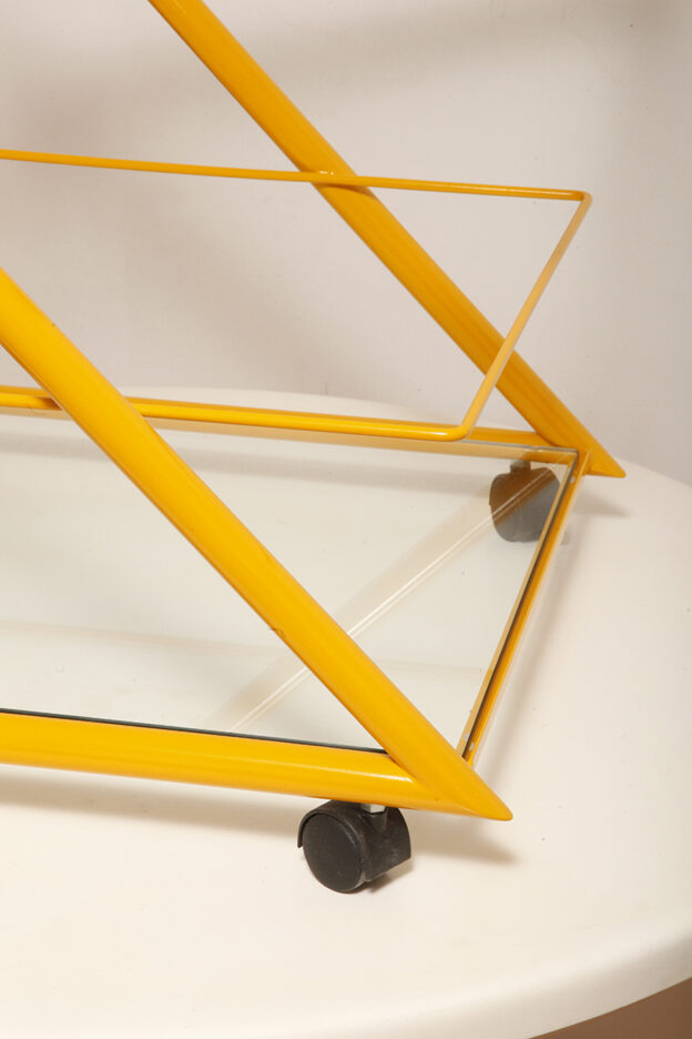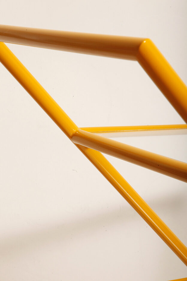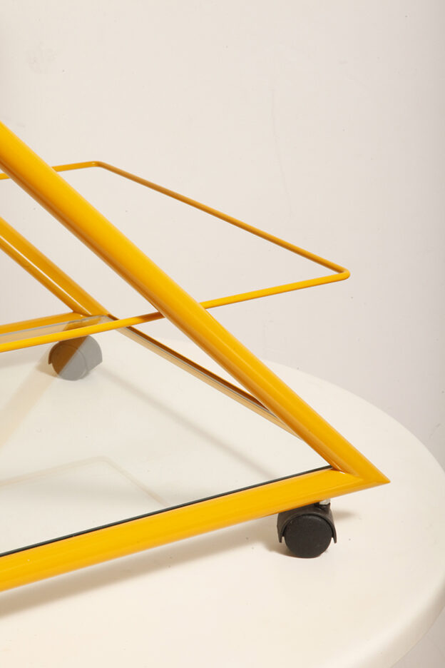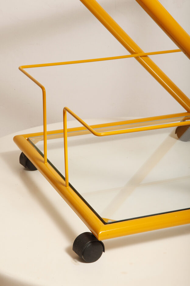 Konstrukcja jest przez nas całkowicie odnowiona / na nowo polakierowana w kolorze melonowym (odcień żółtego) stąd wygląda jak nówka sztuka. Jedynie szklane blaty noszą ślady użytkowania. Mam na myśli drobne użytkowe zarysowania (takie zawsze się znajdą w przedmiotach vintage) i jedno nieduże i niegroźne odpryśniecie w rogu dolnego blatu. Zrobiliśmy mu zdjęcia choć jest bardzo nieśmiały i niewiele go widać. Pomiędzy blatami poprowadzony jest sztywny pręt mający służyć do blokowania np. butelek z soczkami i mlekiem. Nie inaczej.