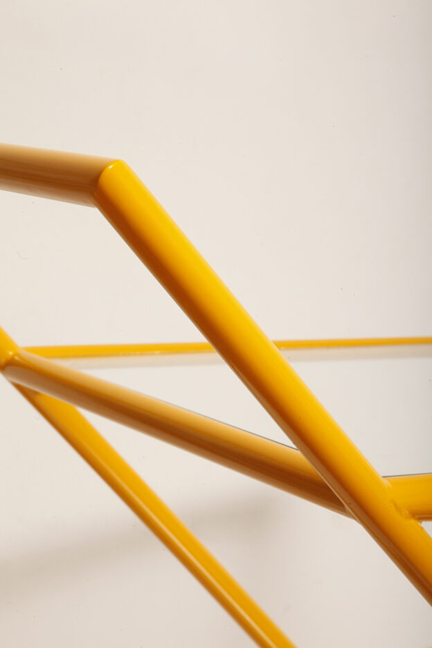 Sztywna kwadratowa konstrukcja z metalowych rurek o sporym przekroju z dwoma szklanymi blatami, a całość wpisana w literę „Z”.
