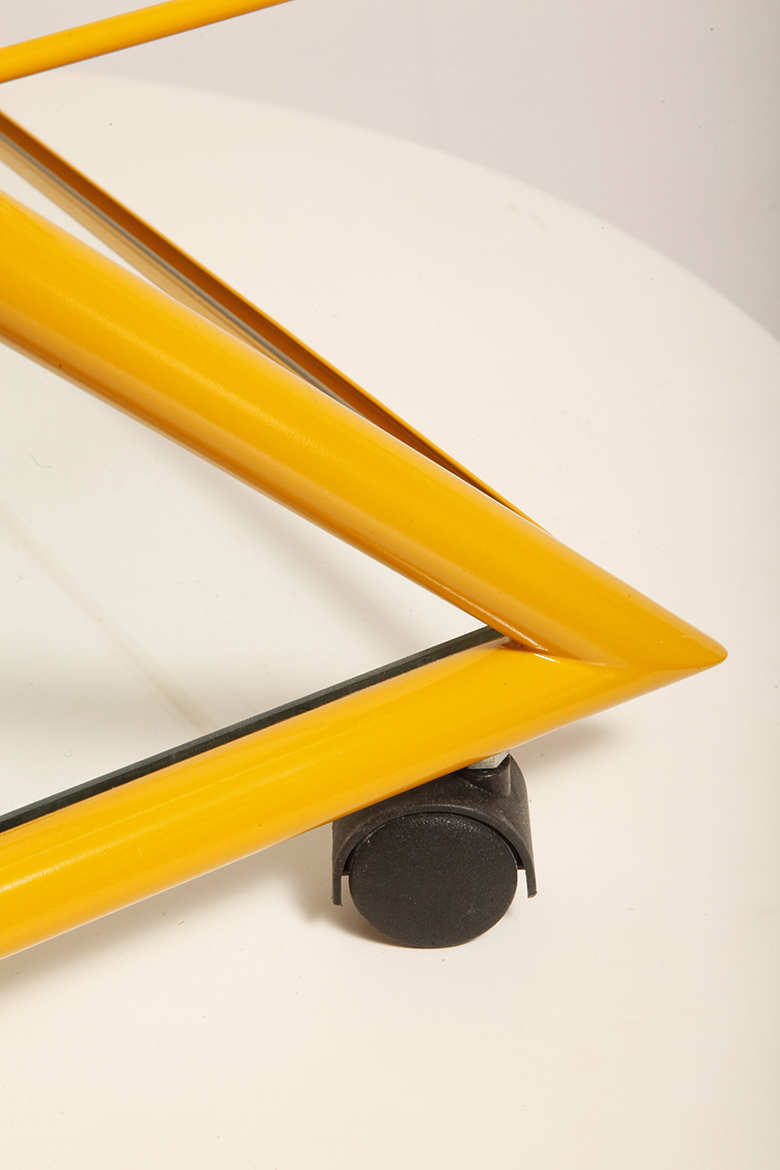 I znowu prostota jest siłą tego stolika. Wózek stosunkowo ciężki, szklane blaty są wkładane luzem w konstrukcję. Czyli są zamontowane grawitacyjnie. Gdyby nie odkryte onegdaj przyciąganie ziemskie mogłyby odfrunąć w siną dal. W rogach konstrukcji która je podtrzymuje zainstalowane są silikonowe dystanse które amortyzują i zabezpieczają szklane blaty na styku z zimnym i żółtym metalem.