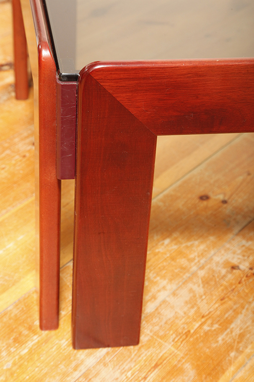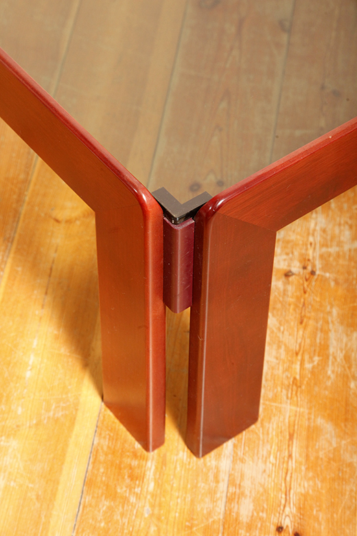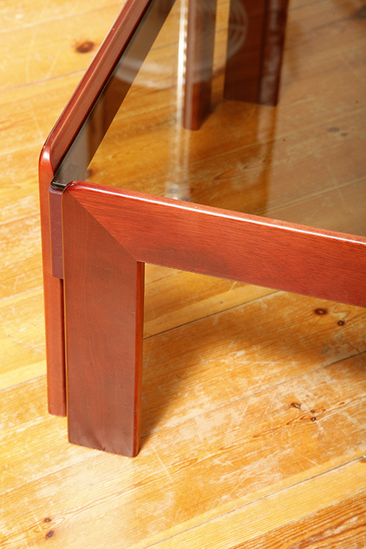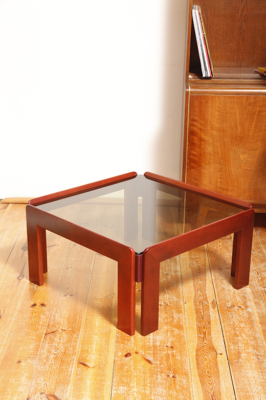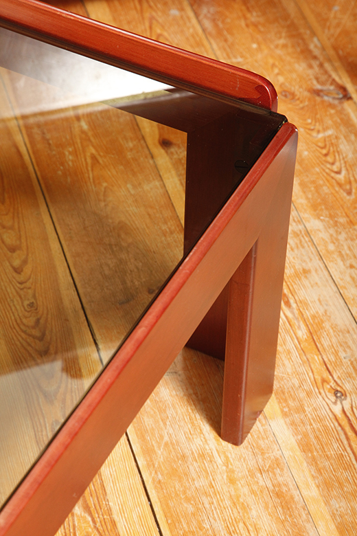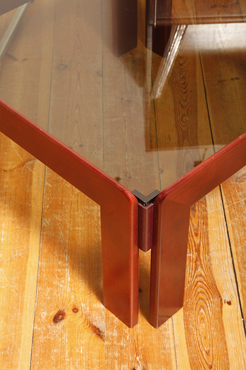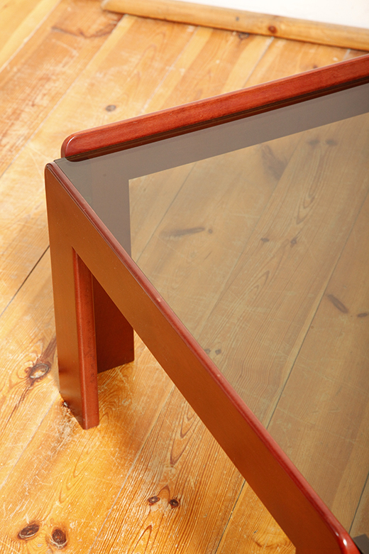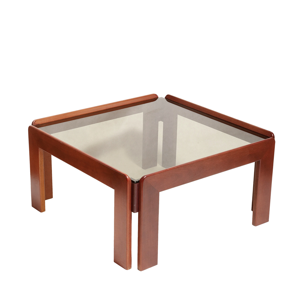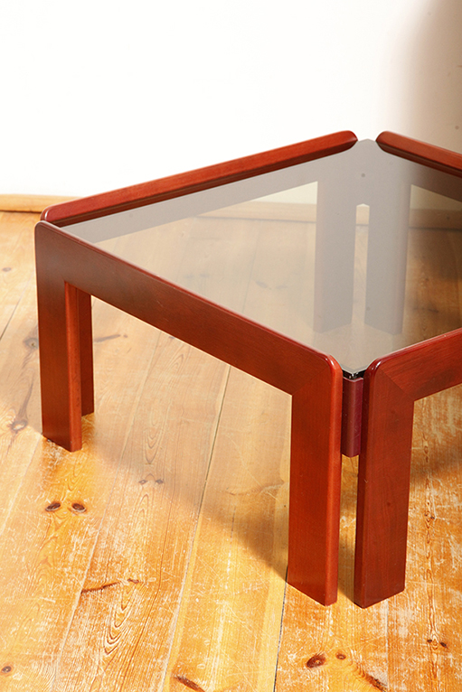Kwadratowy niski stolik kawowy/pomocnik/stolik boczny na drewnianej konstrukcji o lekkim wiśniowym zabarwieniu ze szklanym dymionym w ciepłym odcieniu grubym blatem, projekt Afra i Tobia Scarpa dla Cassina, Włochy, lata 60.