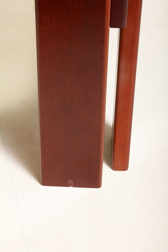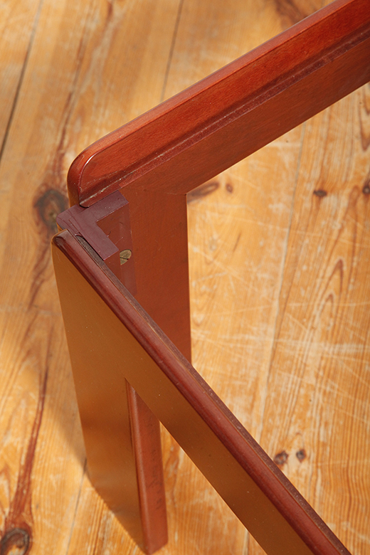 W pełni oryginalny i w bardzo dobrym stanie. Drewniana konstrukcja wykonana jest z pięknego ciemnego orzecha w delikatnym wiśniowym odcieni. Oryginalny gruby dymiony szklany blat w zielonkawym odcieniu z nikłymi kilkoma rysami użytkowymi trudnymi do pokazania więc ich nie pokazałem. Naprawdę trudno je znaleźć.