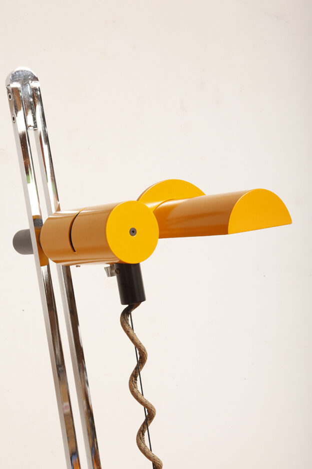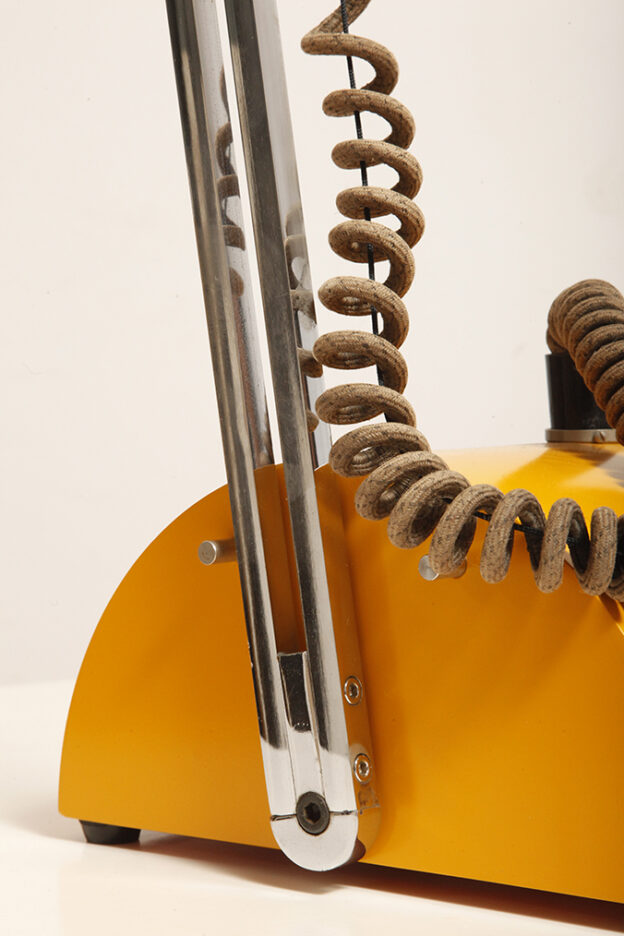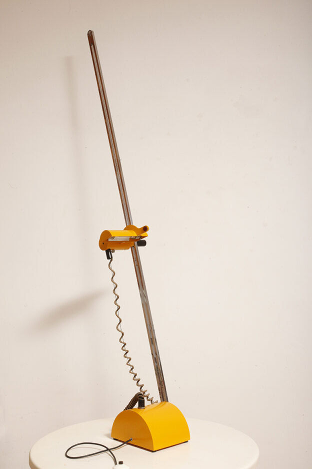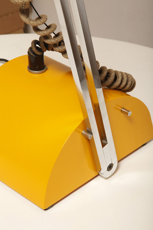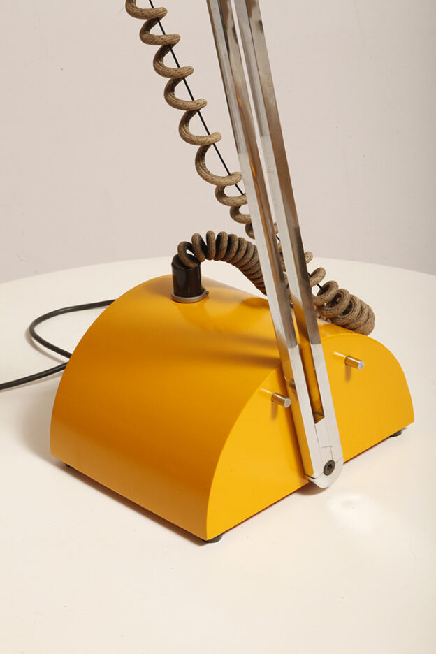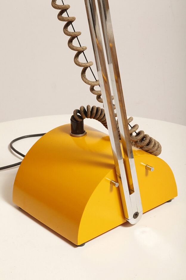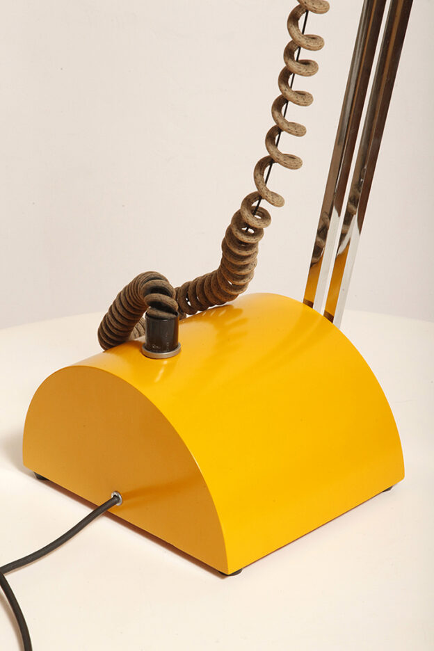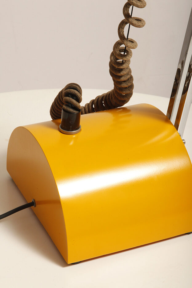Lampa jest w bardzo dobrym stanie bo przez nas na nowo polakierowana na kolor melonowy (żółty). Jedynie oryginalny zasilający klosz „kabel telefoniczny” nosi oznaki wieku. W końcu to lampa vinatage.