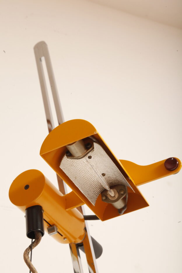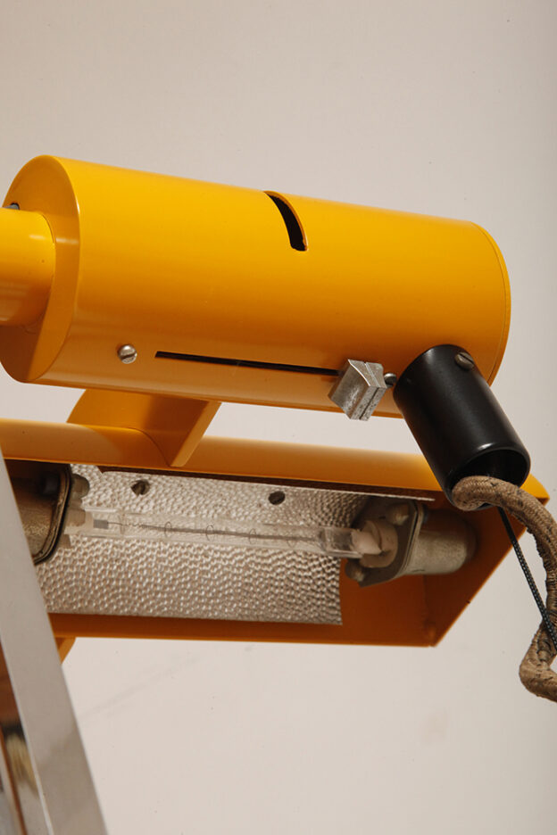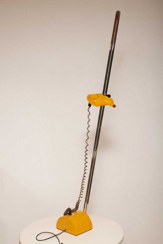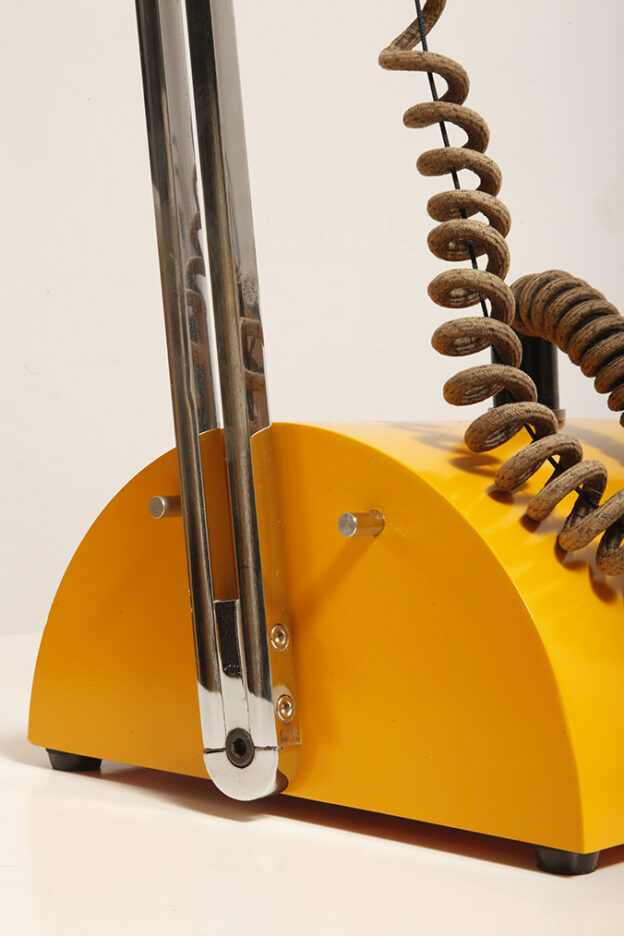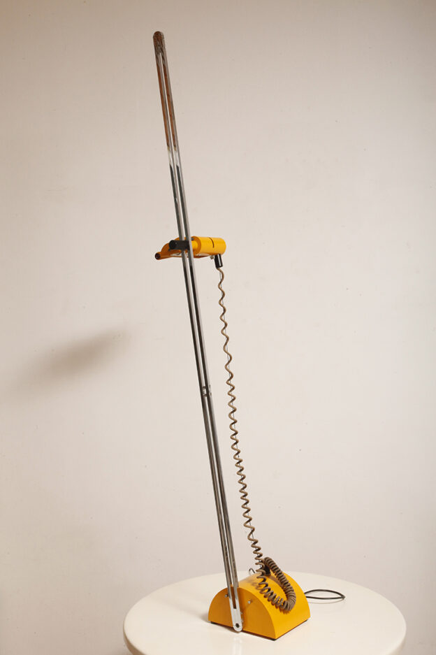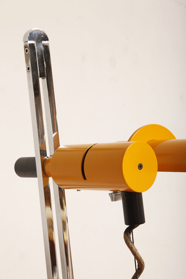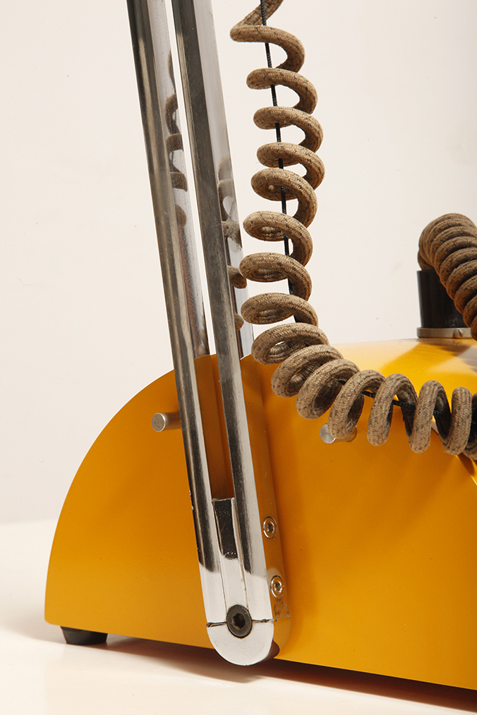 Lampa jest w bardzo dobrym stanie bo przez nas na nowo polakierowana na kolor melonowy (żółty). Jedynie oryginalny zasilający klosz „kabel telefoniczny” nosi oznaki wieku. W końcu to lampa vinatage.