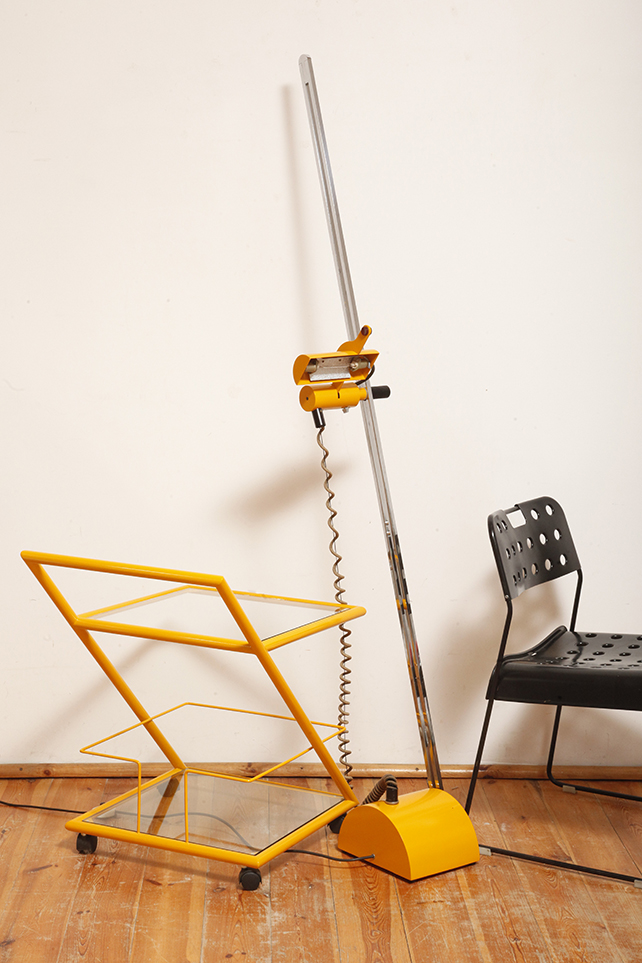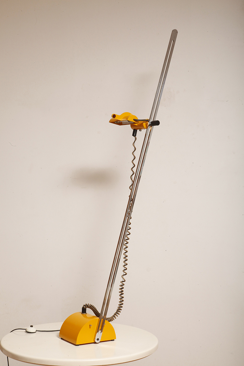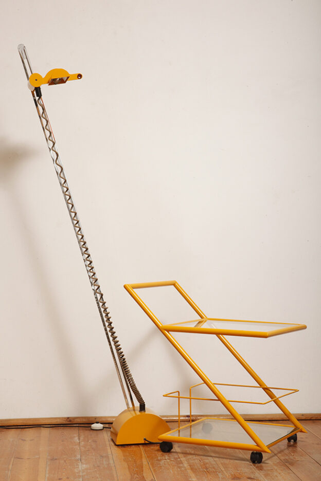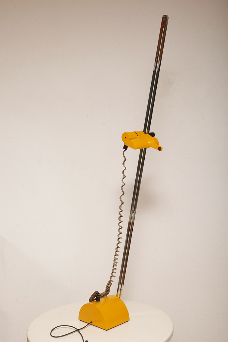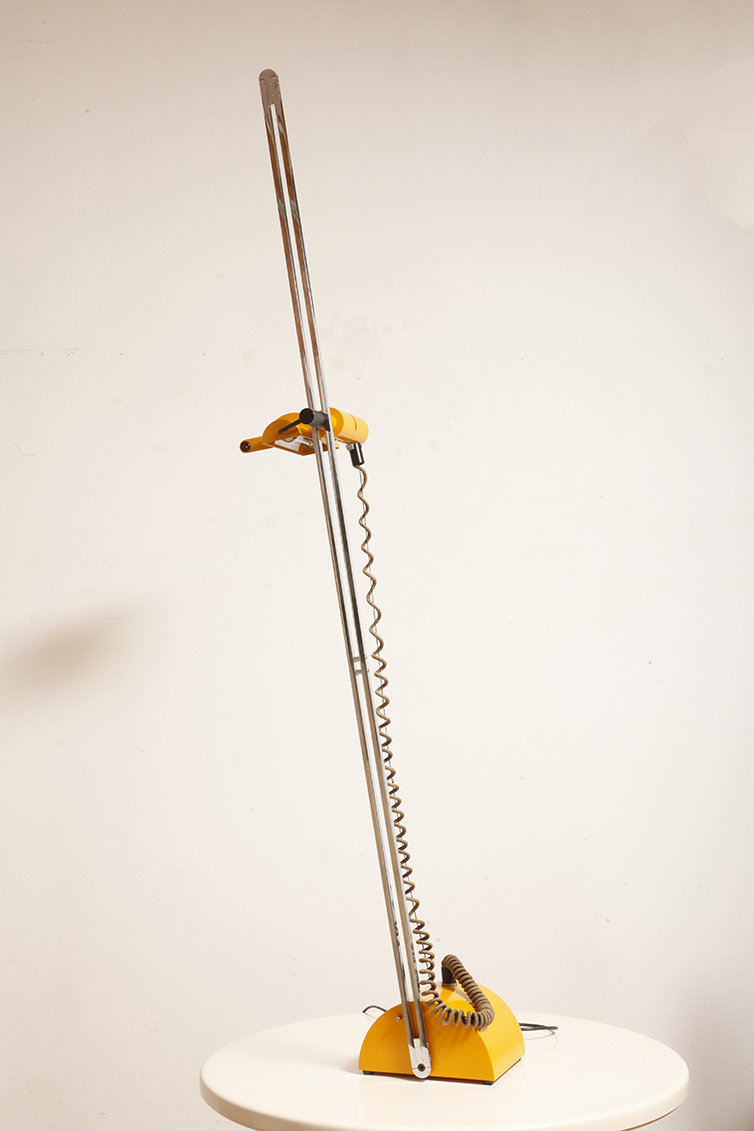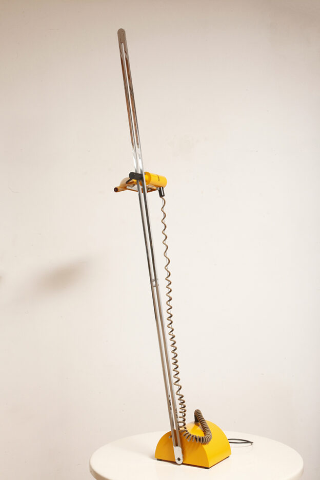 Lampa jest w bardzo dobrym stanie bo przez nas na nowo polakierowana na kolor melonowy (żółty). Jedynie oryginalny zasilający klosz „kabel telefoniczny” nosi oznaki wieku. W końcu to lampa vinatage.