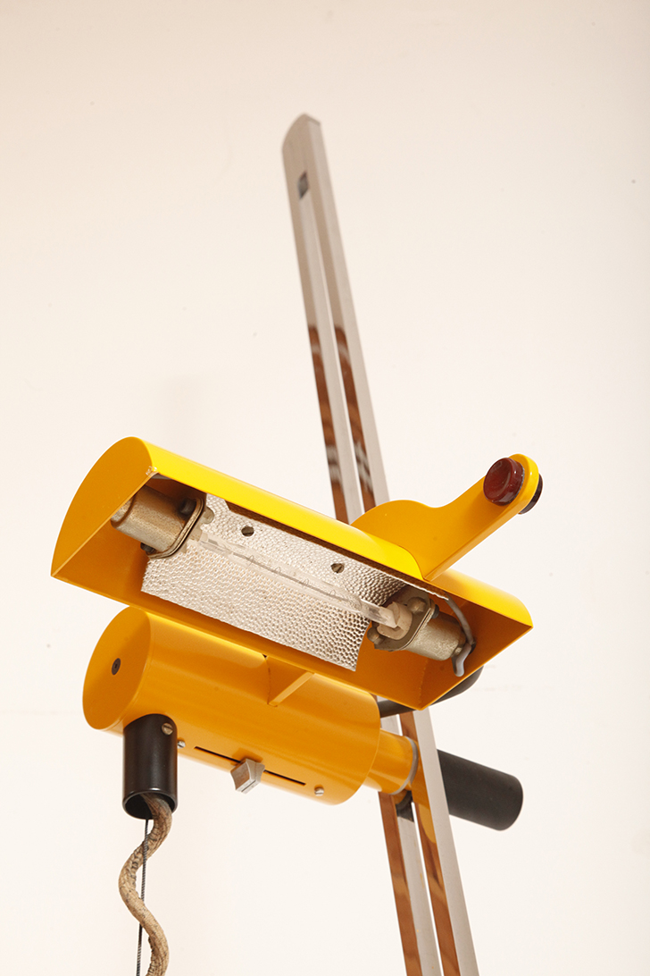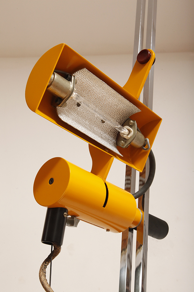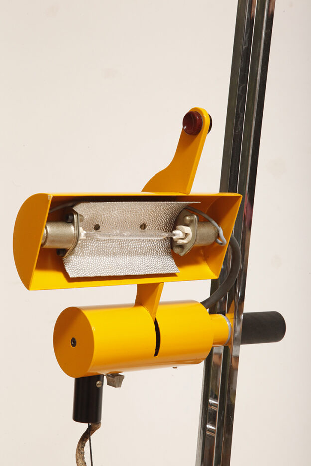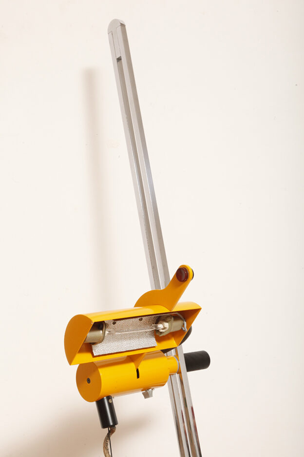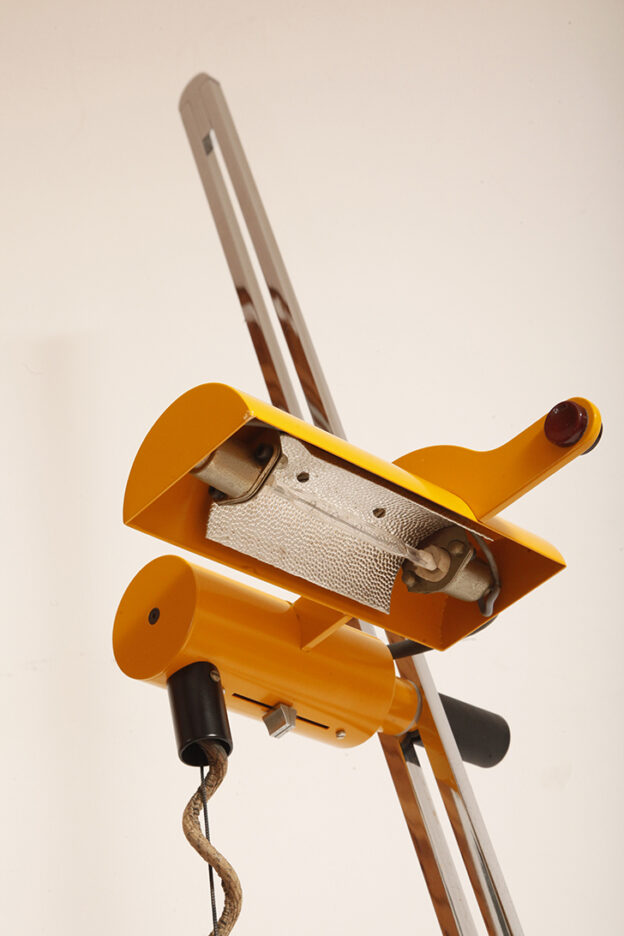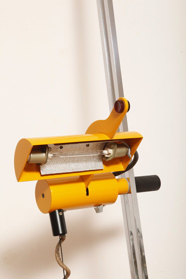 Nasza posiada metalową podstawę z chromowaną prowadnicą po której można przesuwać klosz zwalniając duże czarne pokrętło umieszczone po drugiej stronie klosza. Klosz można obracać o 90 stopni. Dzięki czemu lamp z powodzeniem może świecić do dołu jak i do góry.