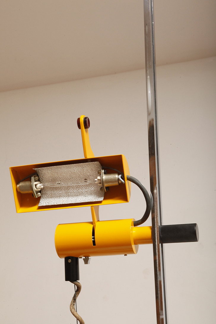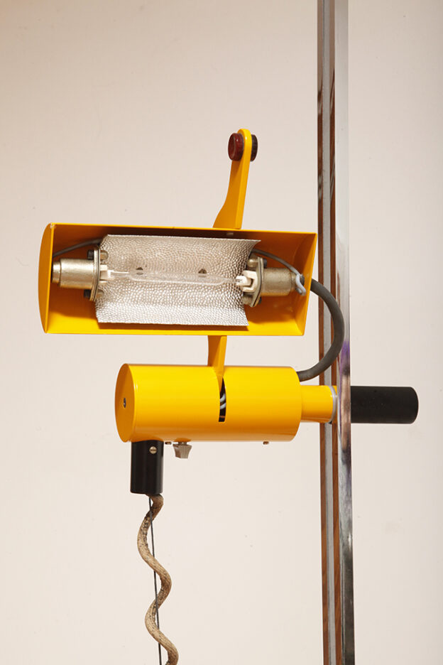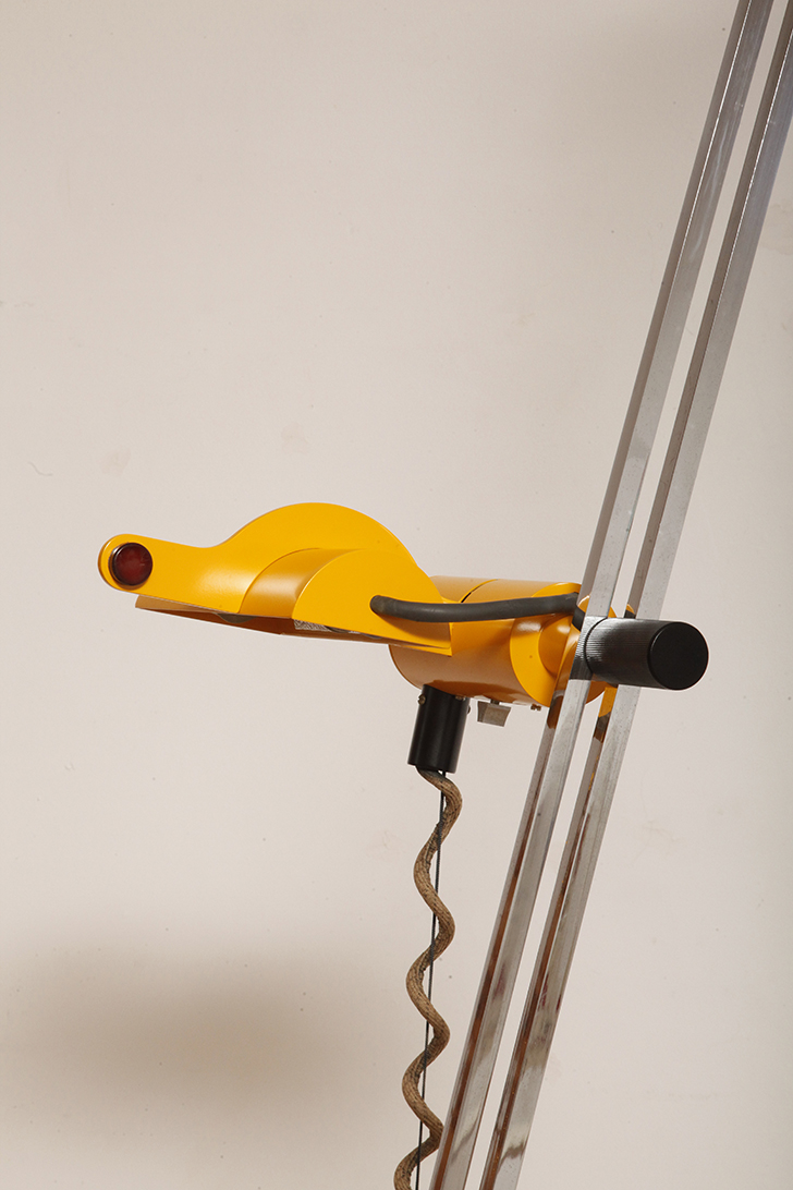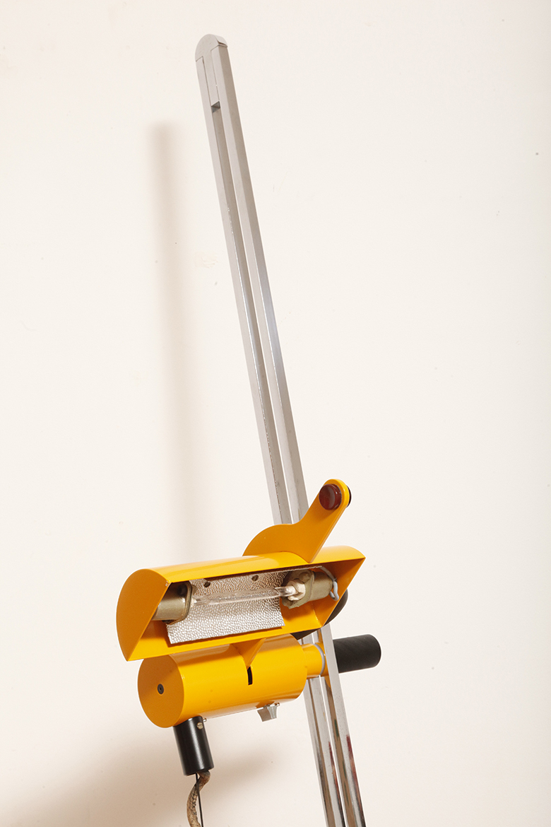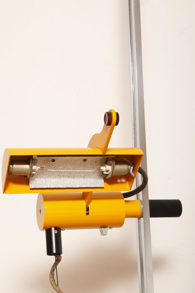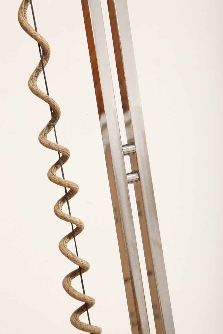 Nasza posiada metalową podstawę z chromowaną prowadnicą po której można przesuwać klosz zwalniając duże czarne pokrętło umieszczone po drugiej stronie klosza. Klosz można obracać o 90 stopni. Dzięki czemu lamp z powodzeniem może świecić do dołu jak i do góry.