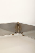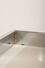 Chromowane powierzchnie w noszą znamiona zużycia w postaci punktowych mini kropek niewidocznych w codziennym użytkowaniu (zdjęcia), na blacie rysy użytkowe zgodne z wiekiem stolika, bez utrąceń, ukruszeń. Stolik prezentuje się znakomicie.