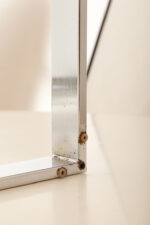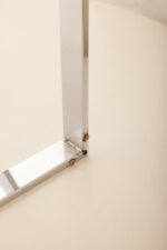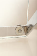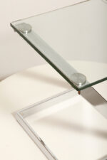 Masywny stolik boczny/pomocnik/stolik kawowy/nocny z lat 90. niemieckiej firmy Gebra z grubym szklanym blatem (10 mm) dzielnie wiszącym na chromowanym, metalowym ciężkim kątowniku.