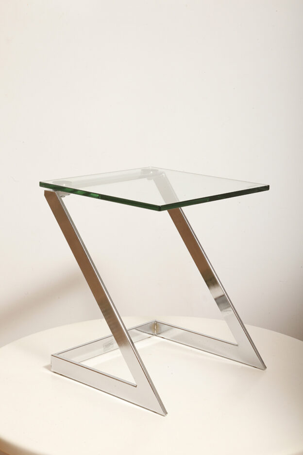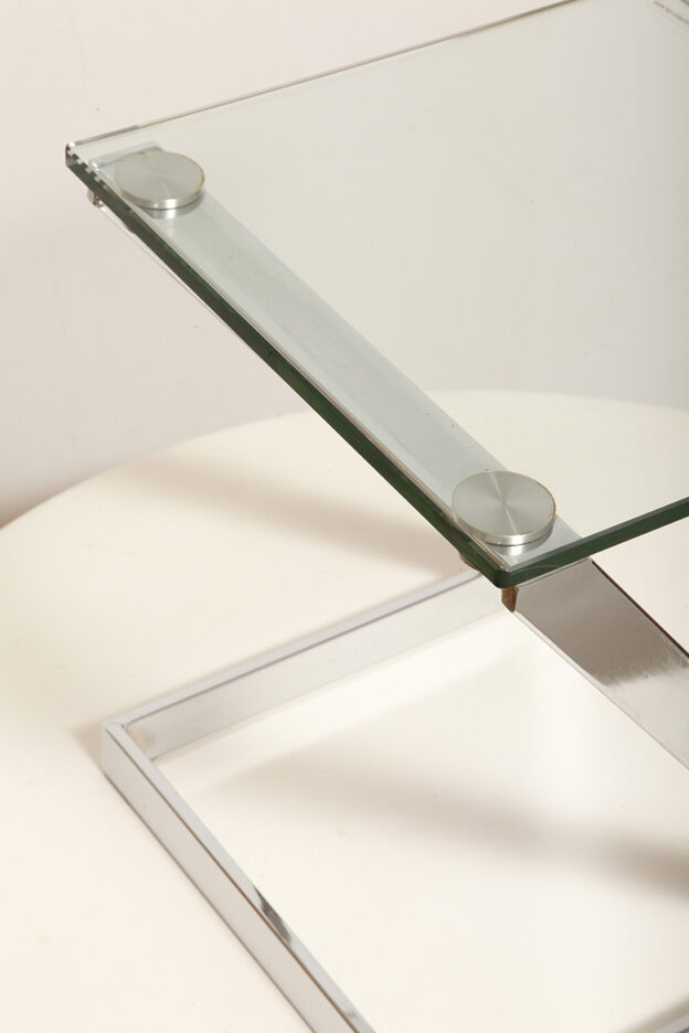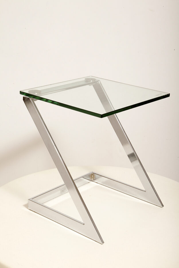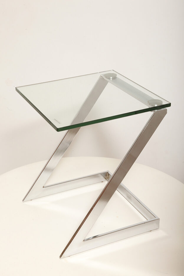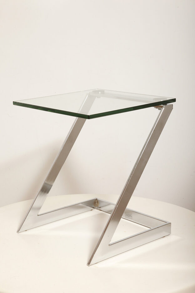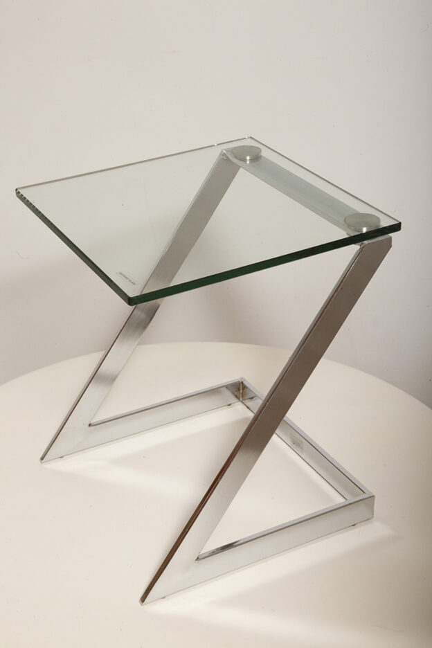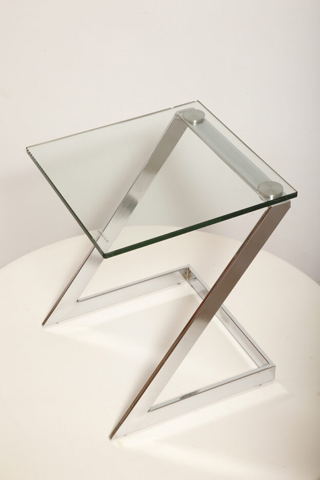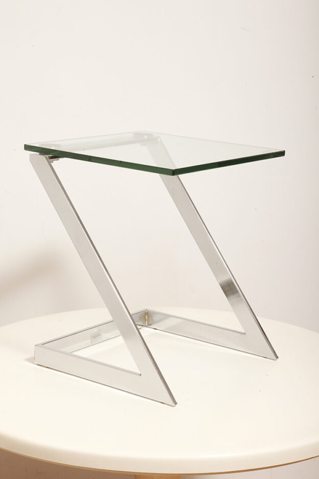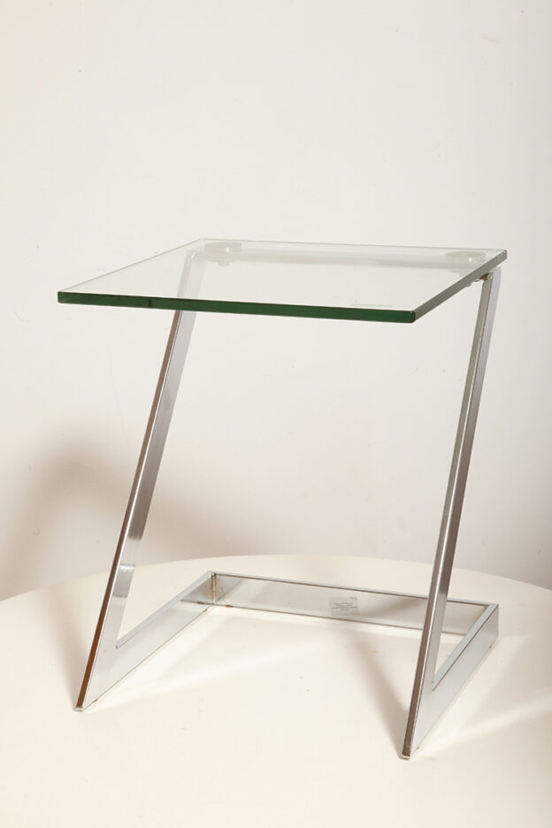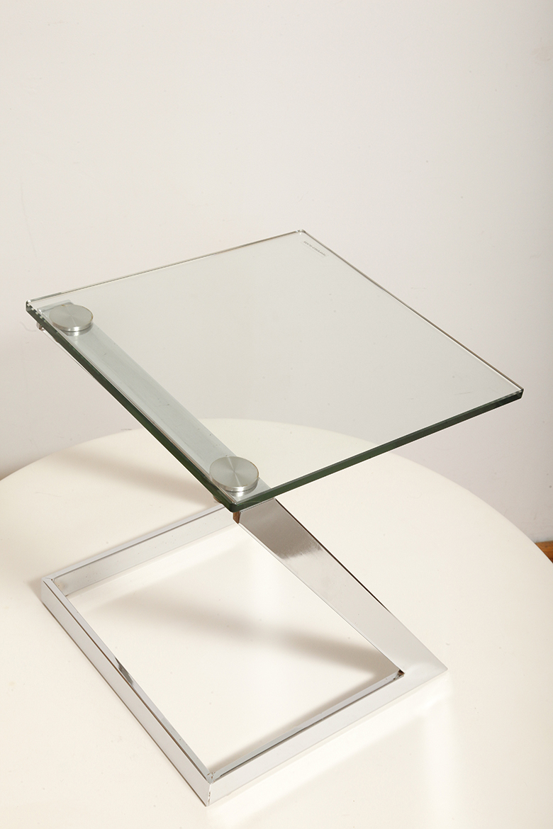 Masywny stolik boczny/pomocnik/stolik kawowy/stolik nocny z grubym blatem z hartowanego szkła na metalowych chromowanych profilach w kształcie litery „Z”, Gebra, Niemcy, lata 90.