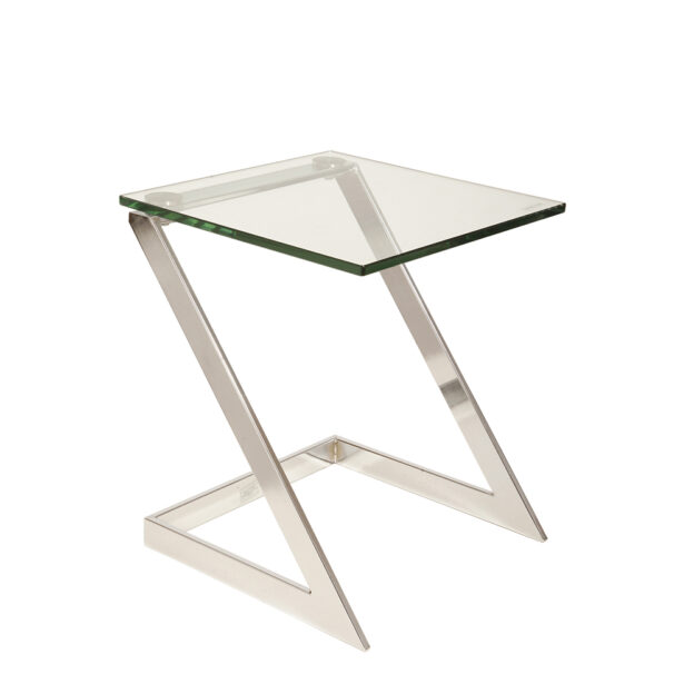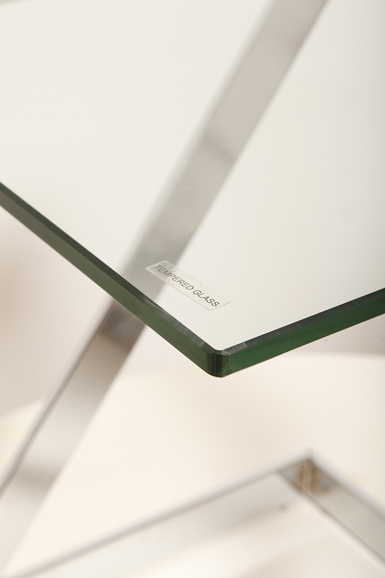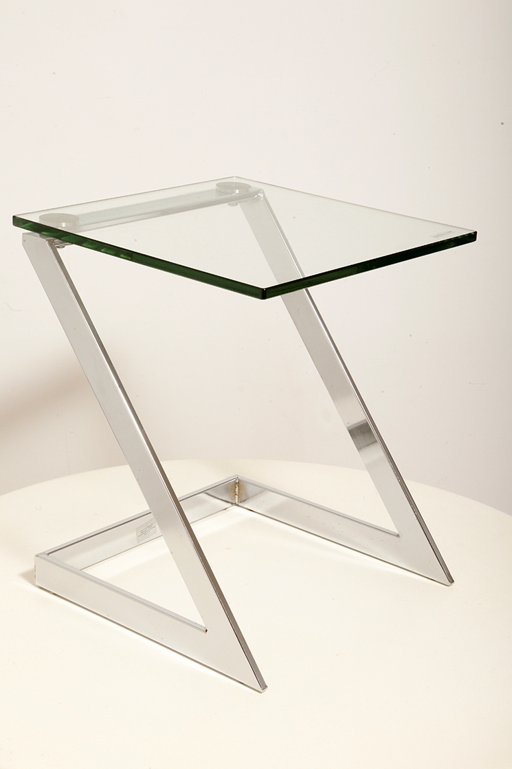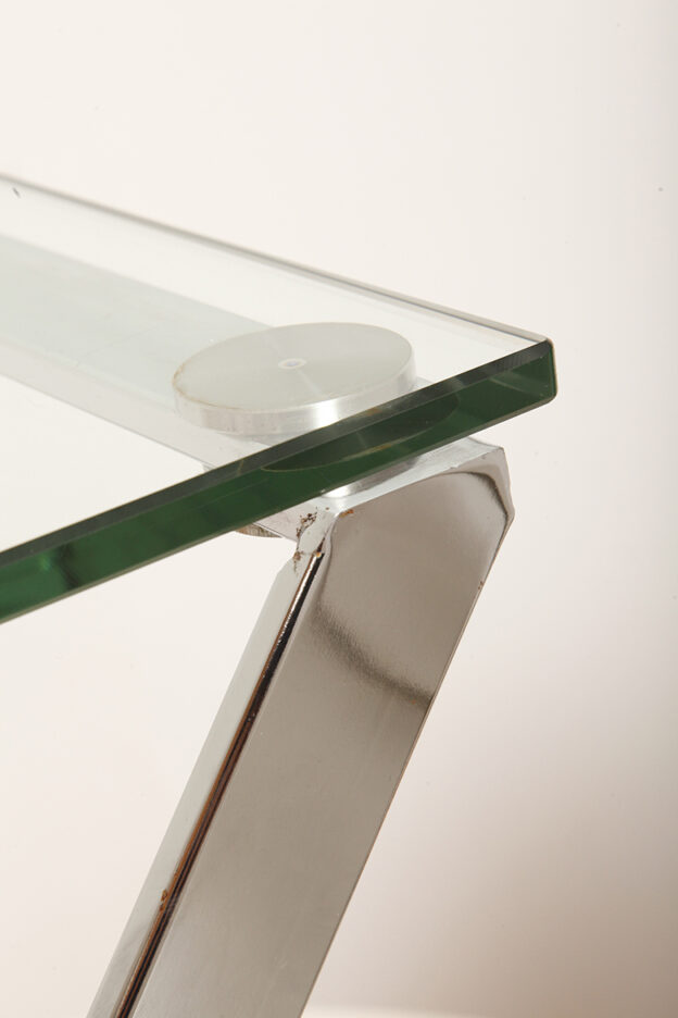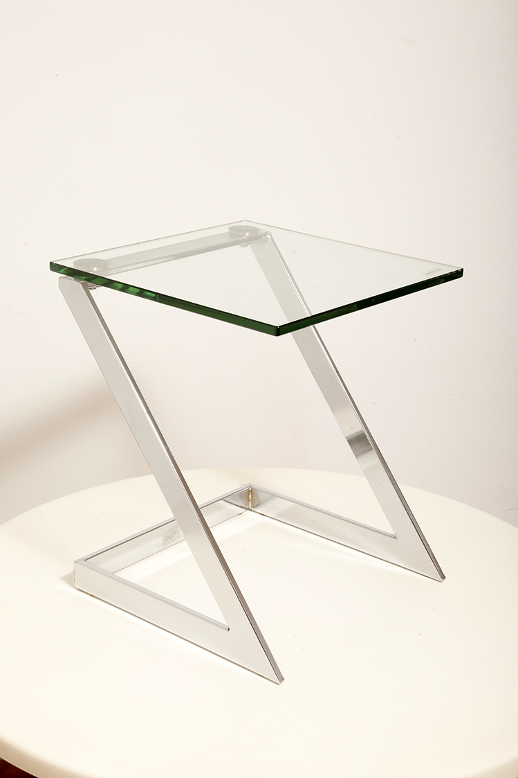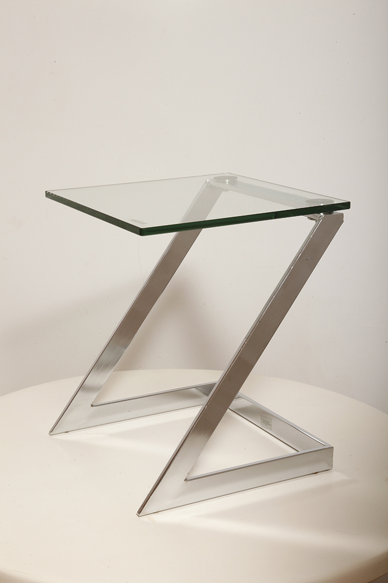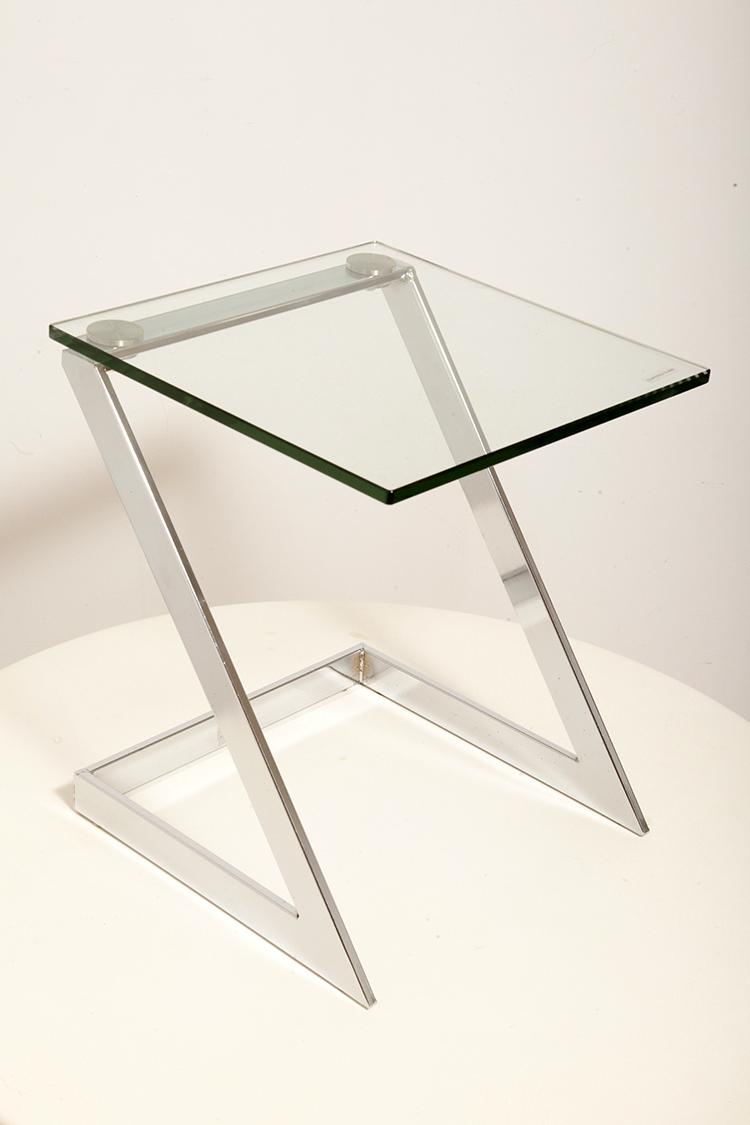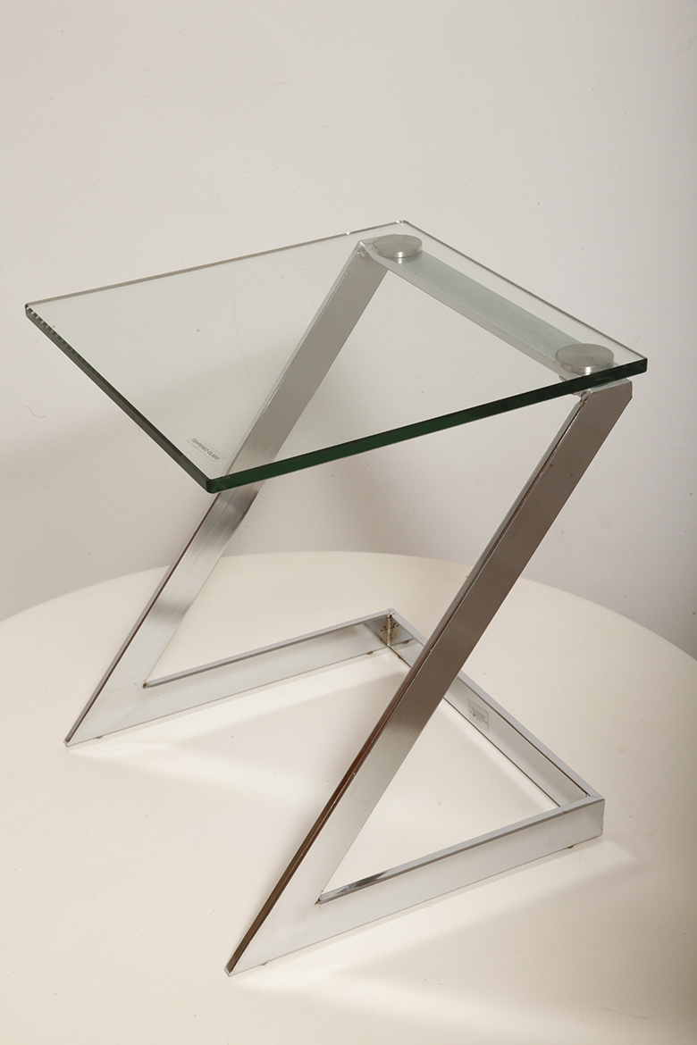 Masywny stolik boczny/pomocnik/stolik kawowy/stolik nocny z grubym blatem z hartowanego szkła na metalowych chromowanych profilach w kształcie litery „Z”, Gebra, Niemcy, lata 90.