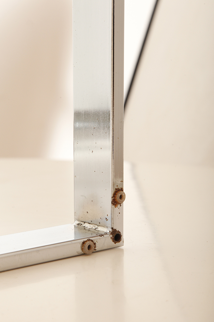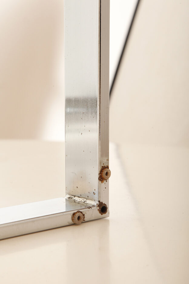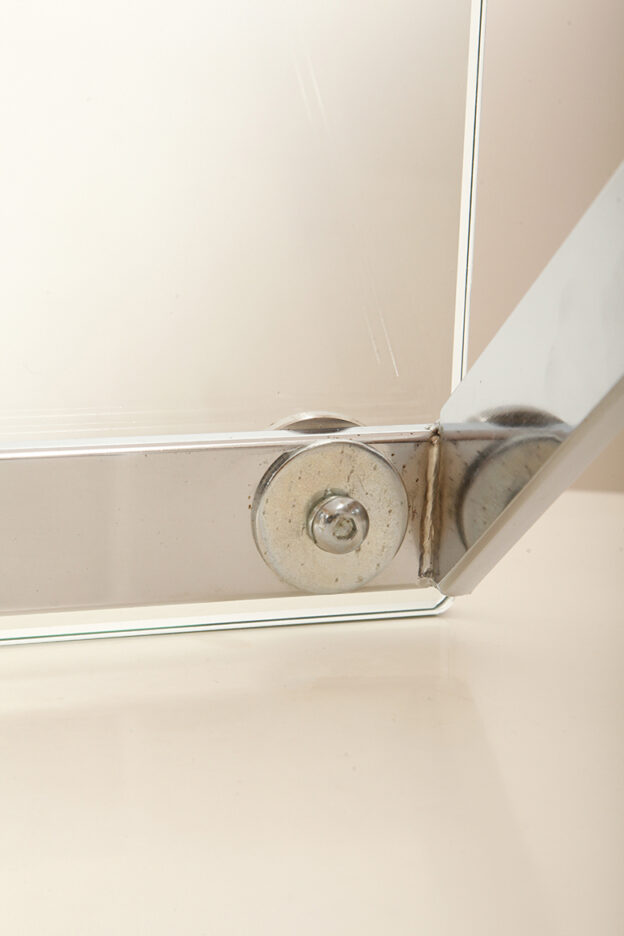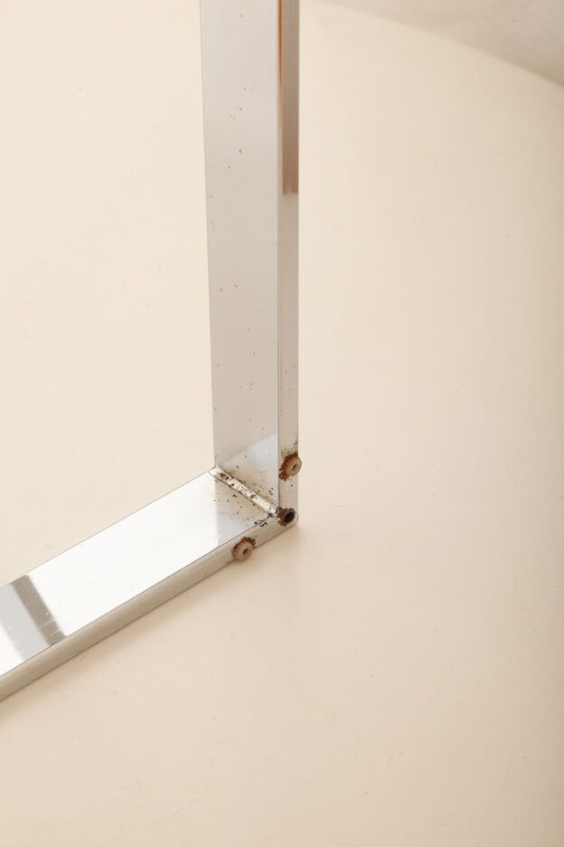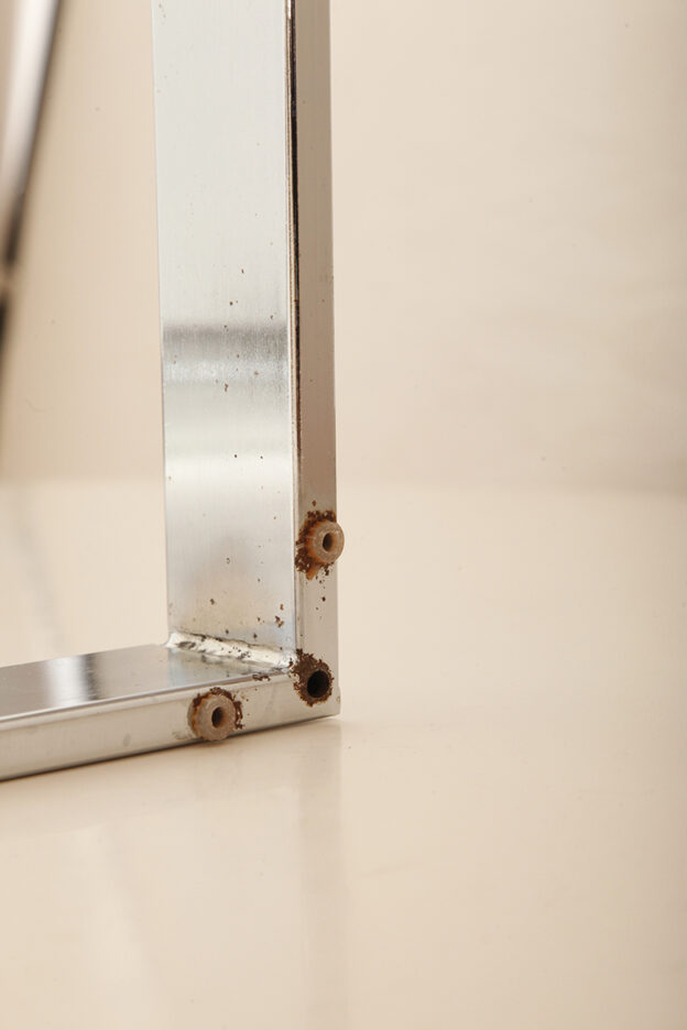 Chromowane powierzchnie w noszą znamiona zużycia w postaci punktowych mini kropek niewidocznych w codziennym użytkowaniu (zdjęcia), na blacie rysy użytkowe zgodne z wiekiem stolika, bez utrąceń, ukruszeń. Stolik prezentuje się znakomicie.