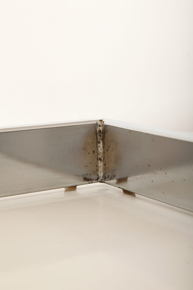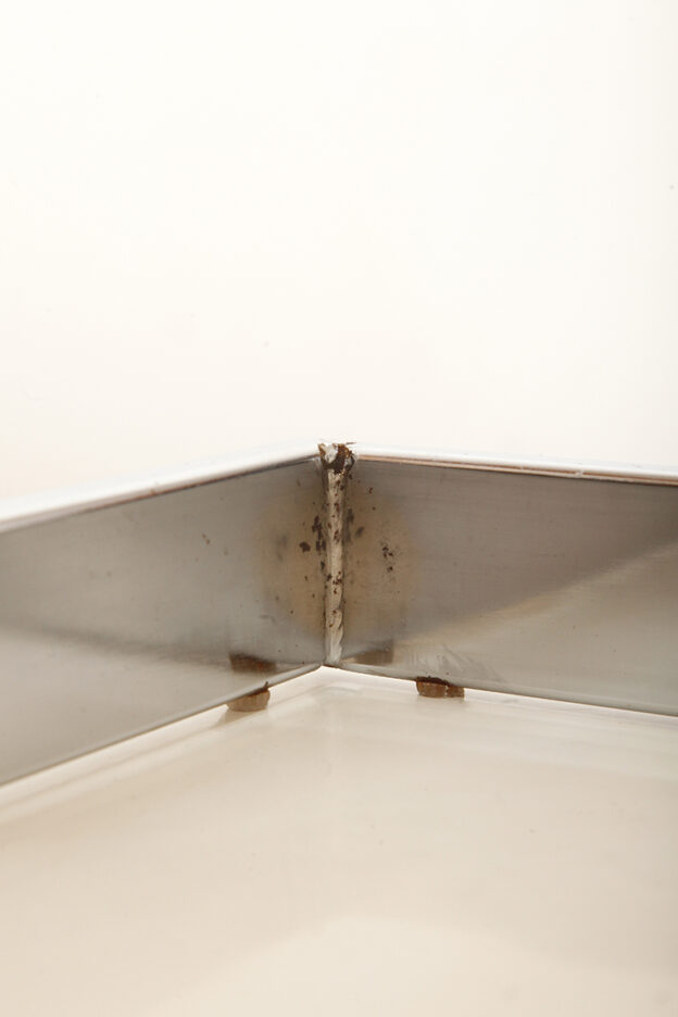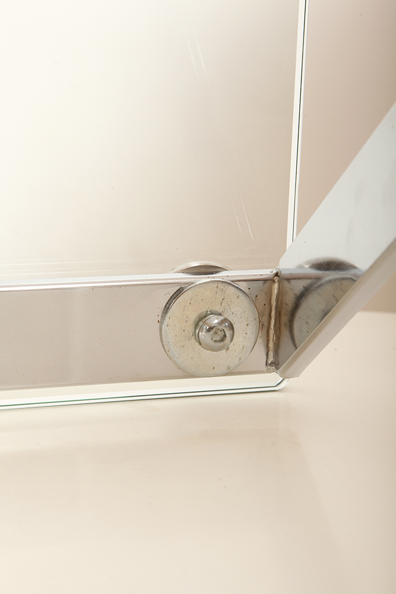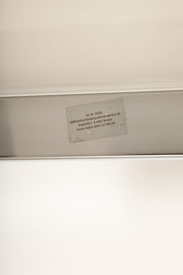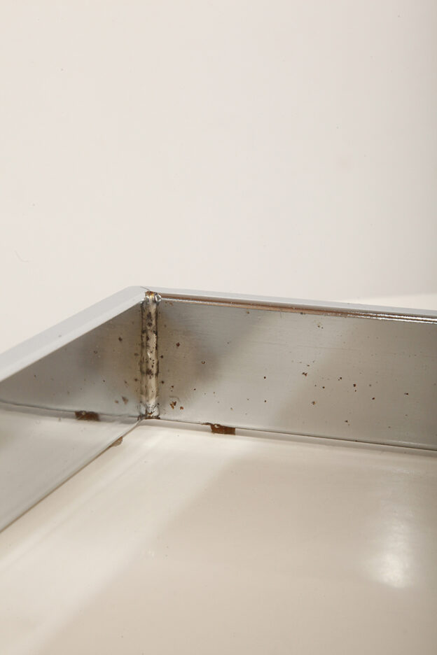 Chromowane powierzchnie w noszą znamiona zużycia w postaci punktowych mini kropek niewidocznych w codziennym użytkowaniu (zdjęcia), na blacie rysy użytkowe zgodne z wiekiem stolika, bez utrąceń, ukruszeń. Stolik prezentuje się znakomicie.