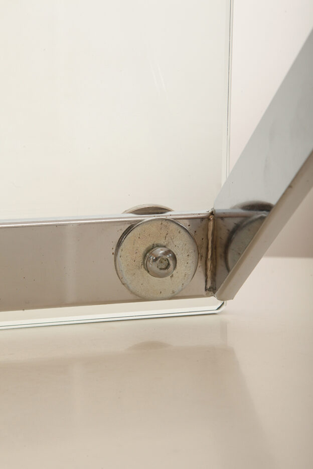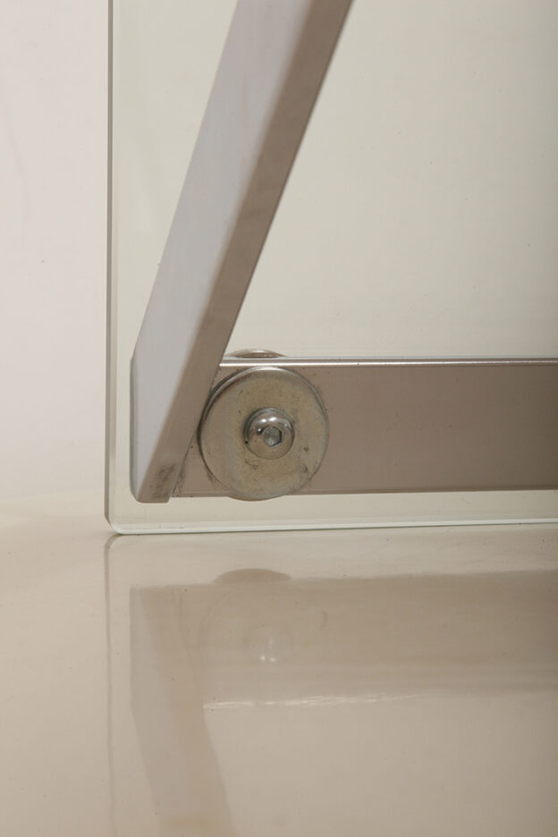 Masywny stolik boczny/pomocnik/stolik kawowy/nocny z lat 90. niemieckiej firmy Gebra z grubym szklanym blatem (10 mm) dzielnie wiszącym na chromowanym, metalowym ciężkim kątowniku.