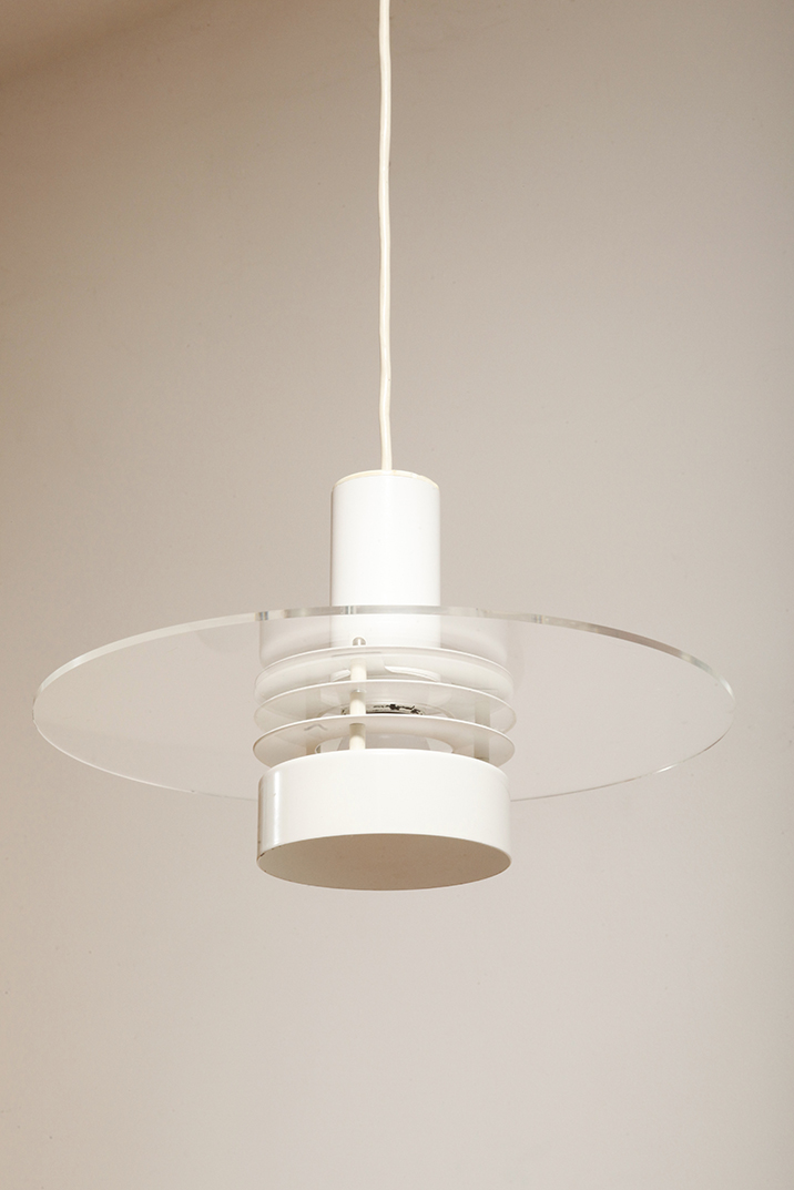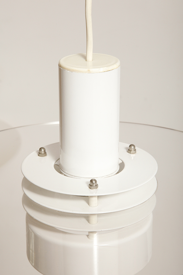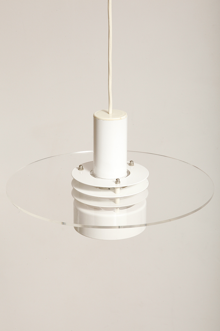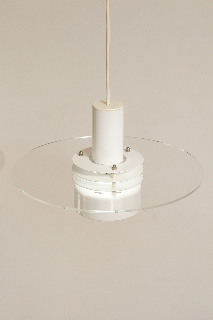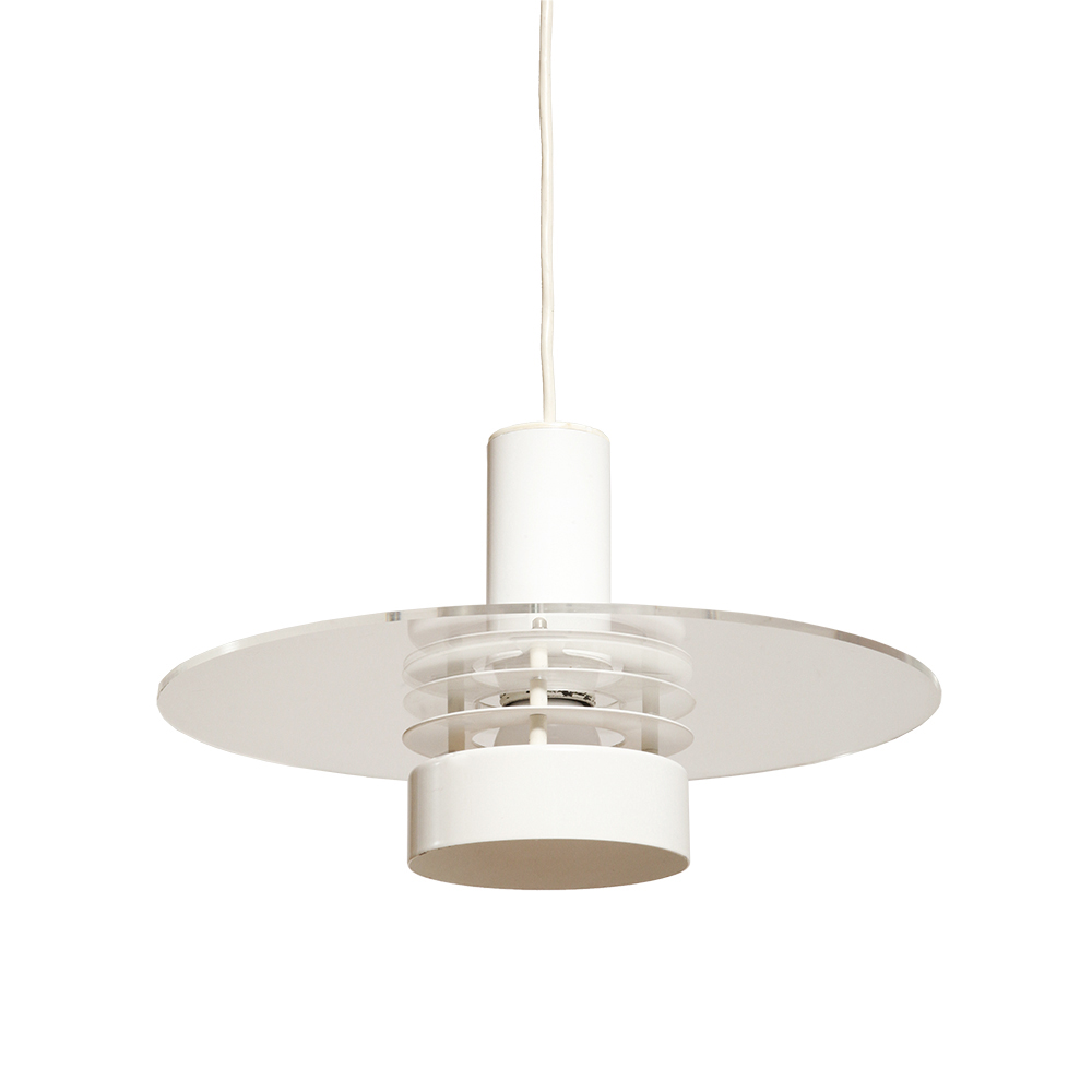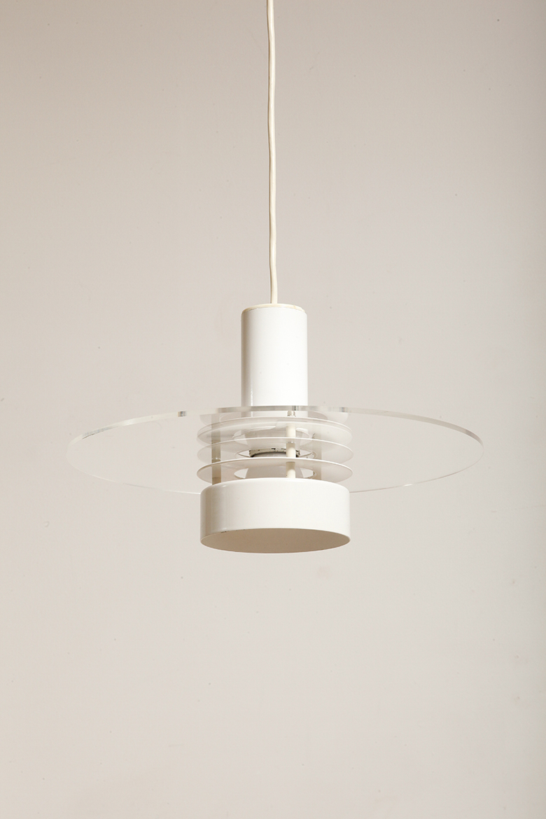 Metalowa jednopunktowa biała lampa wisząca/sufitowa z przeźroczystym okręgiem z pleksiglasu, HORN, typ 740, Dania, lata 70/80.