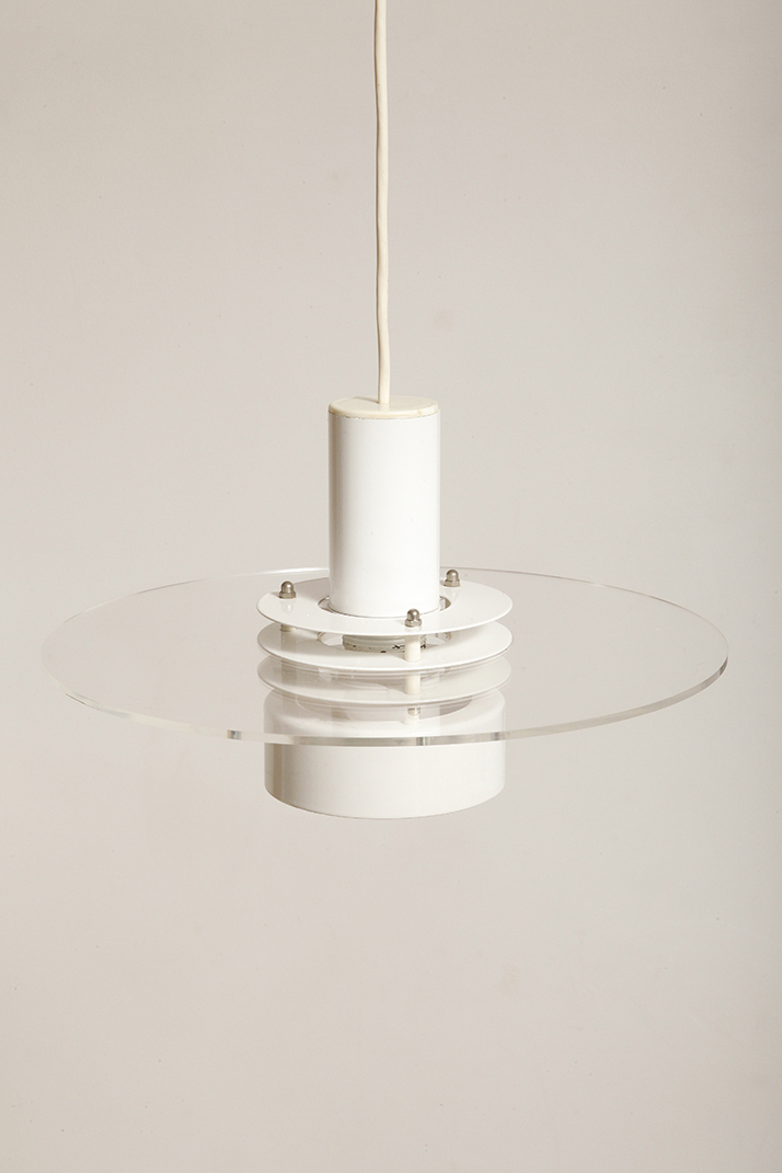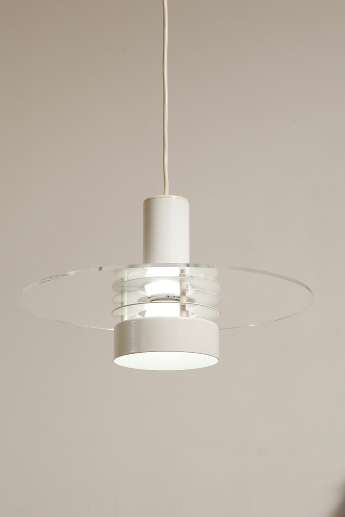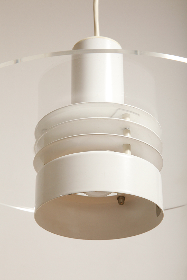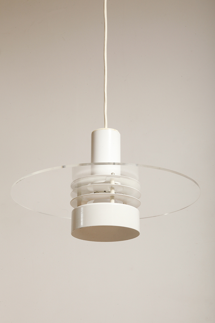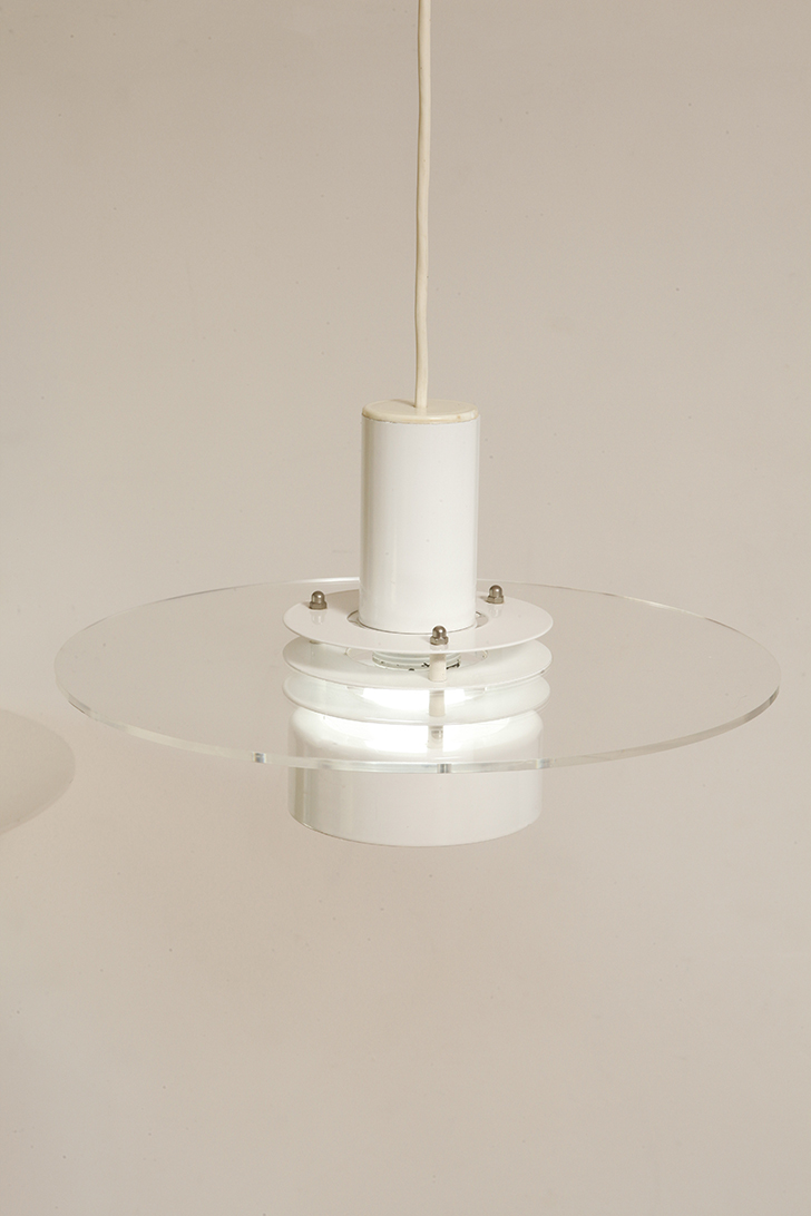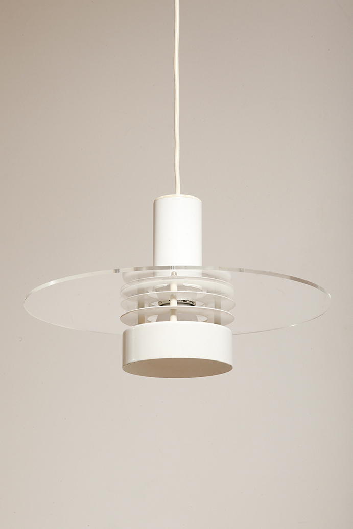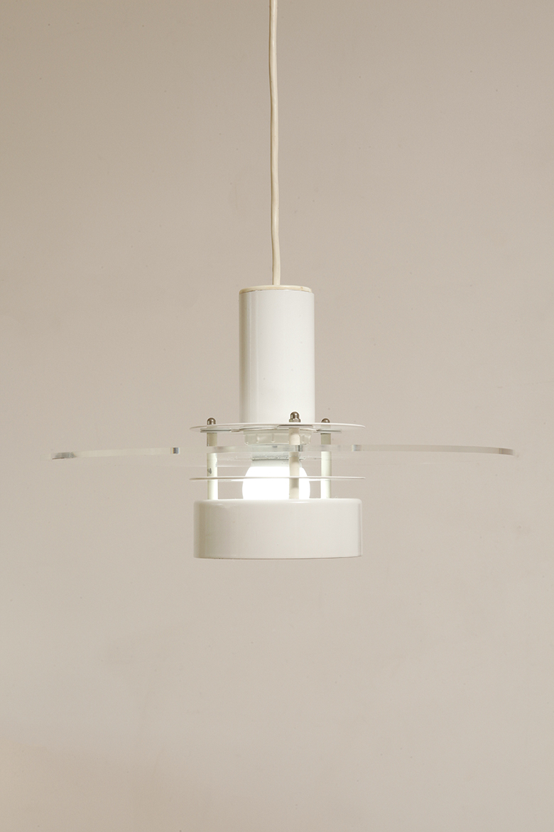 Metalowa jednopunktowa biała lampa wisząca/sufitowa z przeźroczystym okręgiem z pleksiglasu, HORN, typ 740, Dania, lata 70/80.