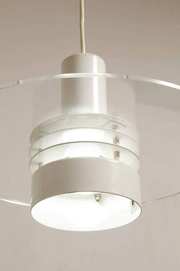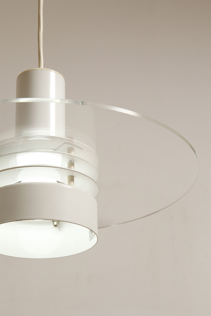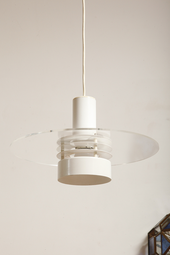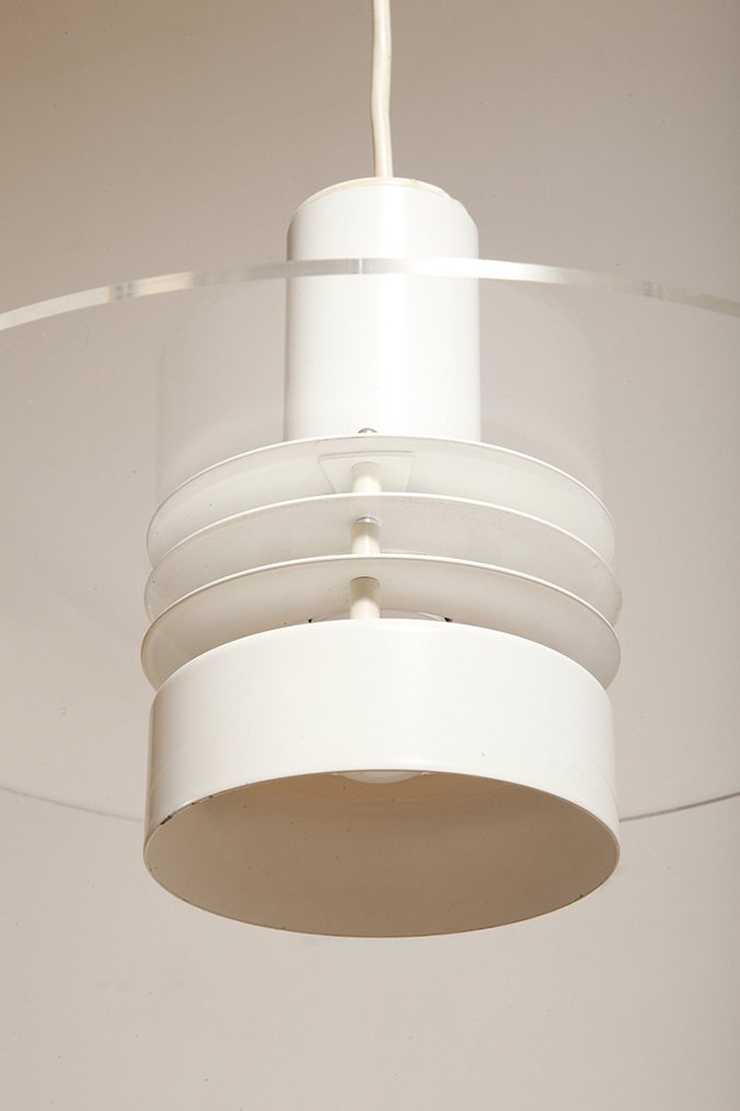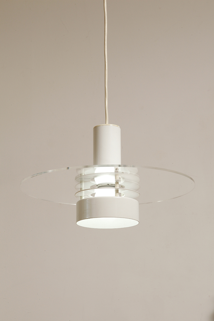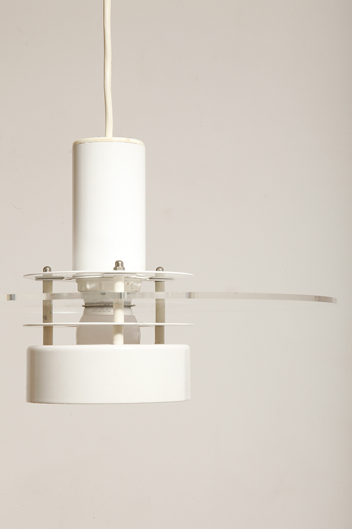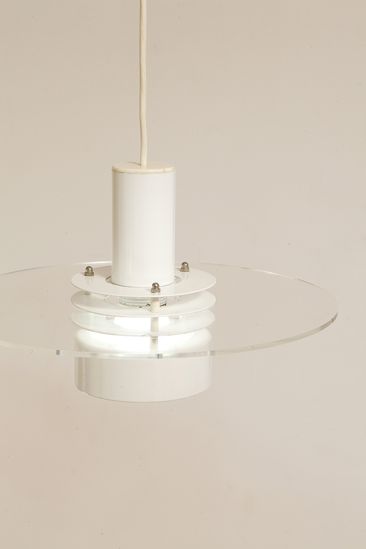 Metalowa jednopunktowa biała lampa wisząca/sufitowa z przeźroczystym okręgiem z pleksiglasu, HORN, typ 740, Dania, lata 70/80.