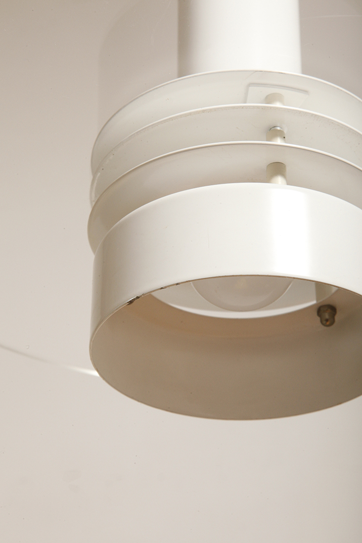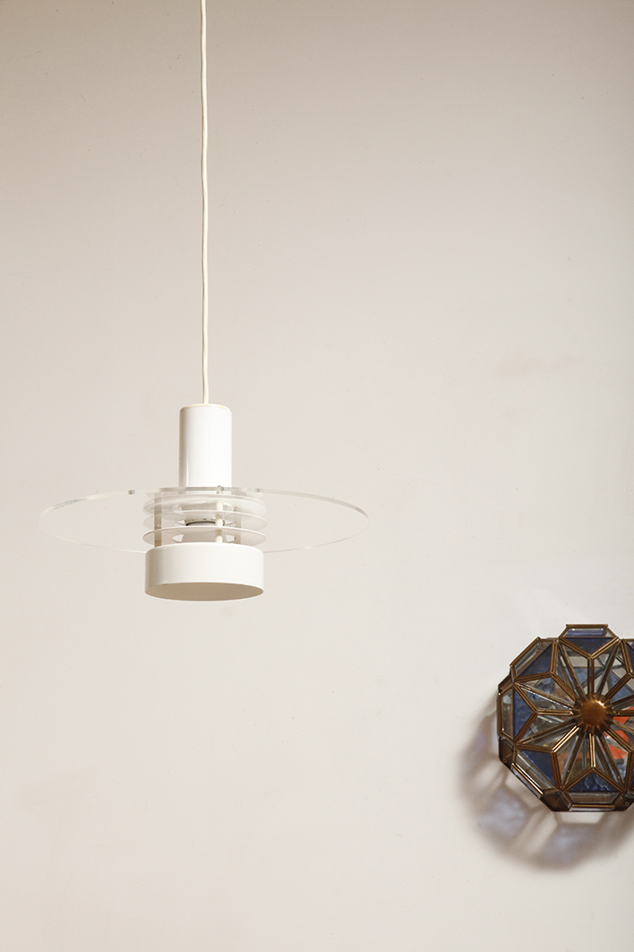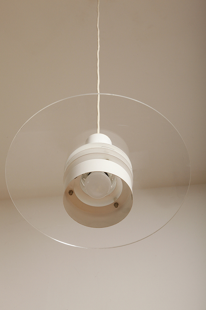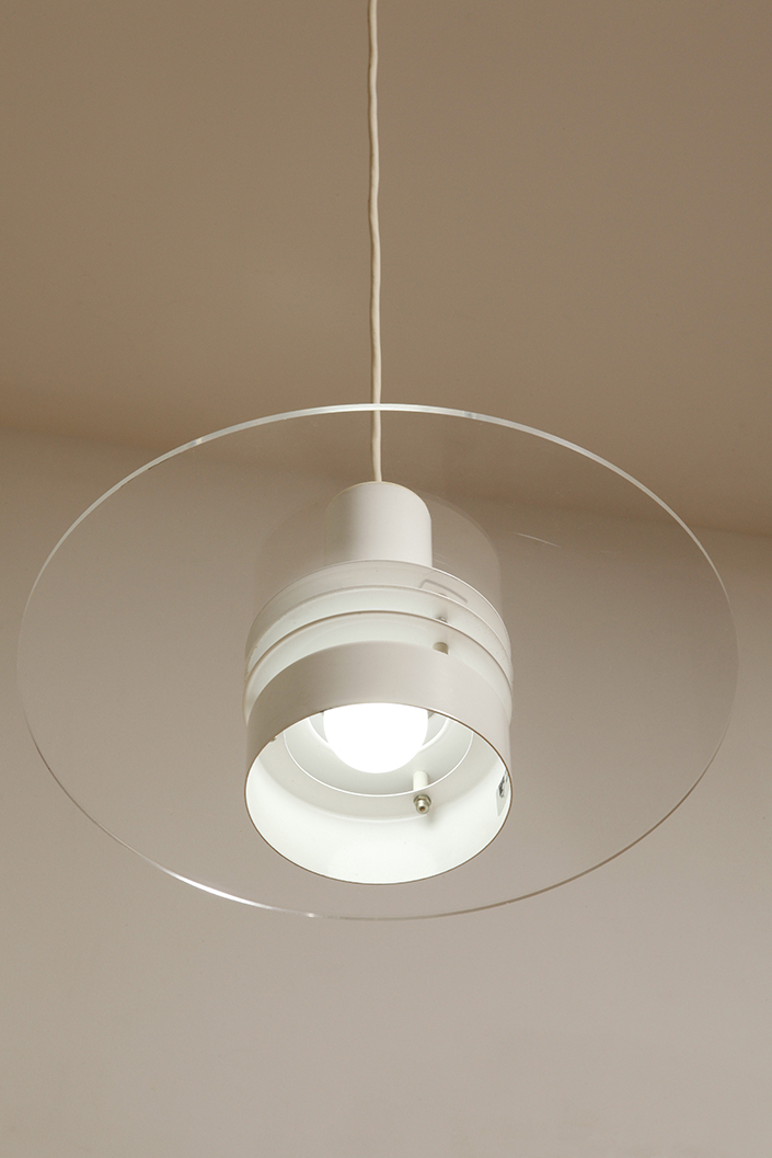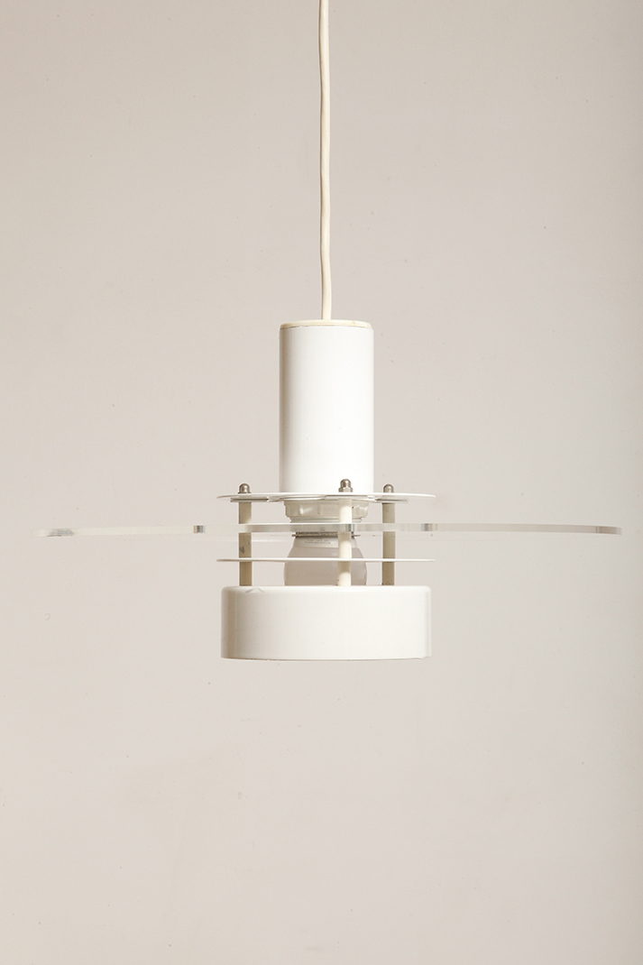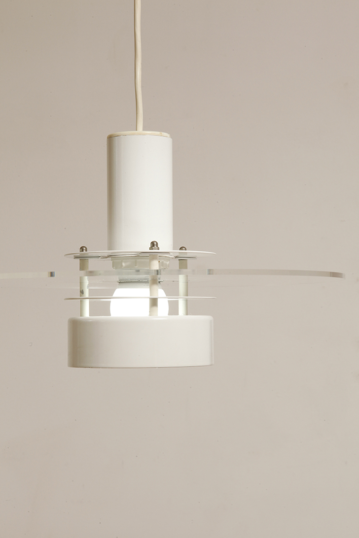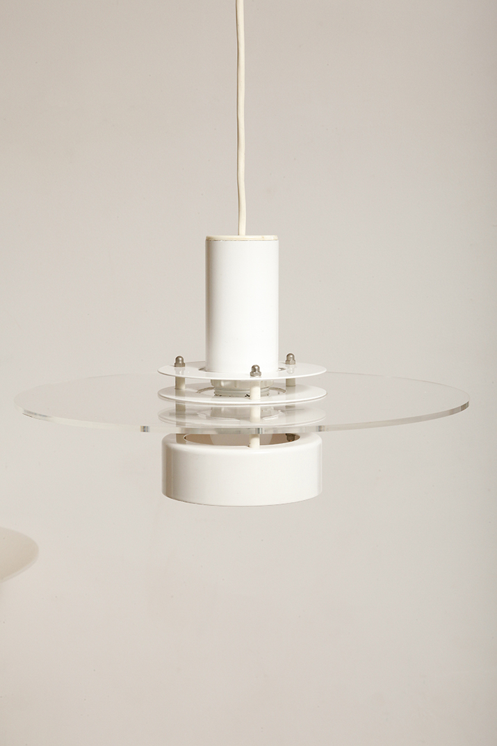 Metalowa jednopunktowa biała lampa wisząca/sufitowa z przeźroczystym okręgiem z pleksiglasu, HORN, typ 740, Dania, lata 70/80.