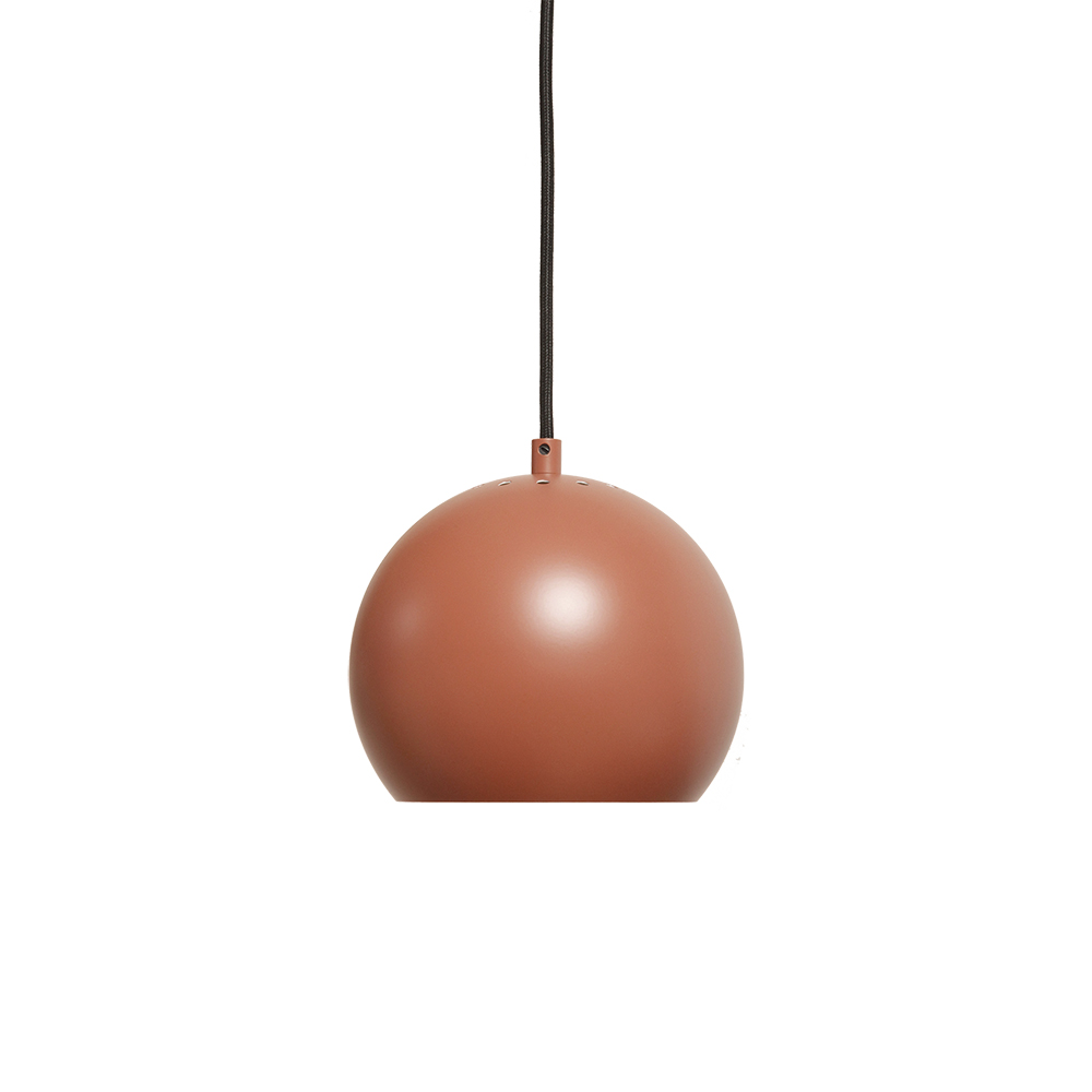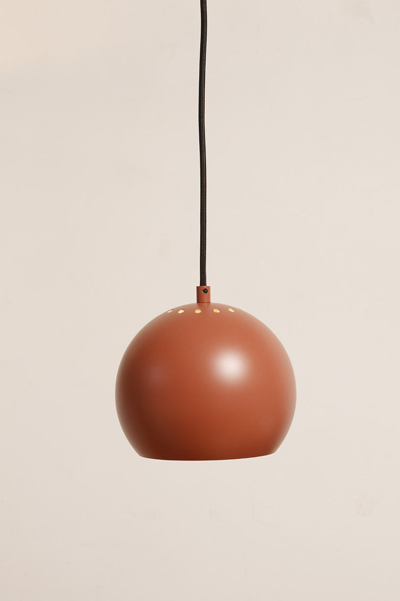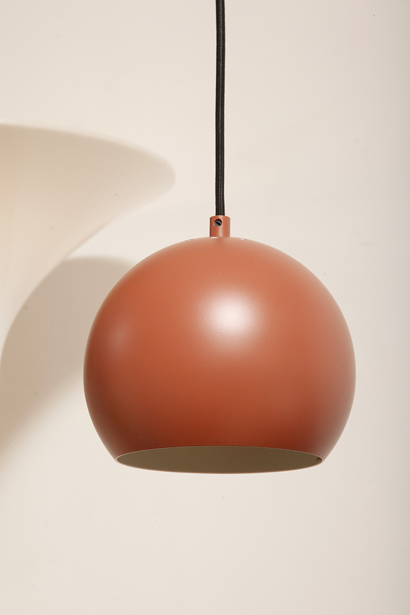 Metalowa jednopunktowa lampa wisząca/sufitowa w kształcie ściętej/otwartej od dołu kuli w kolorze terakotowej czerwieni wisząca na czarnym materiałowym kablu zasilającym, projekt Benny Frandsen dla firmy Frandsen, Dania, po 2000 roku
