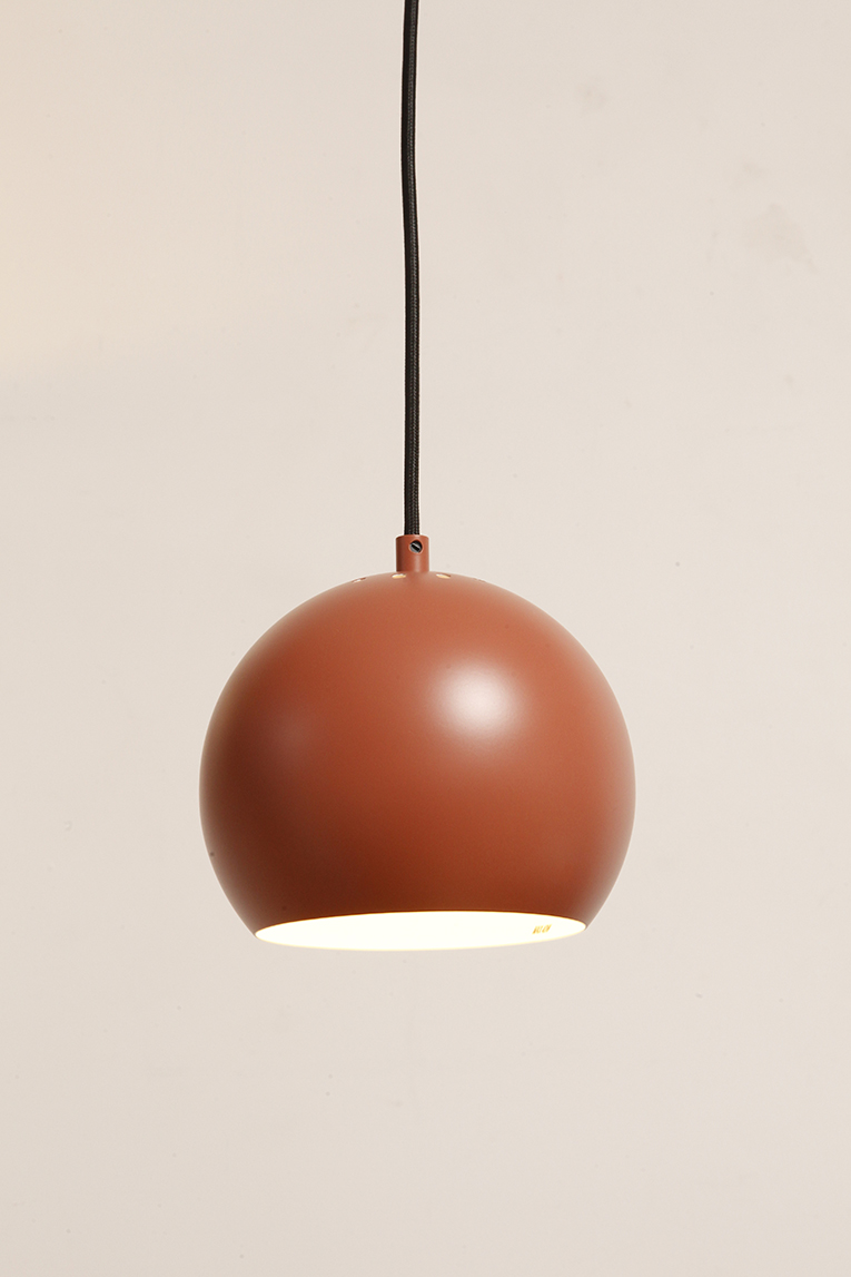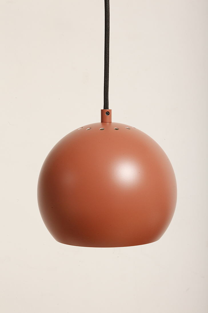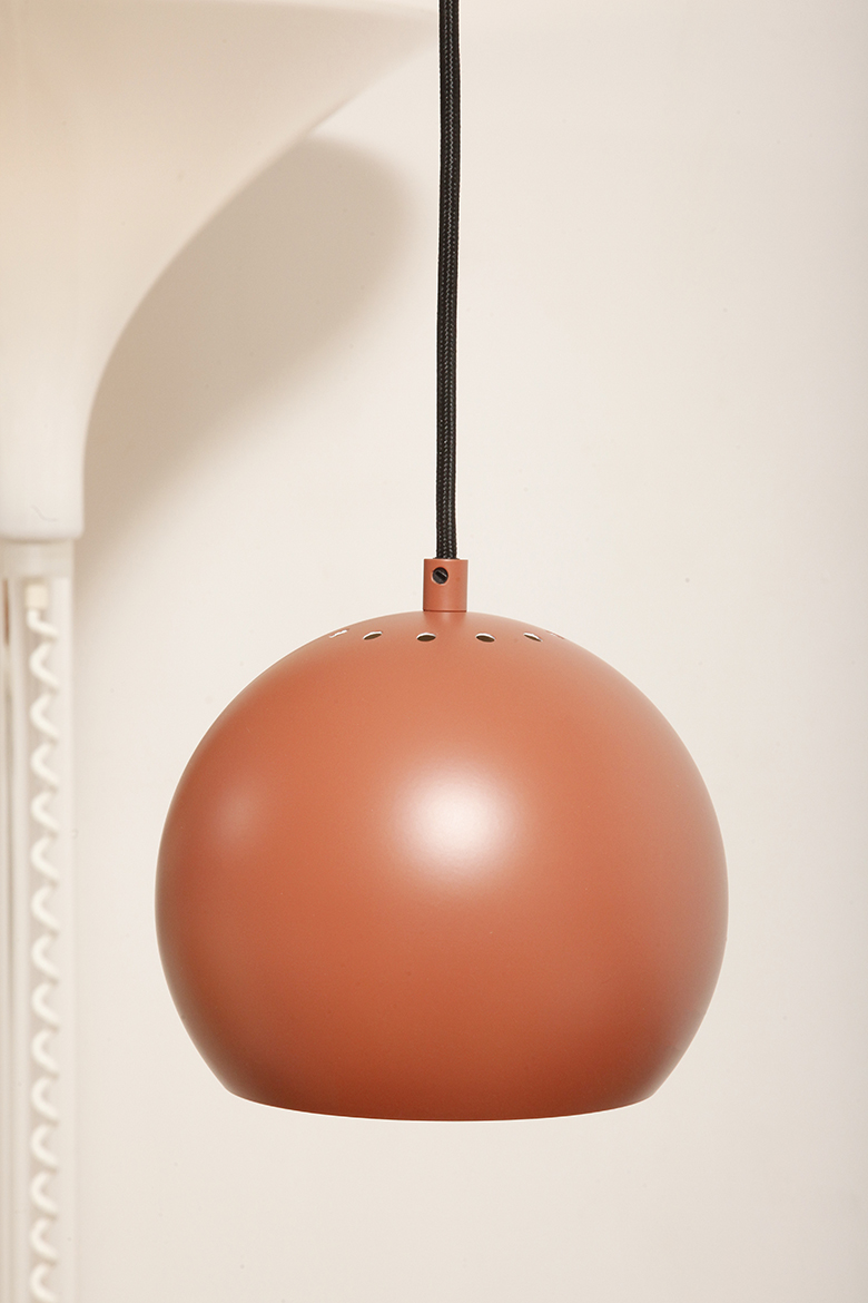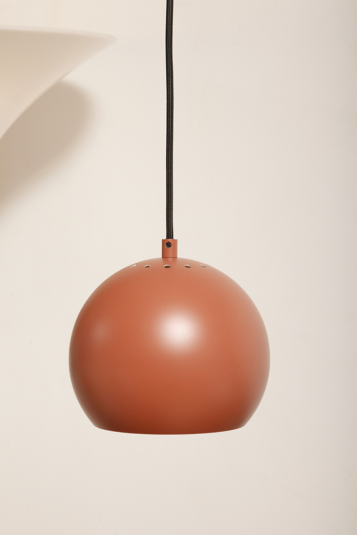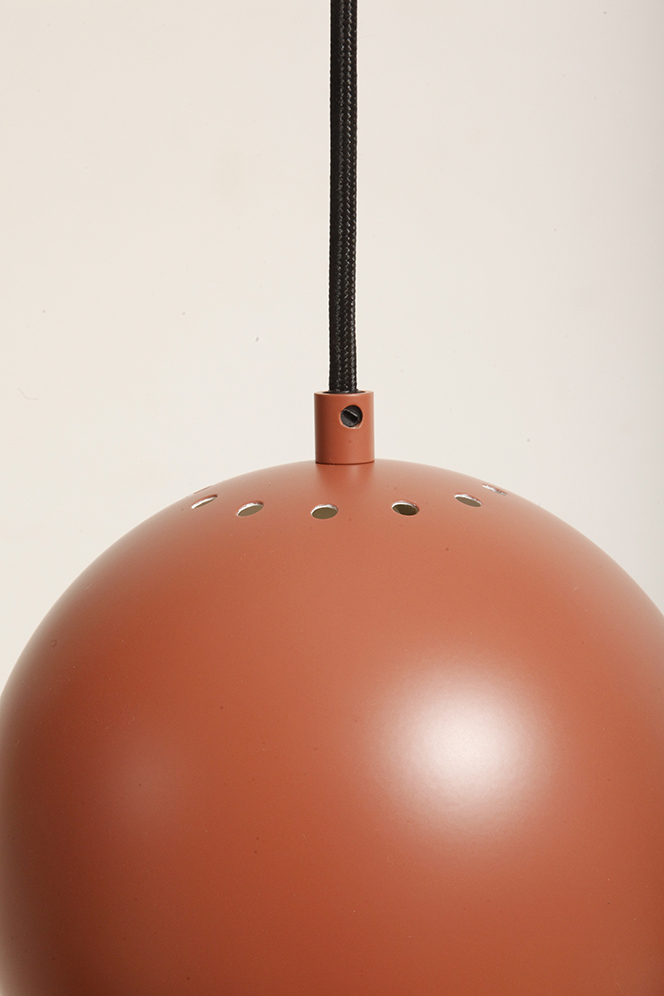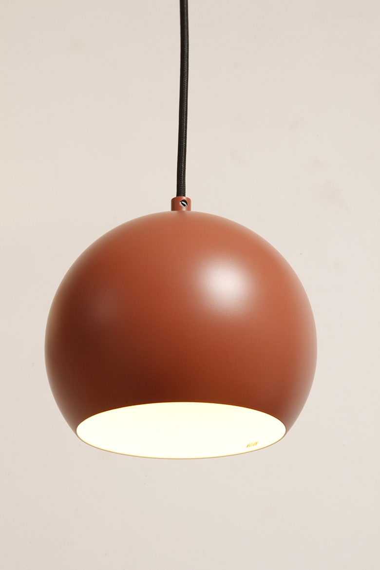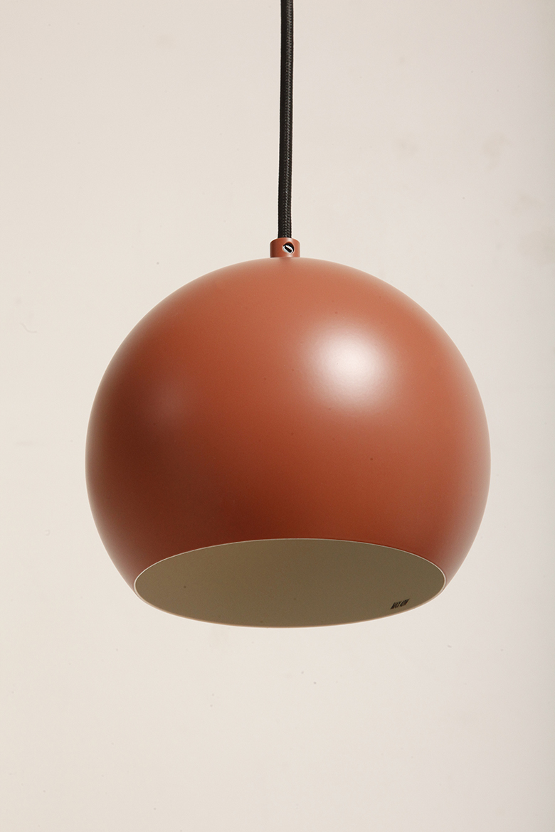 Poniżej zamieściłem opis stworzony przez firmę. Tak dla porównania tego co ja mógłbym sam o lampie napisać. Dla mnie to porządnie wykonana nieduża metalowa lampa w bezpiecznym aczkolwiek ciekawym terakotowym kolorze. Trochę w nim czerwieni, trochę rudego. Lakier jest matowy, a kształt niezatapialny wynikający z tradycji wzornictwa spod Space Agę. Niezatapialny i ponadczasowy kształt kuli który nigdy się nie zestarzeje.