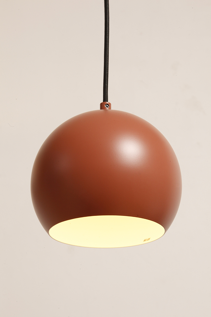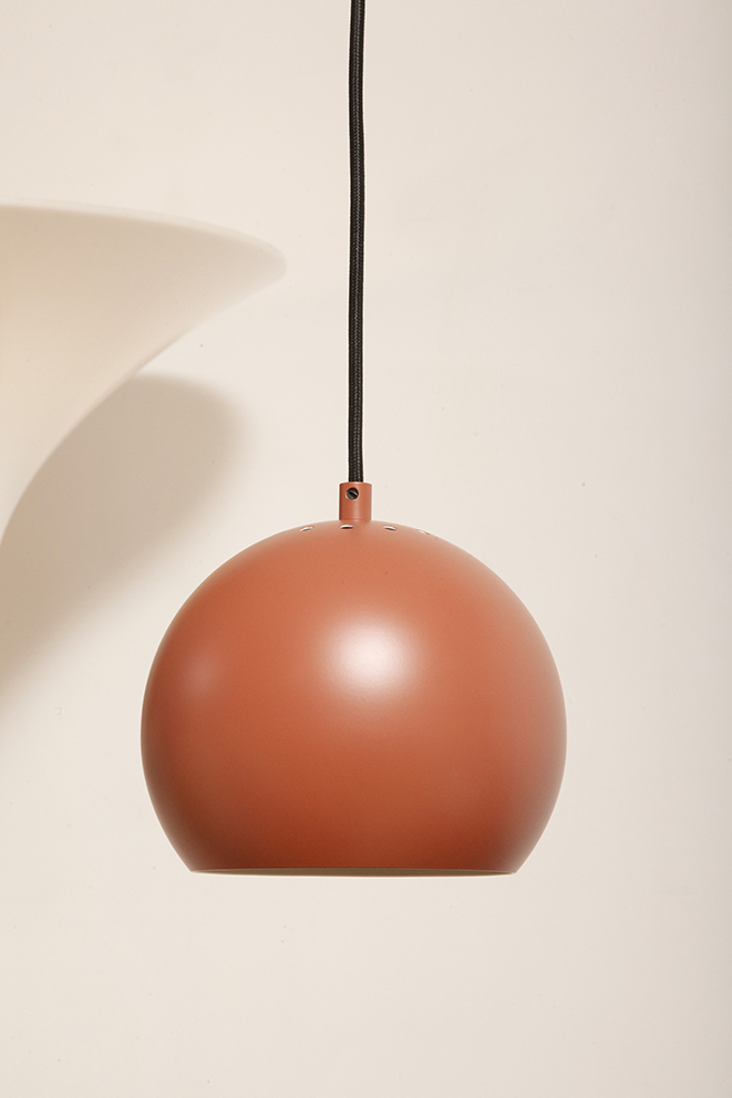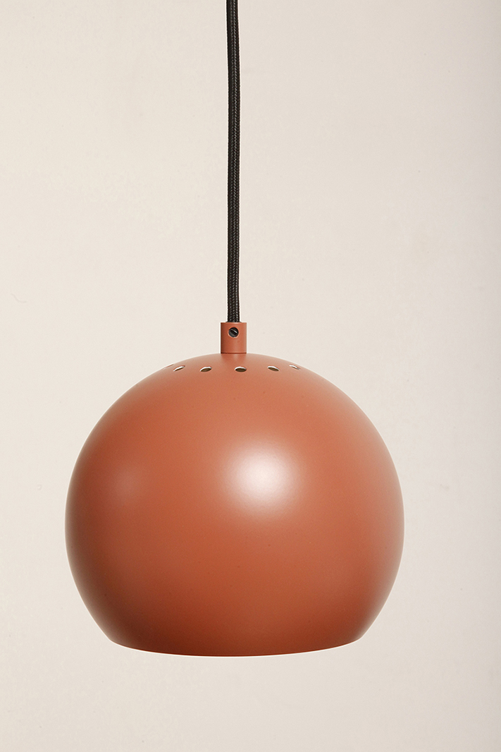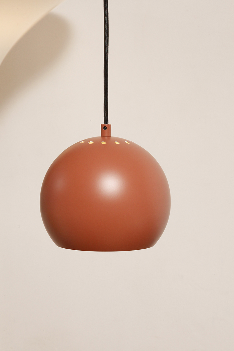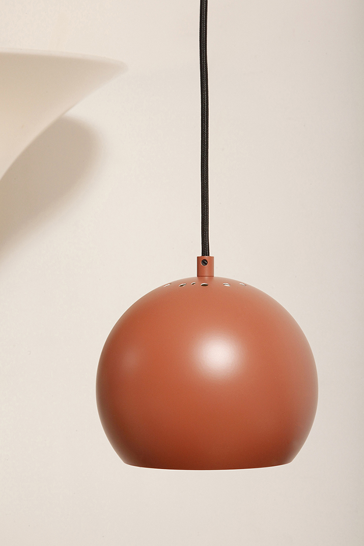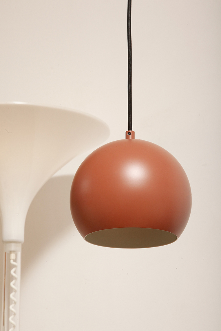 Poniżej zamieściłem opis stworzony przez firmę. Tak dla porównania tego co ja mógłbym sam o lampie napisać. Dla mnie to porządnie wykonana nieduża metalowa lampa w bezpiecznym aczkolwiek ciekawym terakotowym kolorze. Trochę w nim czerwieni, trochę rudego. Lakier jest matowy, a kształt niezatapialny wynikający z tradycji wzornictwa spod Space Agę. Niezatapialny i ponadczasowy kształt kuli który nigdy się nie zestarzeje.