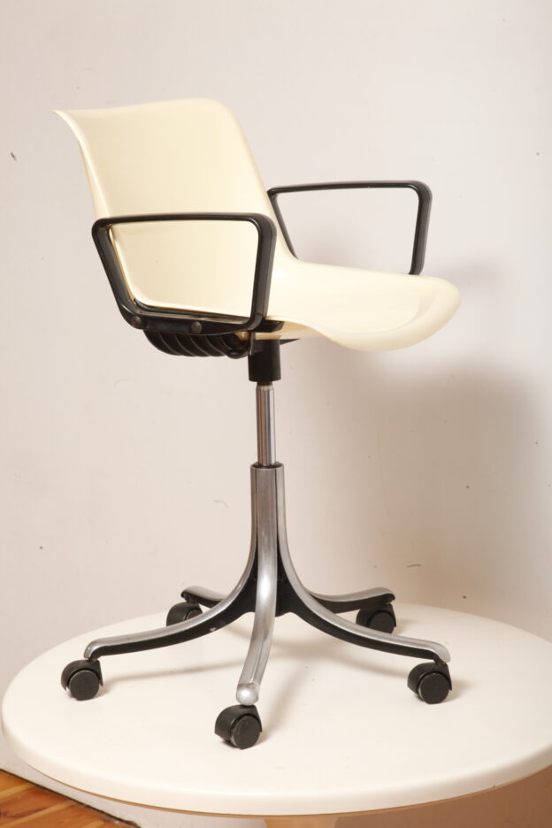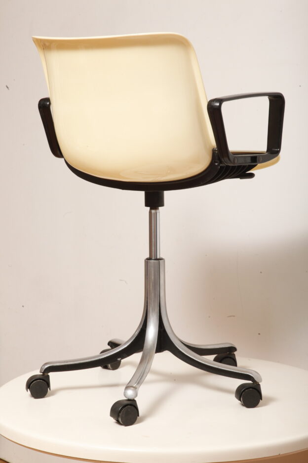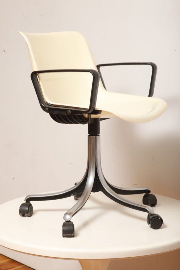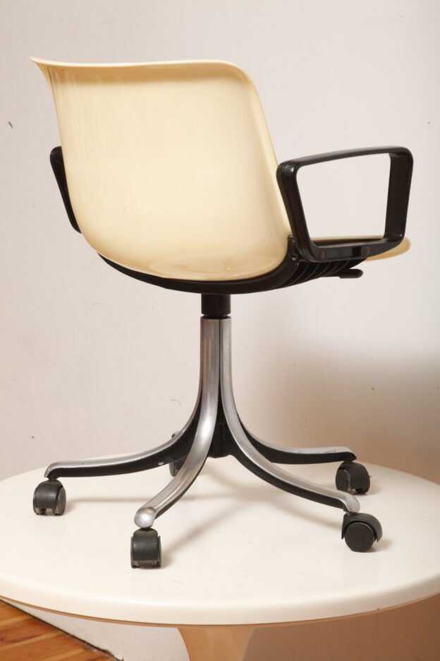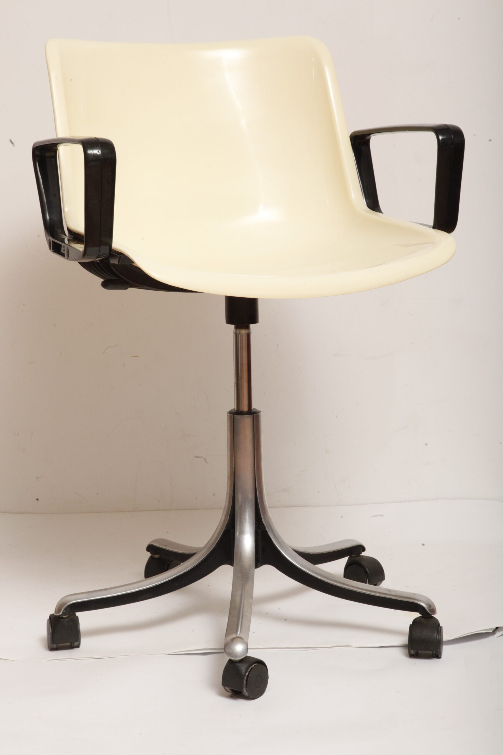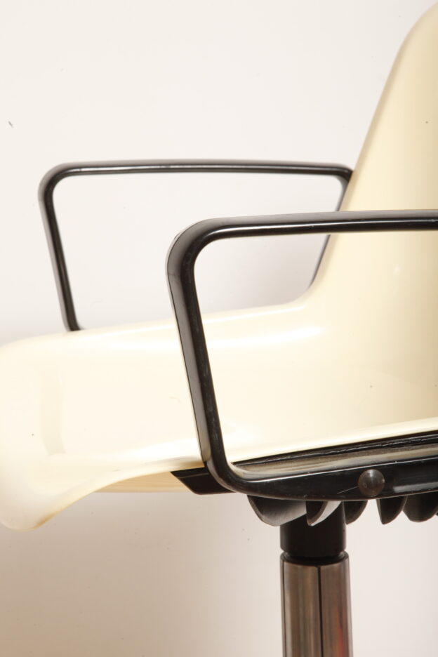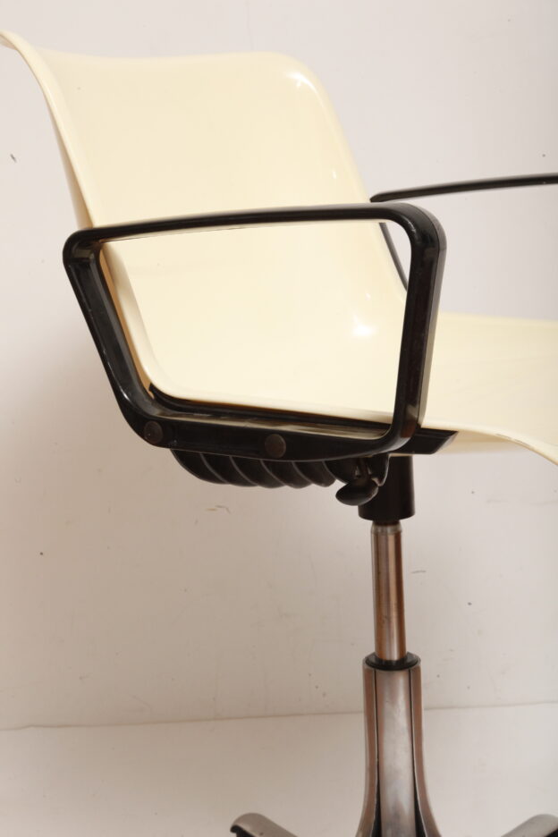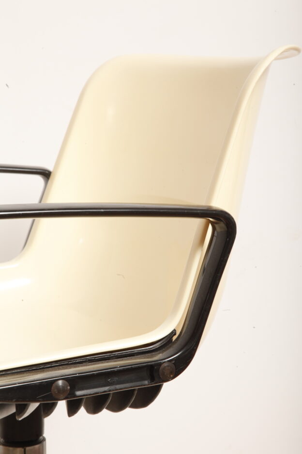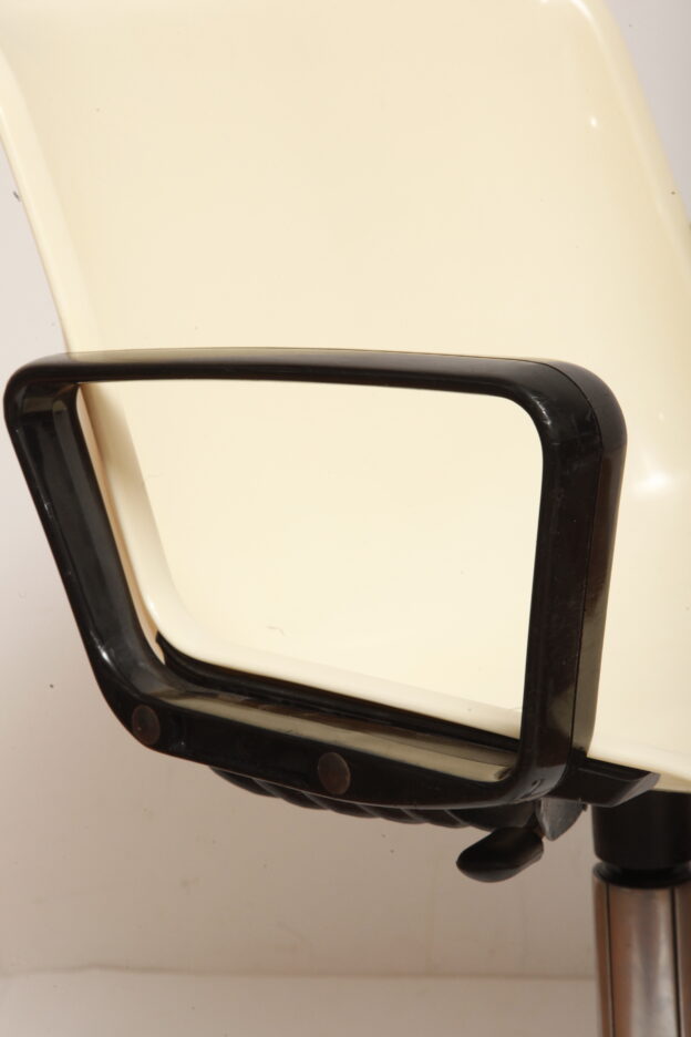 Mobilne krzesło „Modus” z czarnymi podłokietnikami i jasno kremowym siedziskiem z tworzywa ABS osadzonym na metalowej nodze z regulowaną wysokością, projekt Osvaldo Borsani dla firmy Tecno, Włochy, wzór z 1972 roku