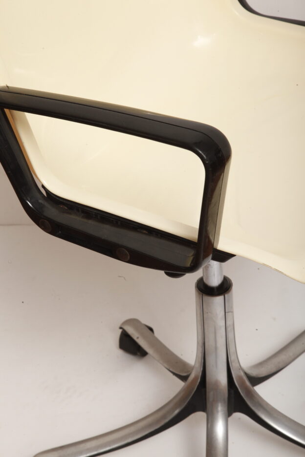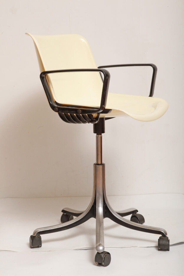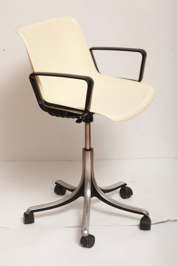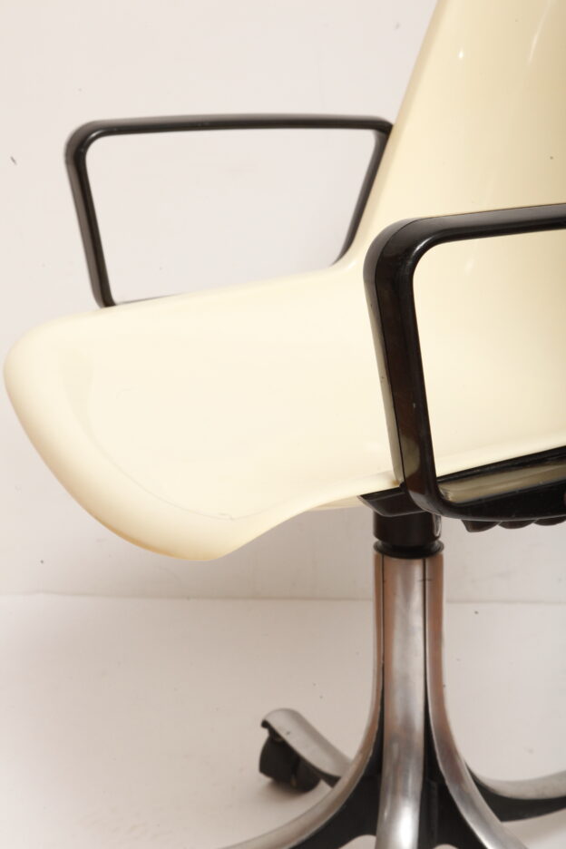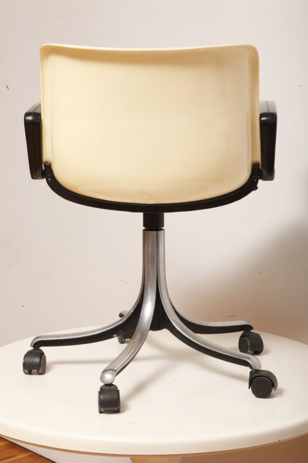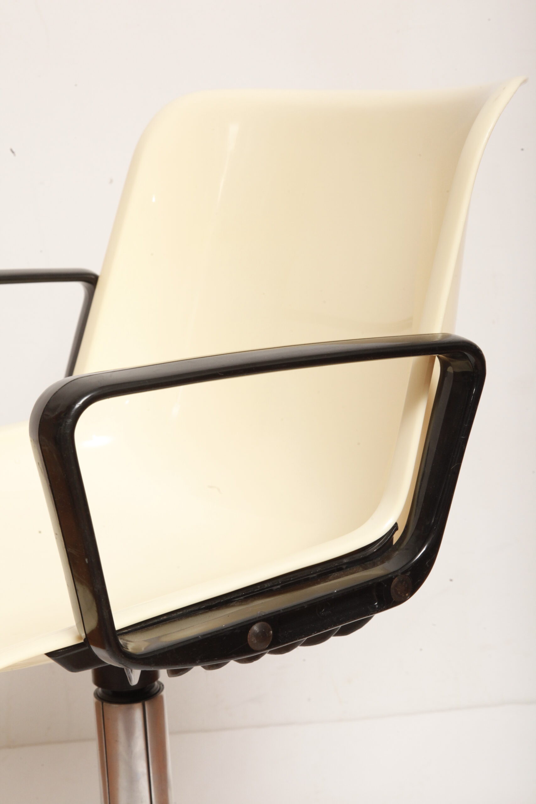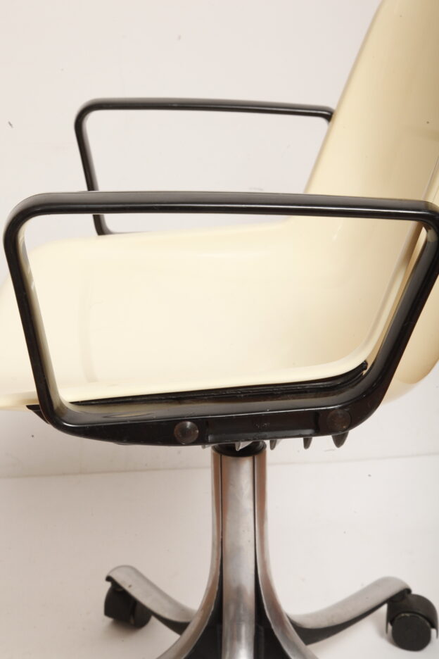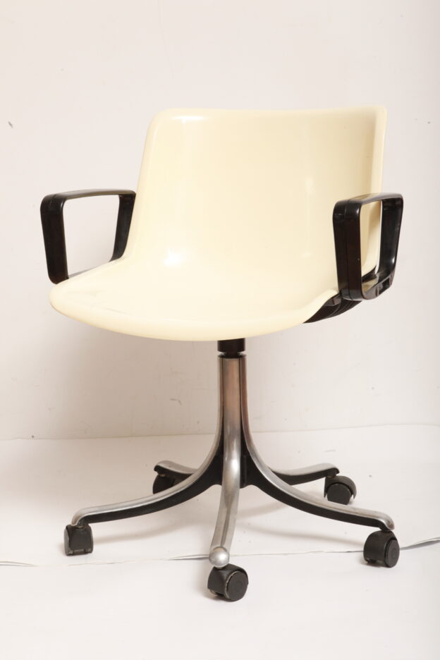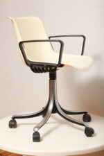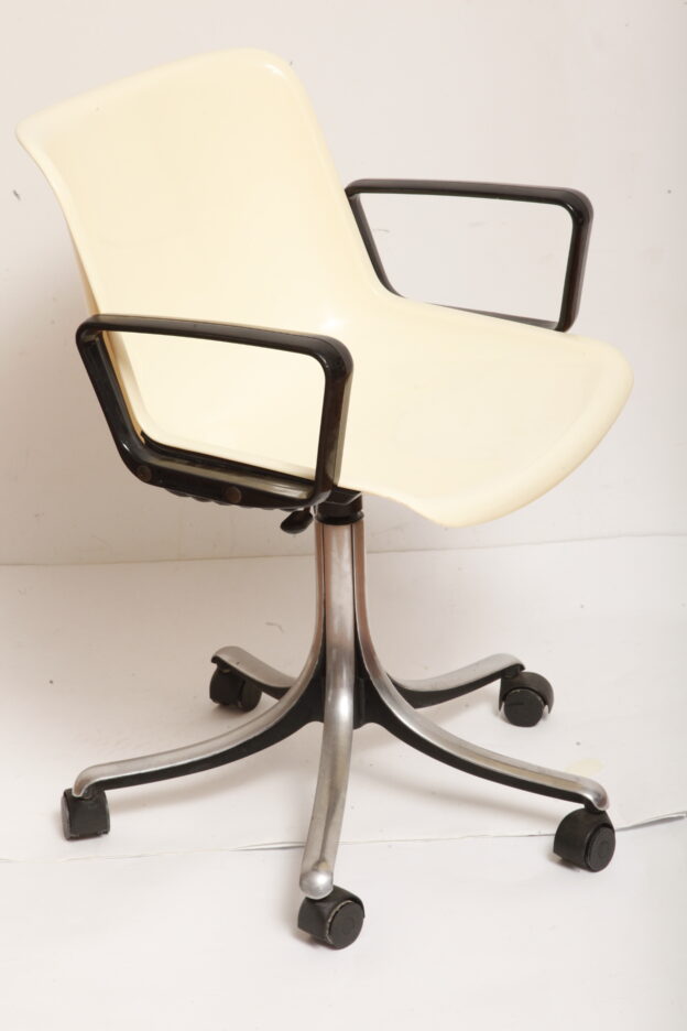 Mobilne krzesło „Modus” z czarnymi podłokietnikami i jasno kremowym siedziskiem z tworzywa ABS osadzonym na metalowej nodze z regulowaną wysokością, projekt Osvaldo Borsani dla firmy Tecno, Włochy, wzór z 1972 roku