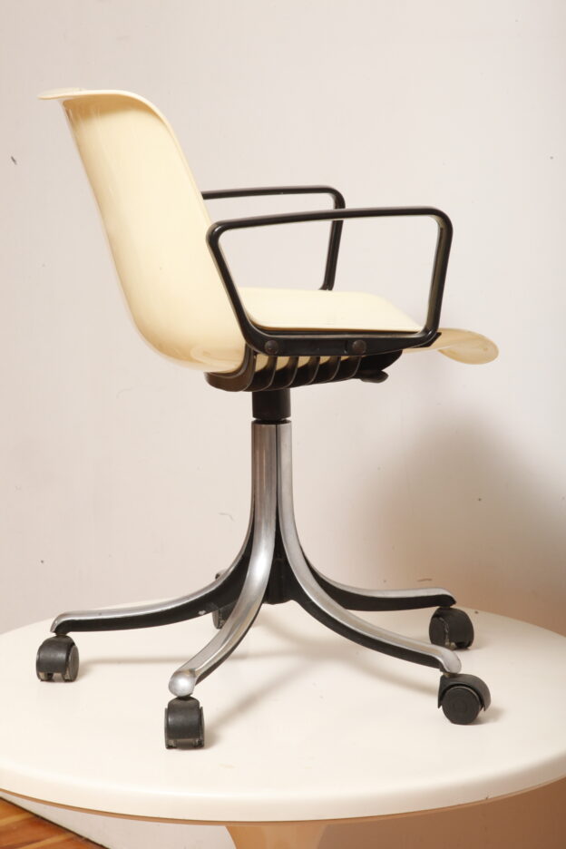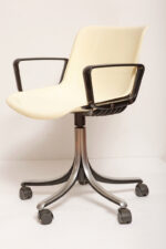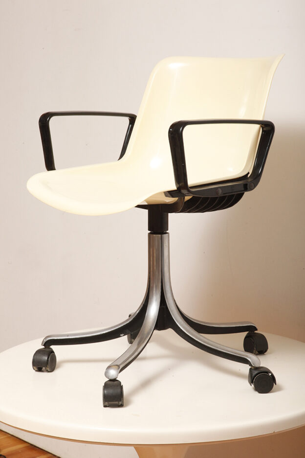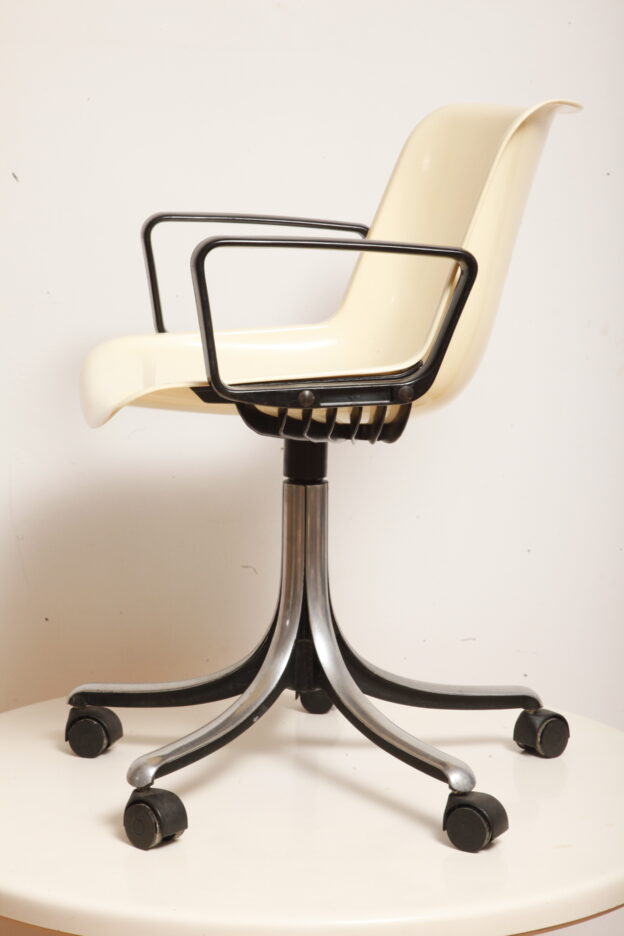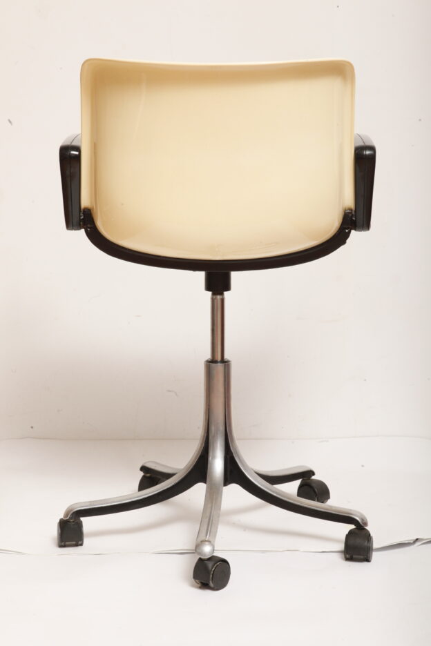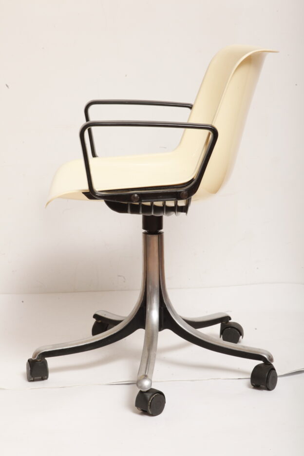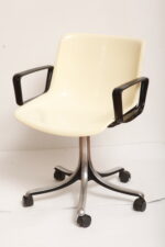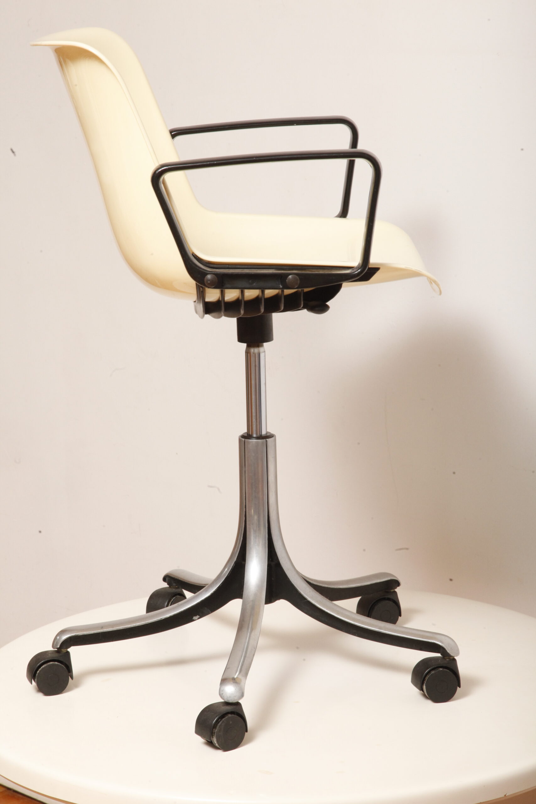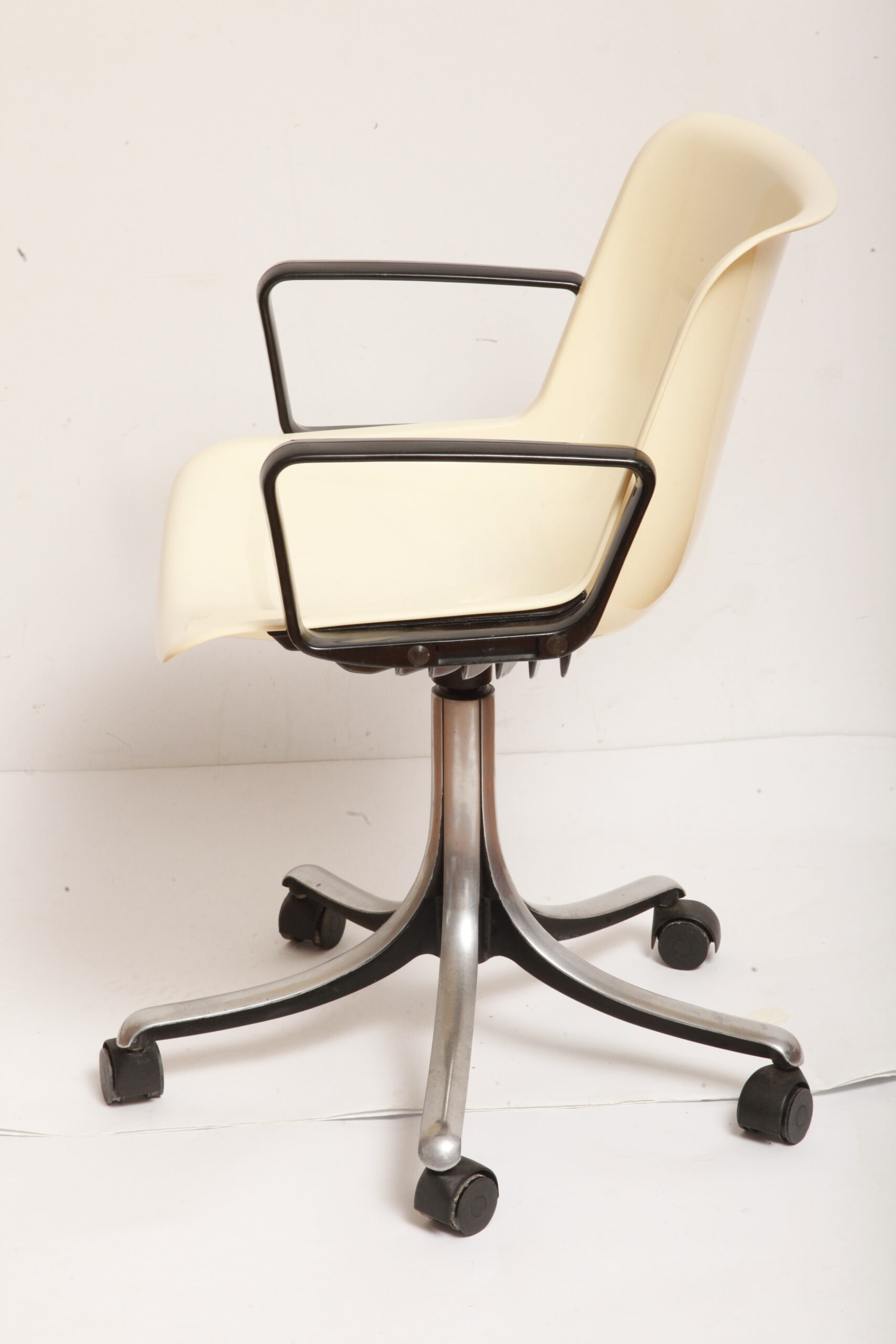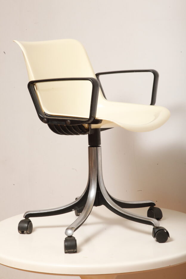 Mobilne krzesło „Modus” z czarnymi podłokietnikami i jasno kremowym siedziskiem z tworzywa ABS osadzonym na metalowej nodze z regulowaną wysokością, projekt Osvaldo Borsani dla firmy Tecno, Włochy, wzór z 1972 roku