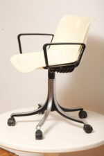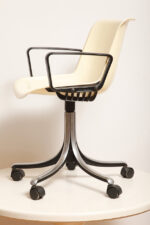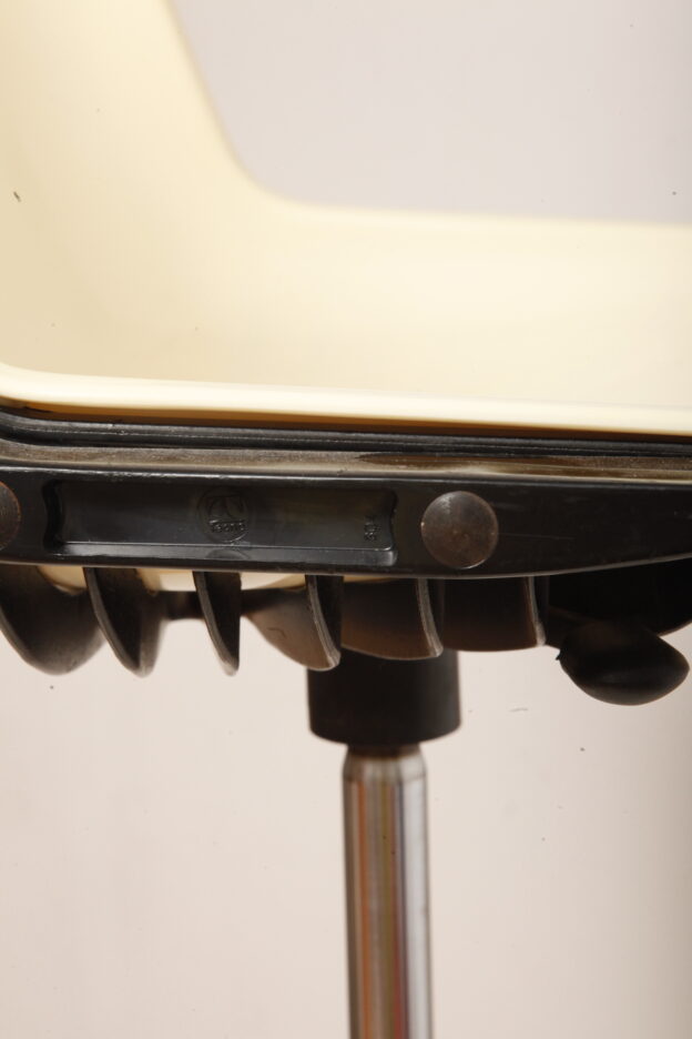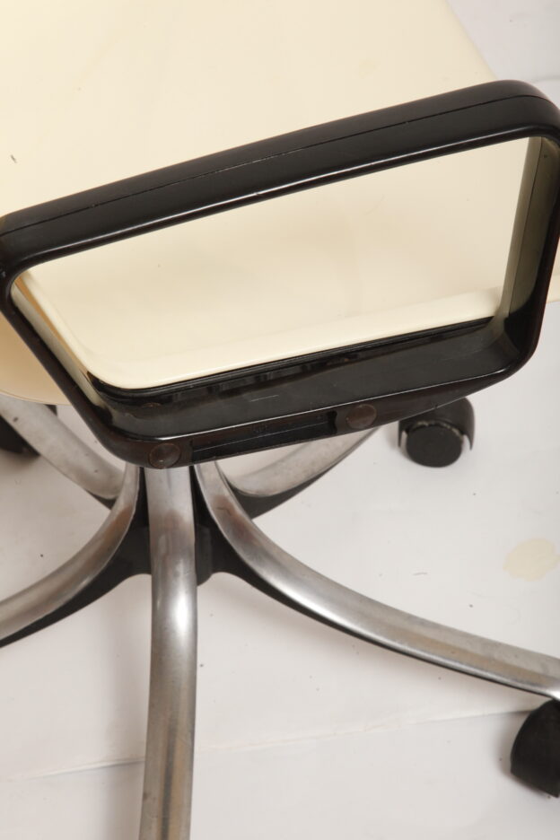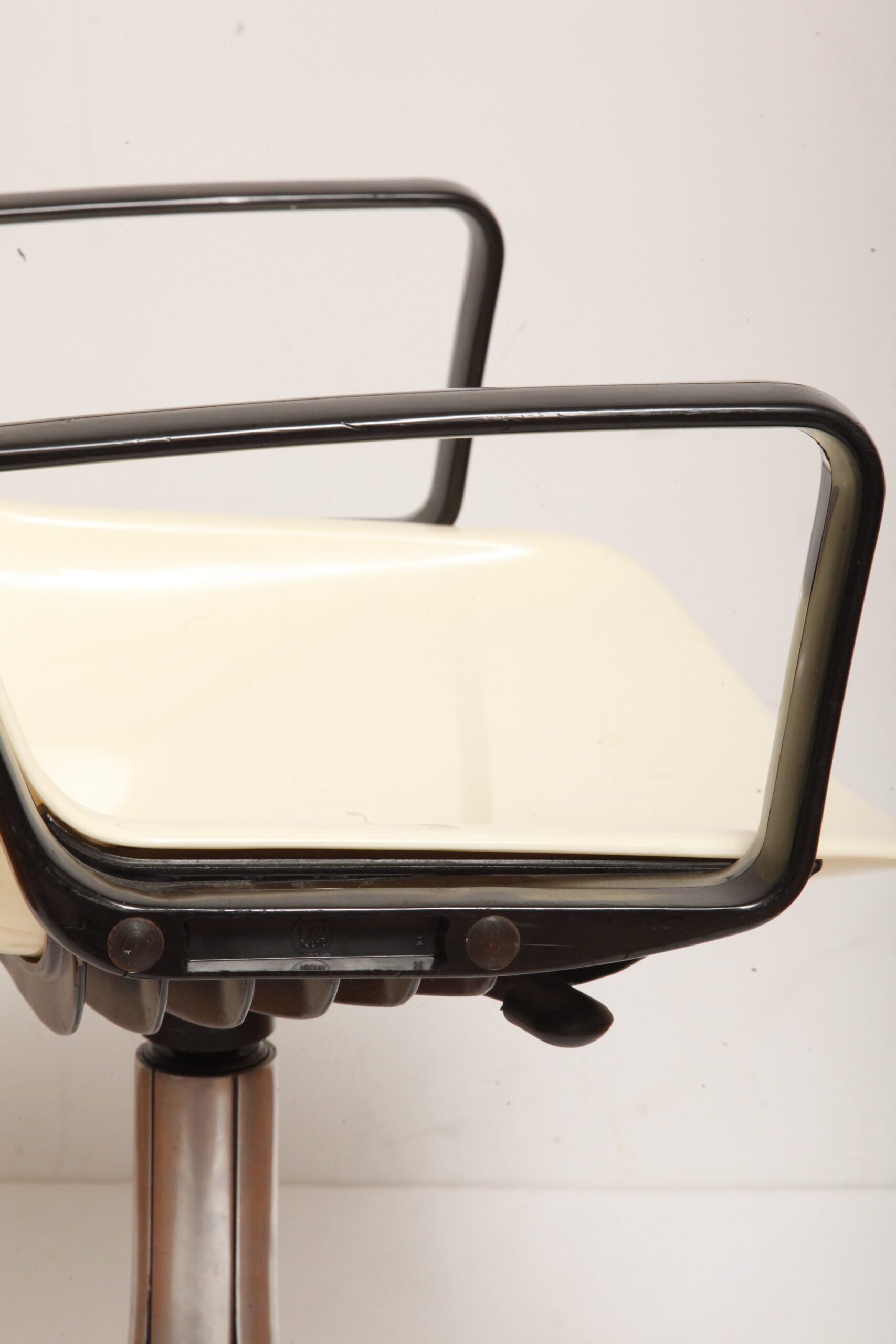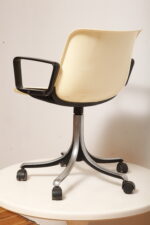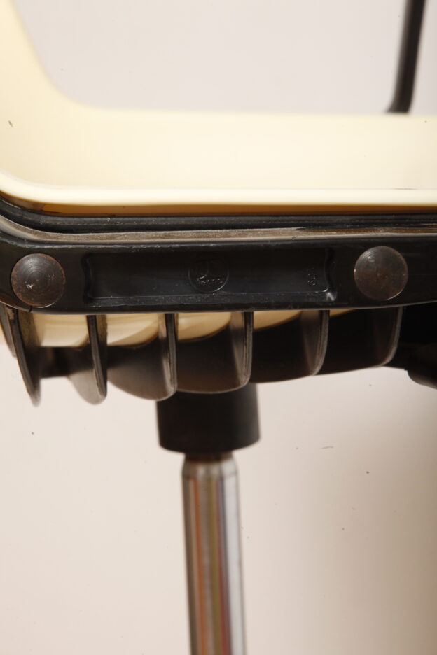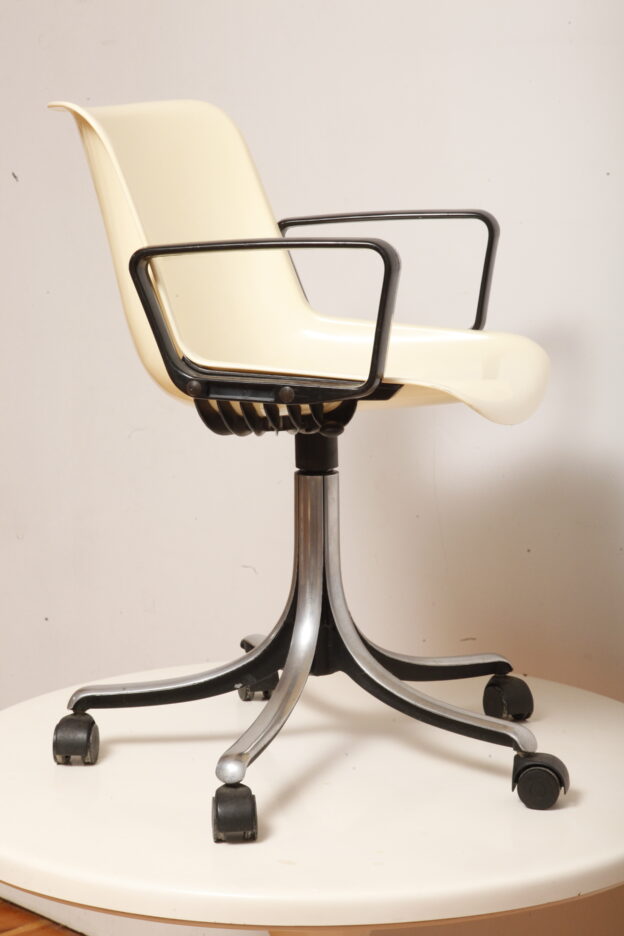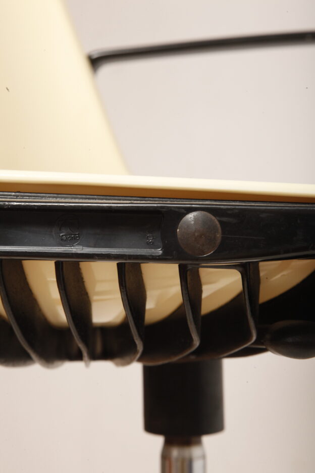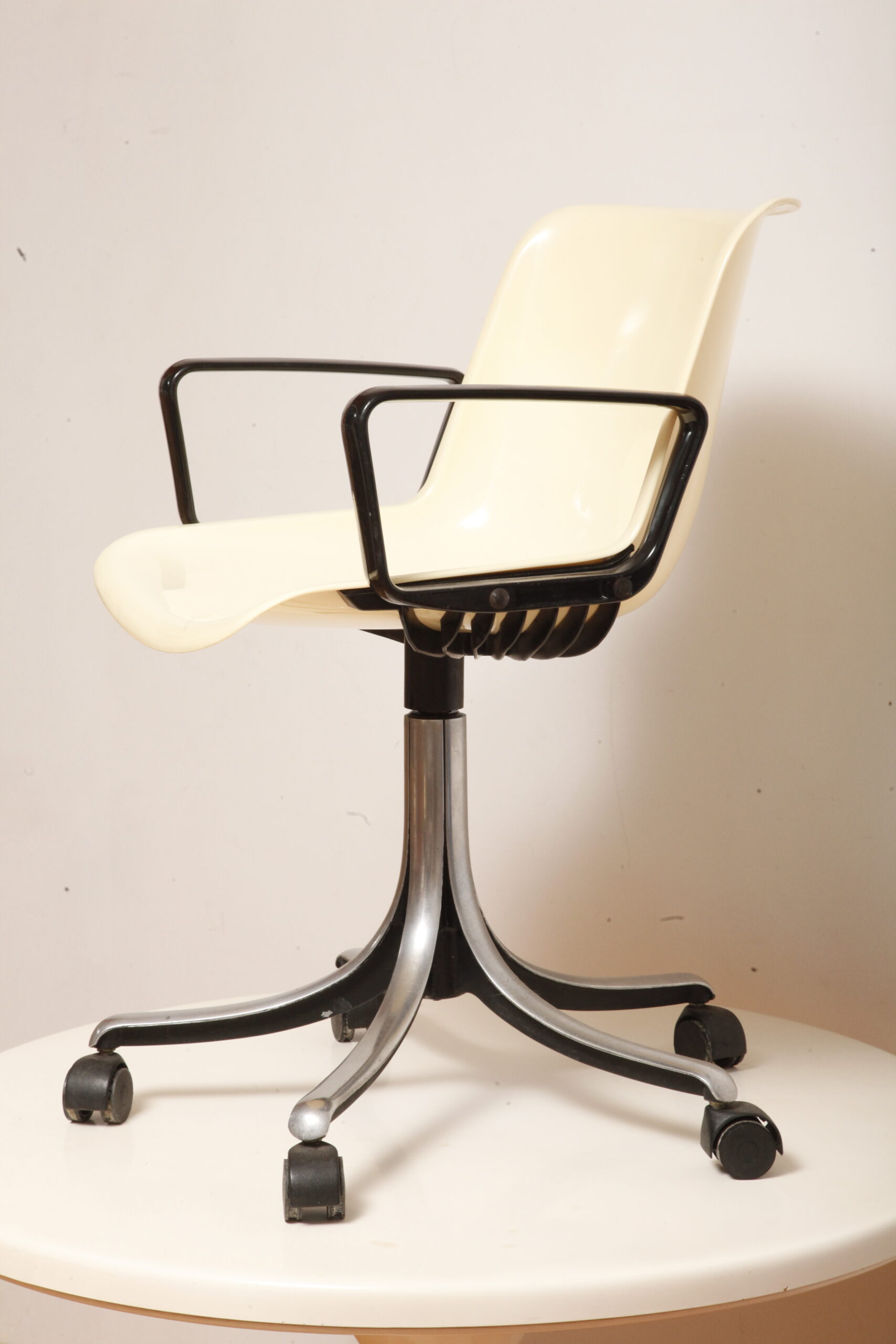 Mobilne krzesło „Modus” z czarnymi podłokietnikami i jasno kremowym siedziskiem z tworzywa ABS osadzonym na metalowej nodze z regulowaną wysokością, projekt Osvaldo Borsani dla firmy Tecno, Włochy, wzór z 1972 roku