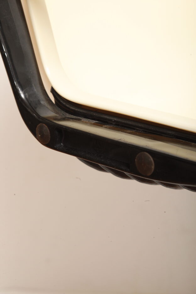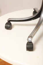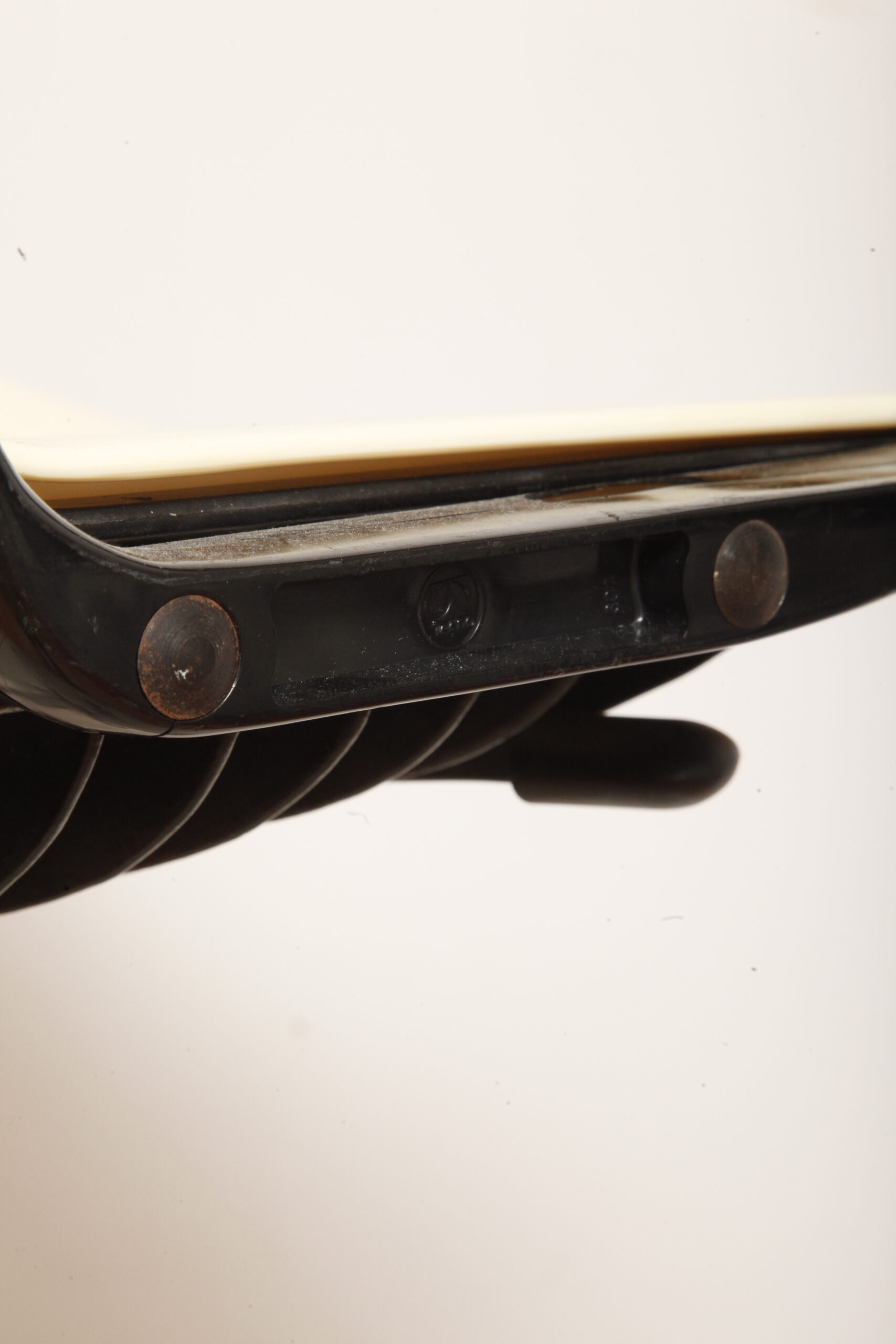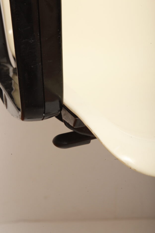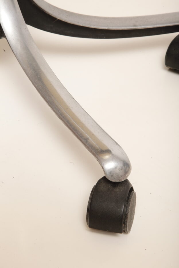 Zachowane w dobrym stanie (mamy dwa takie same) z powierzchniowymi niespecjalnie widocznymi zarysowaniami użytkowymi na siedzisku, w bardzo przyjemny sposób mobilne z opuszczanym i podnoszonym siedziskiem. No i mają czarne podłokietniki ze sztywnego tworzywa, co mocno poprawia komfort siedzenia, choć i bez tego są bardzo wygodne.