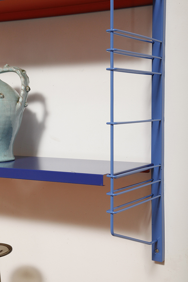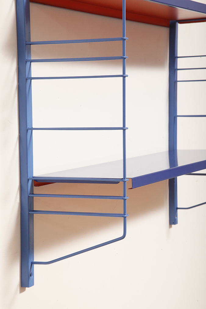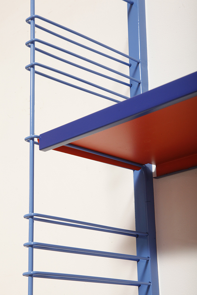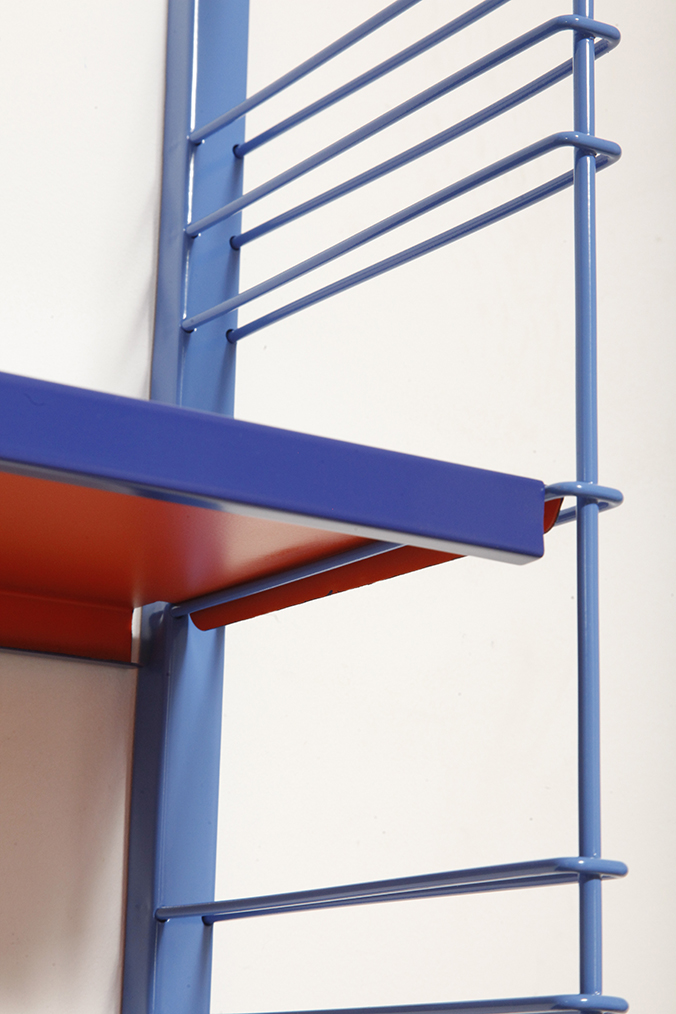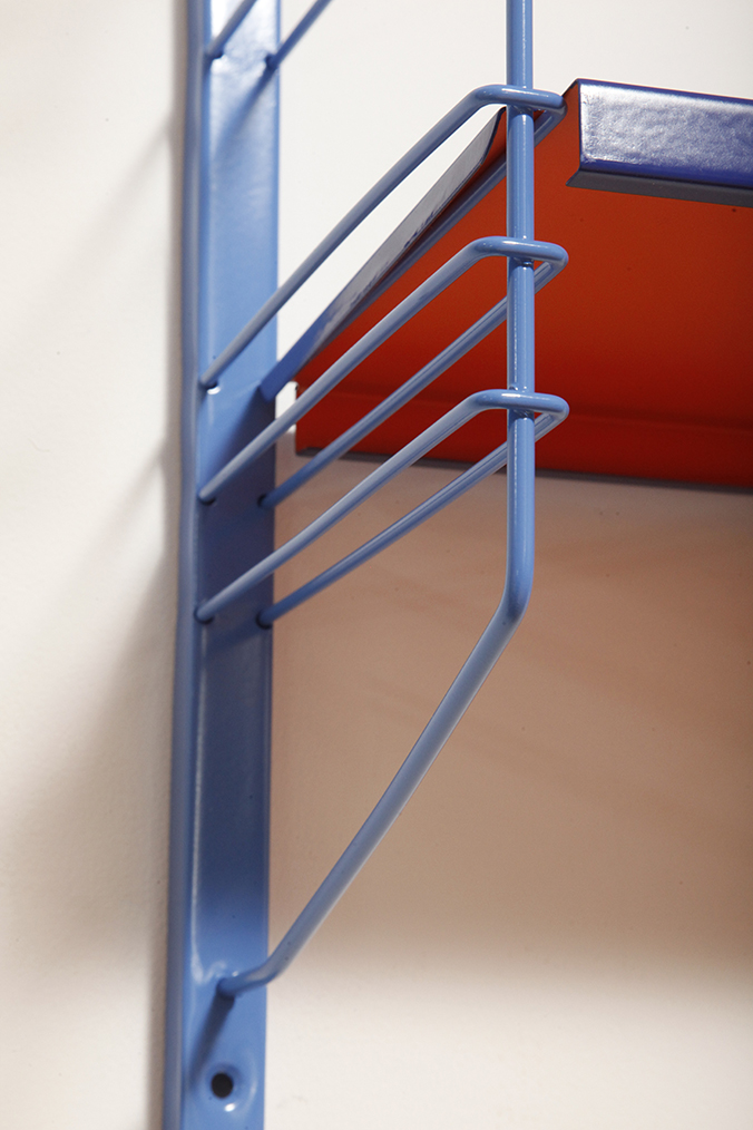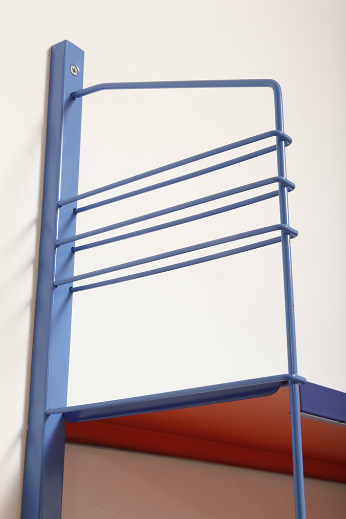 Nasz mebel jest w wersji kolorystycznej tzw. różnokolorowej. I tak. Pionowe listwy są w jaśniejszym odcieniu niebieskiego, górne części dwóch półek w ciemniejszym niebieskim, a ich spody w pomarańczowym kolorze. I można je wieszać w zasadzie na dowolnej wysokości. Taki system powiedziałbym holenderski.