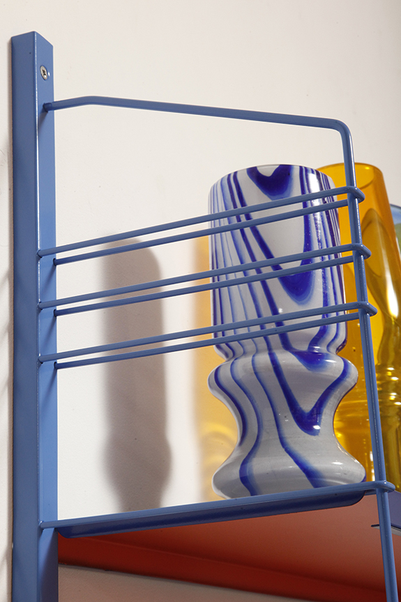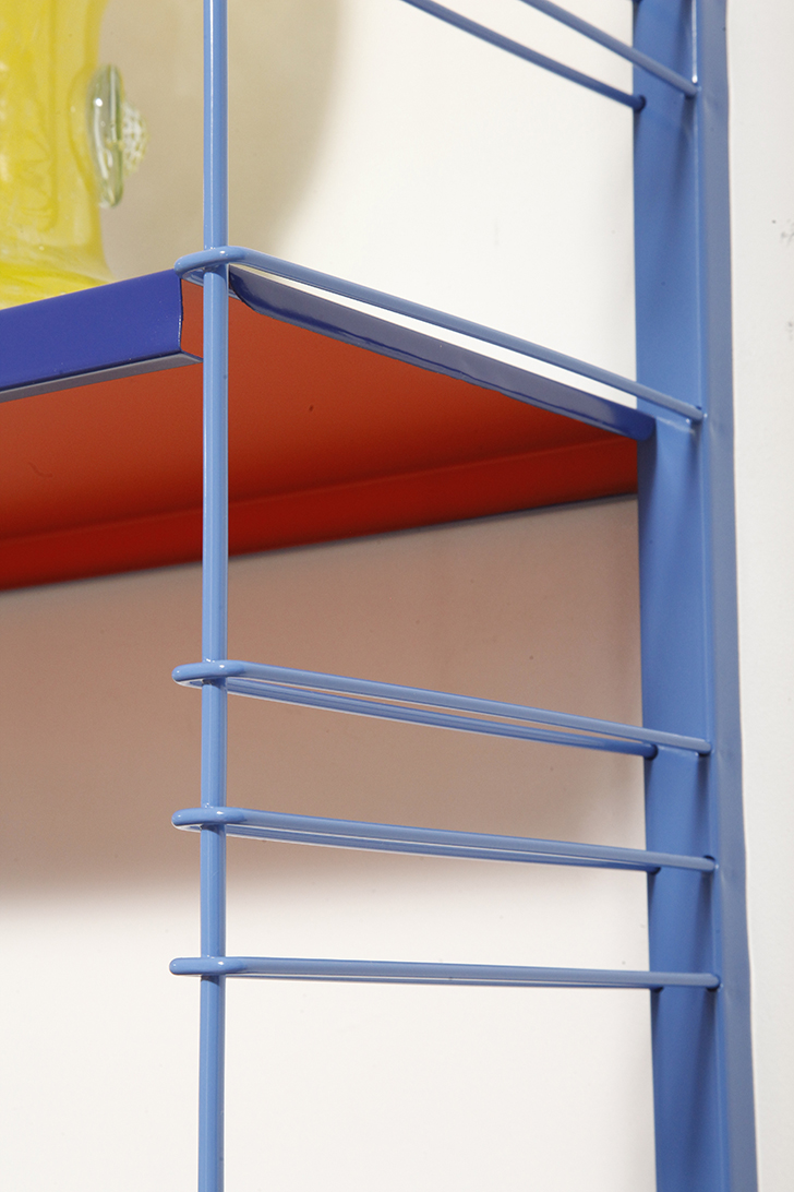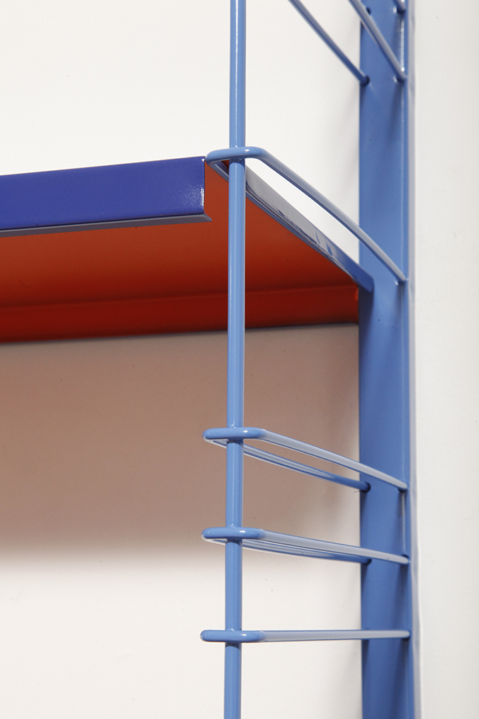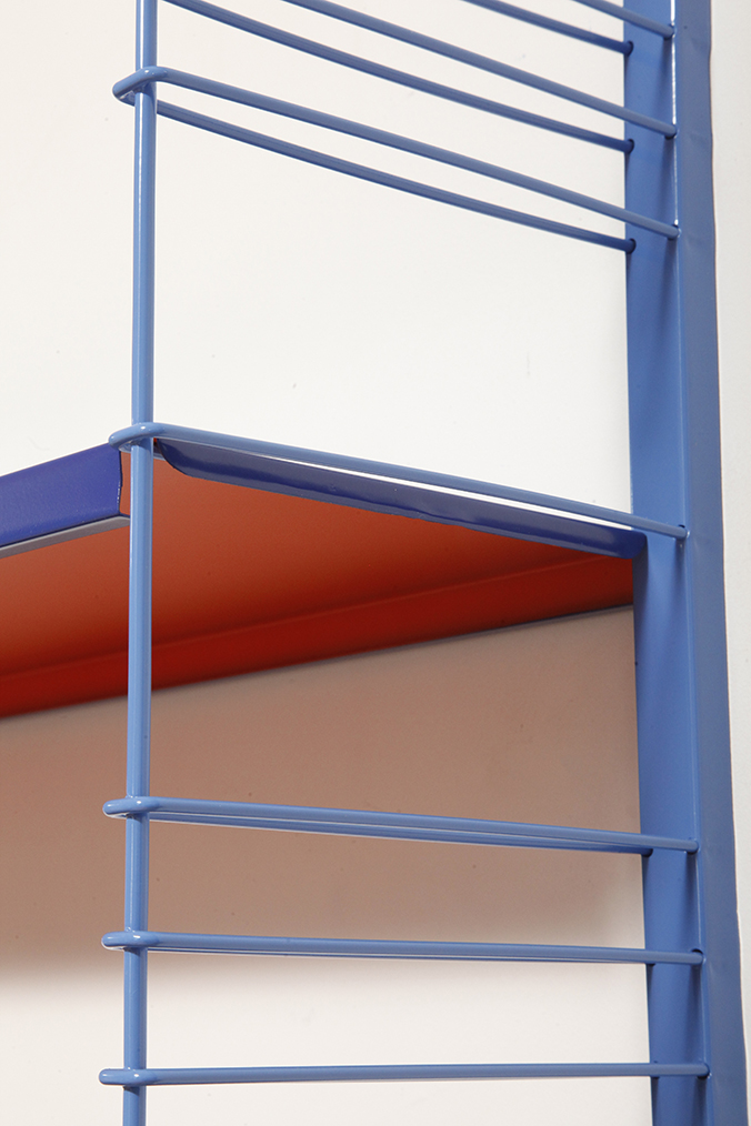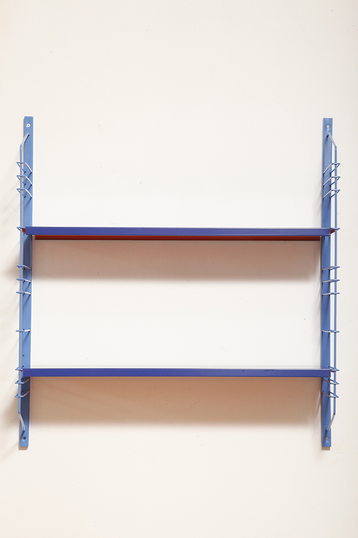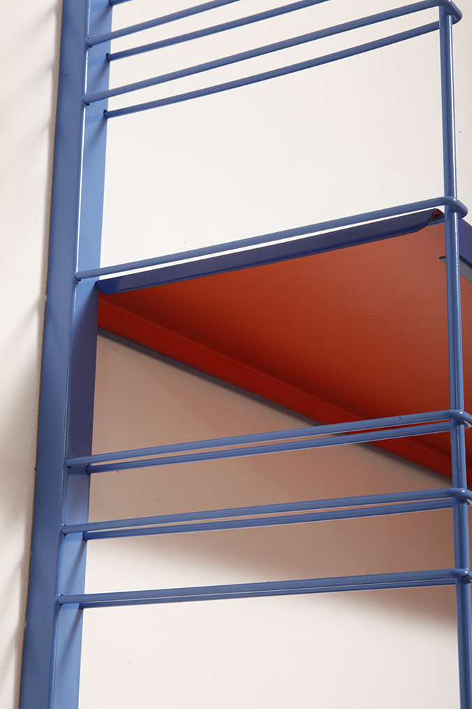 Nasz mebel jest w wersji kolorystycznej tzw. różnokolorowej. I tak. Pionowe listwy są w jaśniejszym odcieniu niebieskiego, górne części dwóch półek w ciemniejszym niebieskim, a ich spody w pomarańczowym kolorze. I można je wieszać w zasadzie na dowolnej wysokości. Taki system powiedziałbym holenderski.