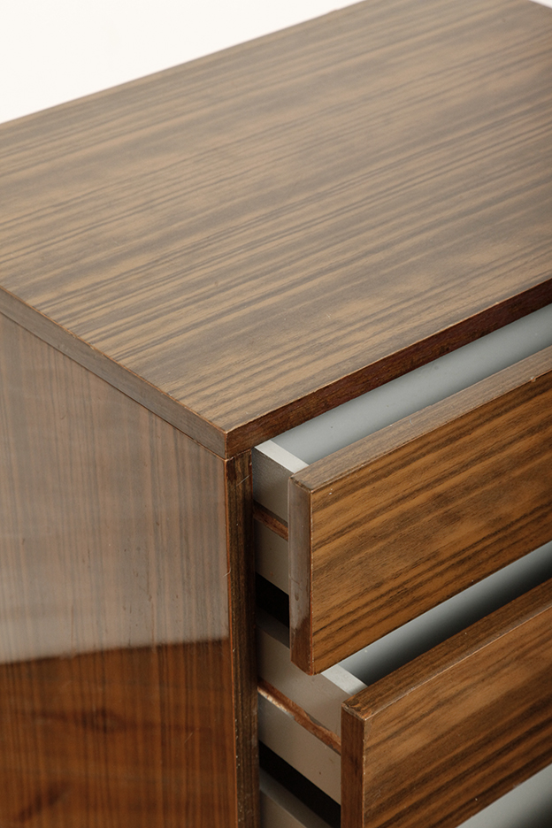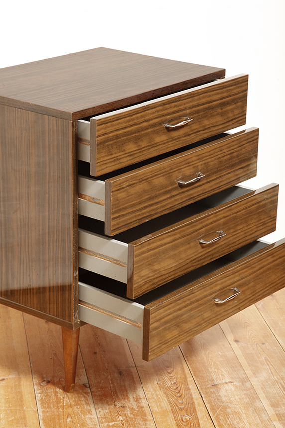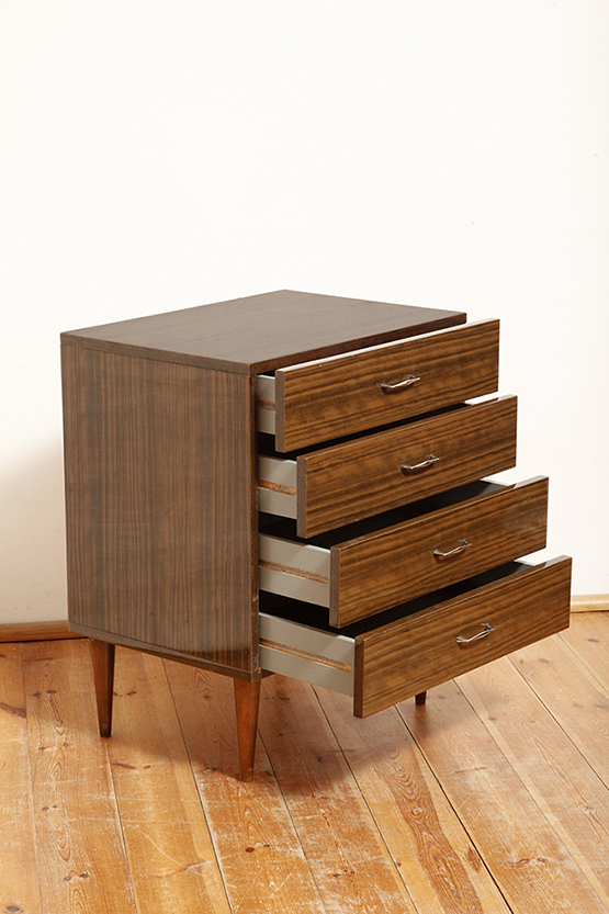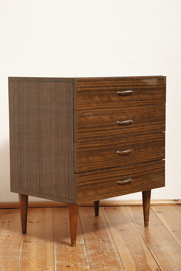 Nieduża ciemna mahoniowa komoda w połysku z czterema szufladami z metalowymi uchwytami, Warszawskie Fabryki Mebli, ul.Kawęczyńska 36, Polska, lata 70.