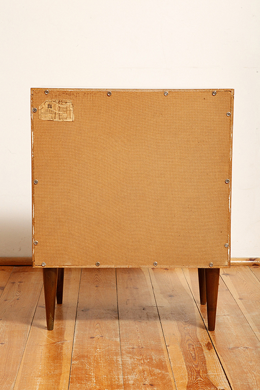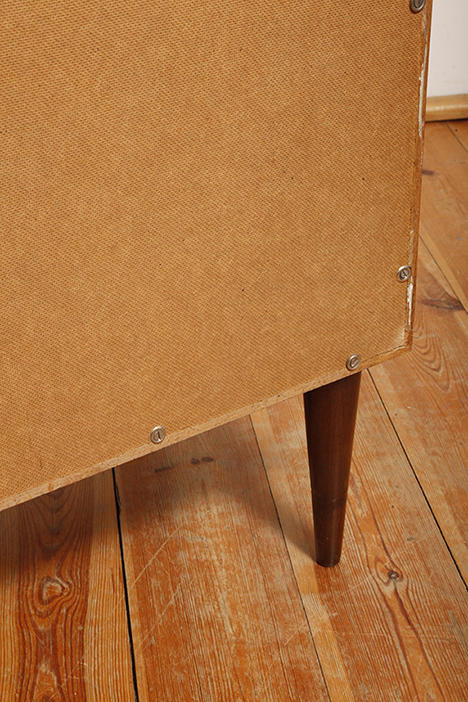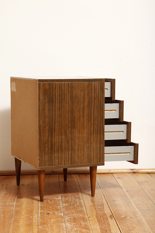 Nogi sztuk cztery toczonem drewnianem zwężające się seksownie do dołu. W razie zaistnienia takiej potrzeby można je wykręcić i np. schować właścicielowi, lub właścielce komody w ramach niezbyt mądrego psikusa.
