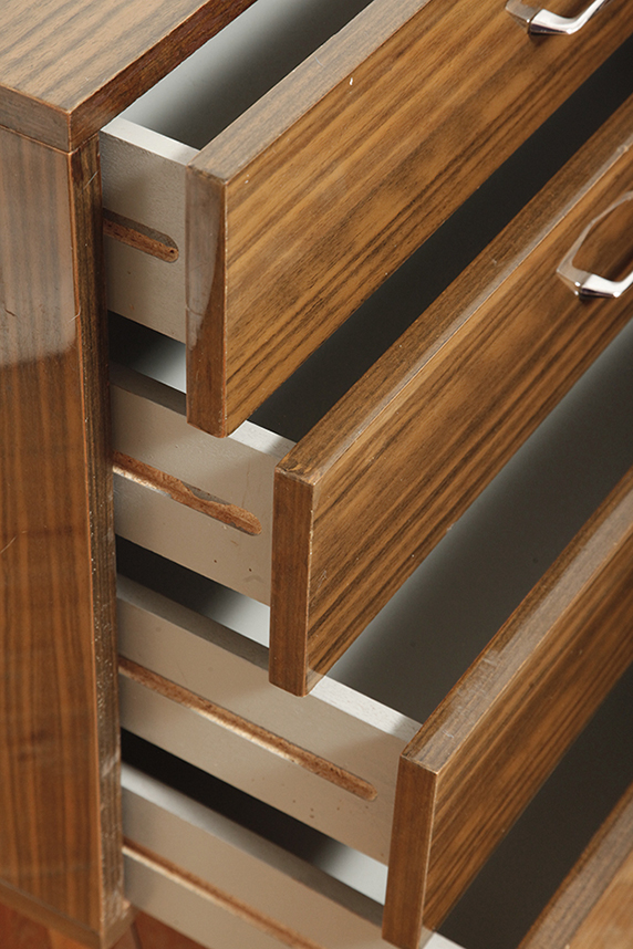 Szuflady się wysuwają tak jak powinny, tylna ścianka nie jest wypchnięta, ani nie brakuje jej gwoździków którymi jest przybita do mebla.