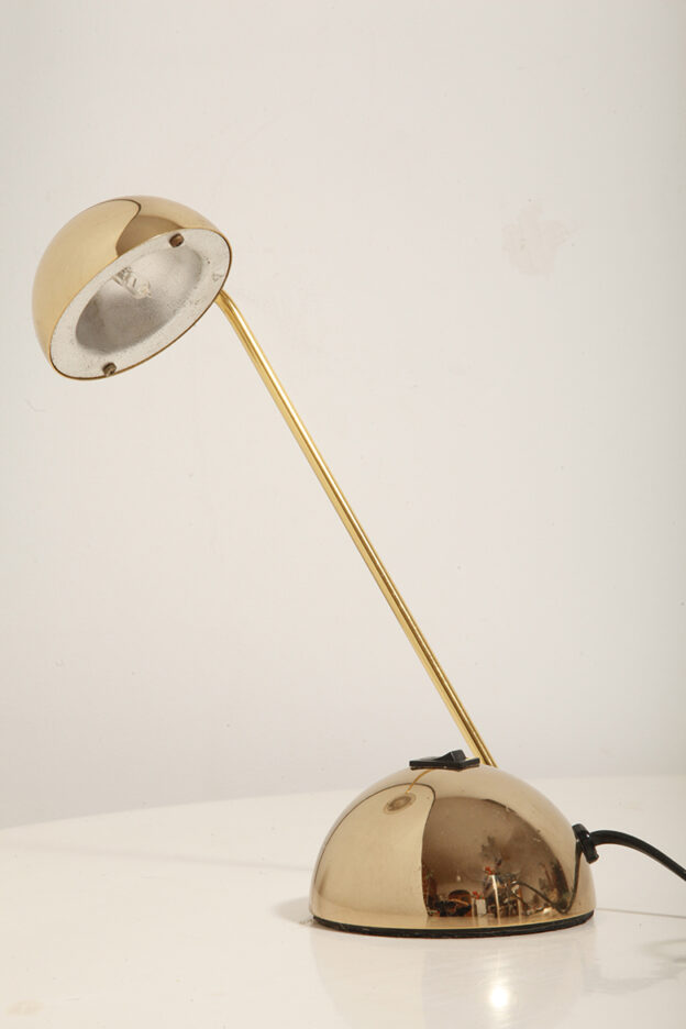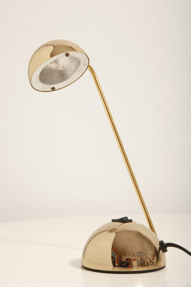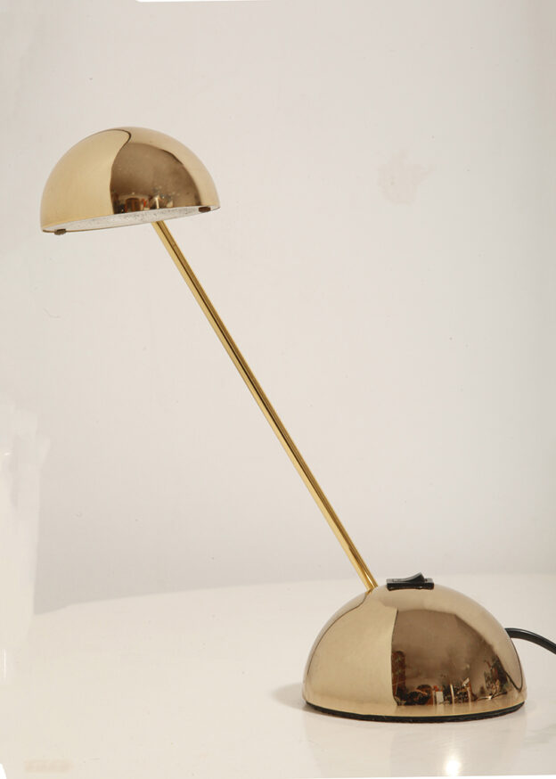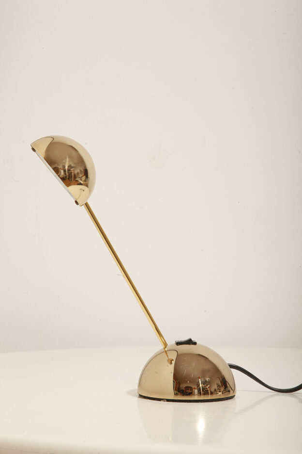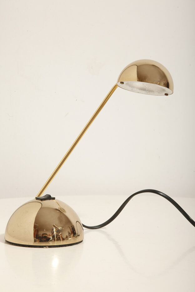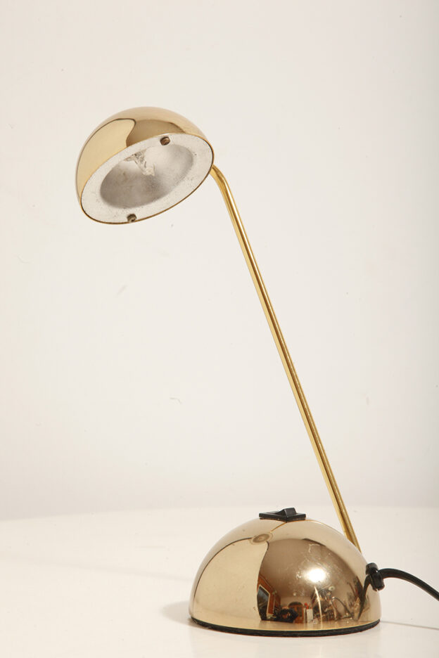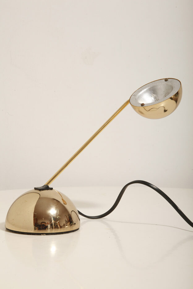 Ta lampa to wczesny powiew pojawiającego się stylu Memphis, może troszkę jeszcze nieśmiało, ale w tym właśnie kierunku. Zabawa proporcjami i geometrycznymi bryłami. A do tego złotość, czyli na bogato.