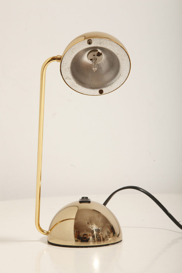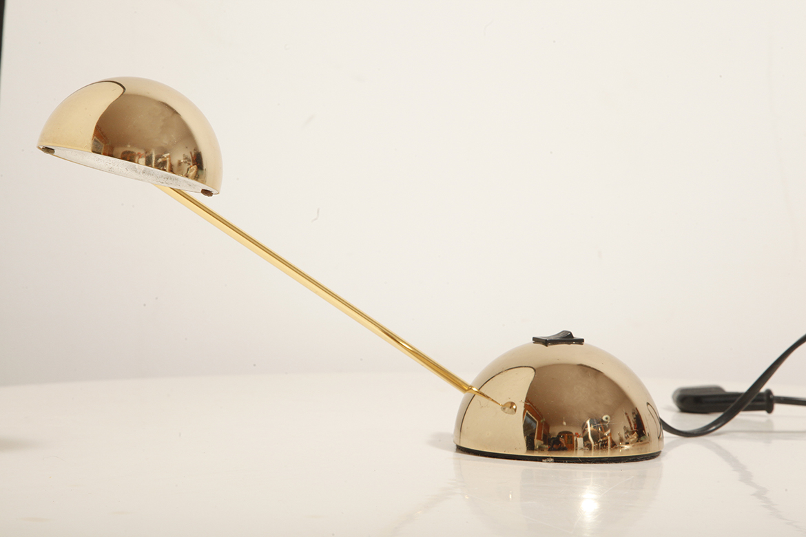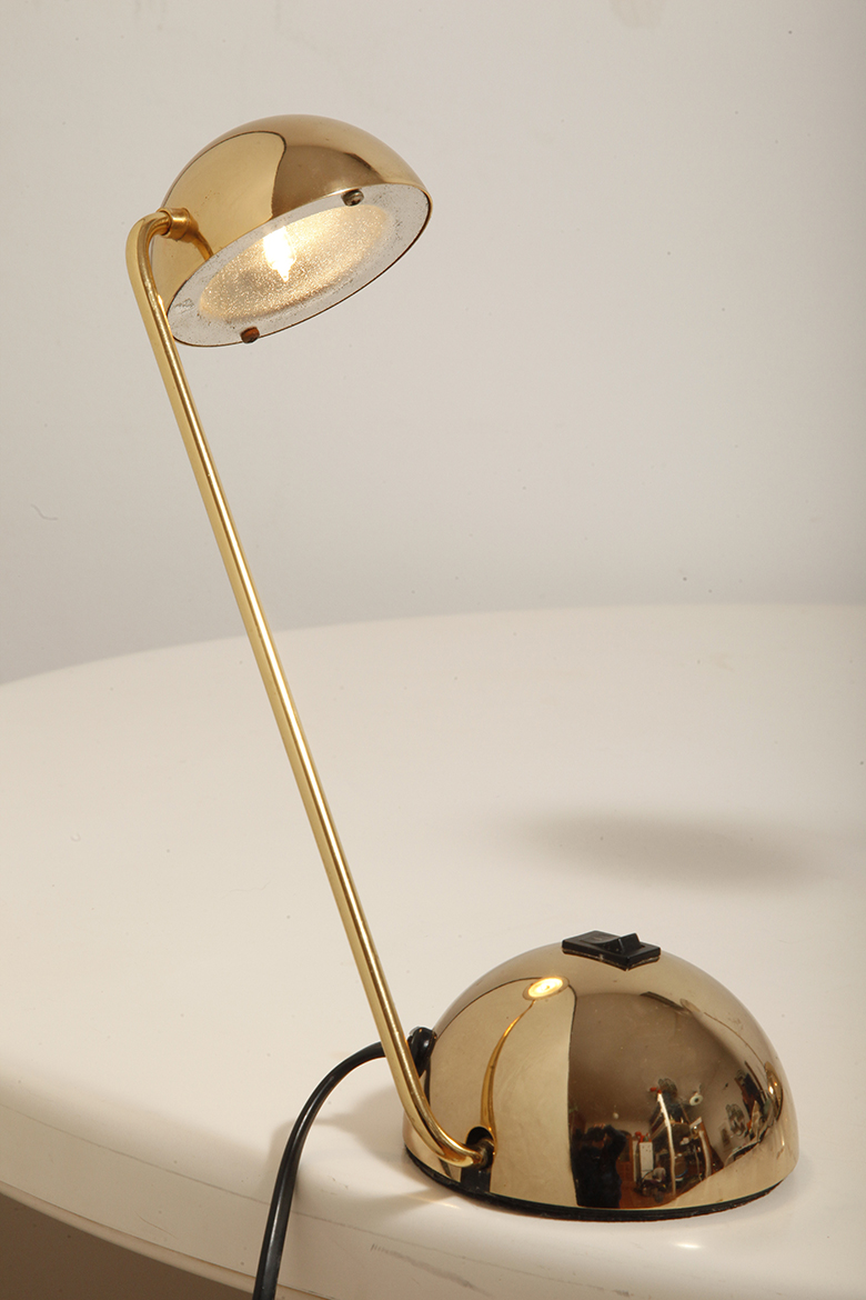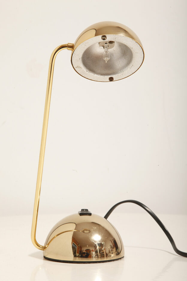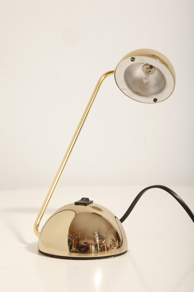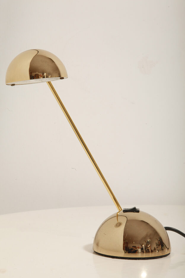 Ta lampa to wczesny powiew pojawiającego się stylu Memphis, może troszkę jeszcze nieśmiało, ale w tym właśnie kierunku. Zabawa proporcjami i geometrycznymi bryłami. A do tego złotość, czyli na bogato.