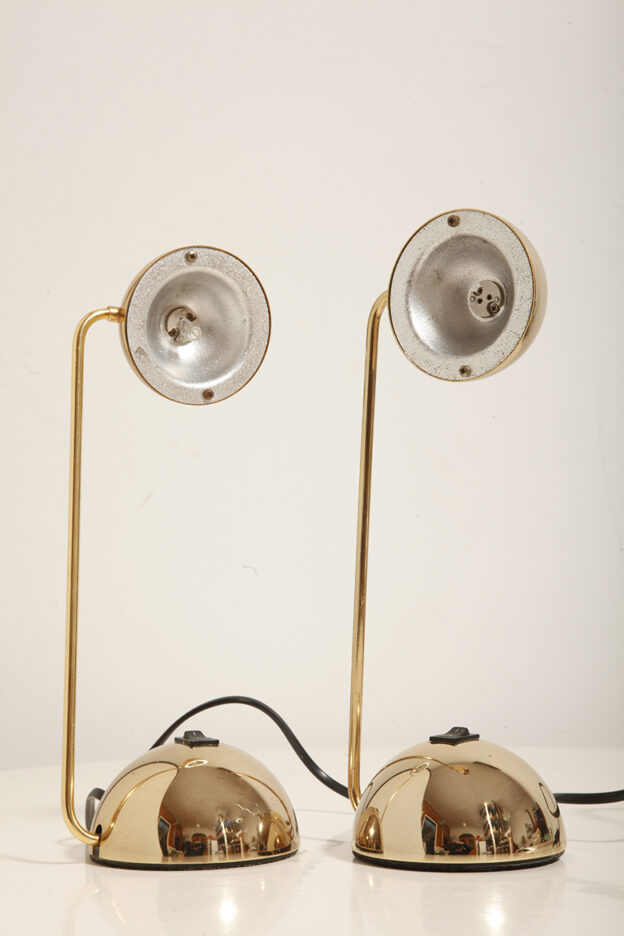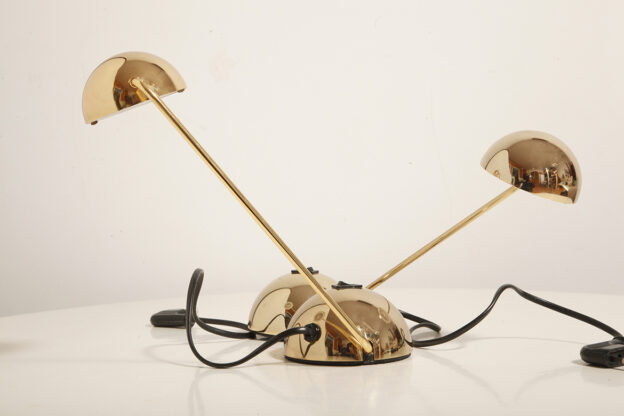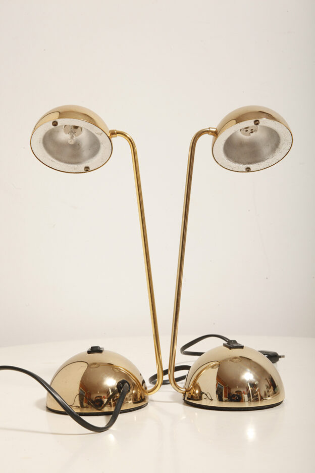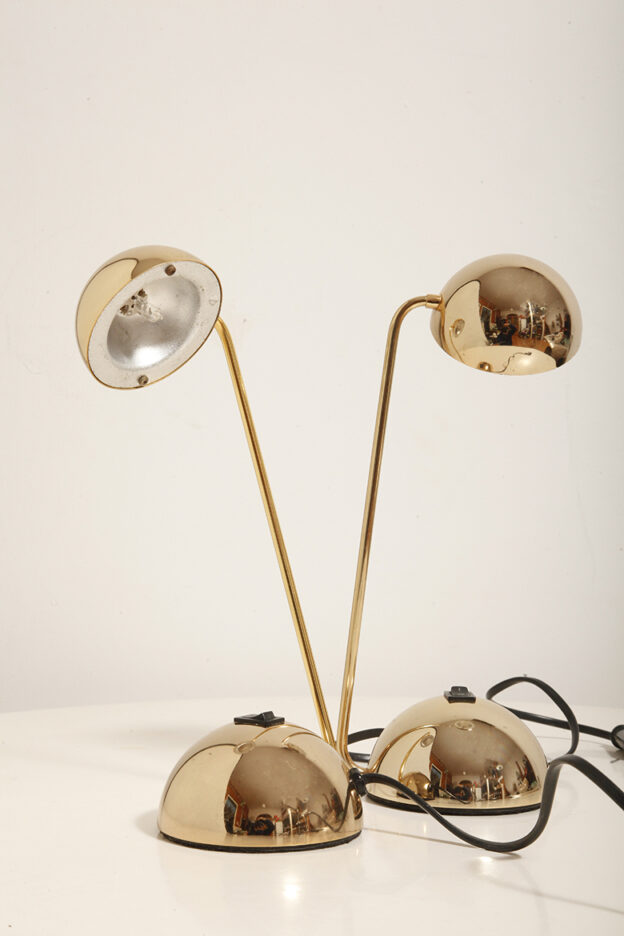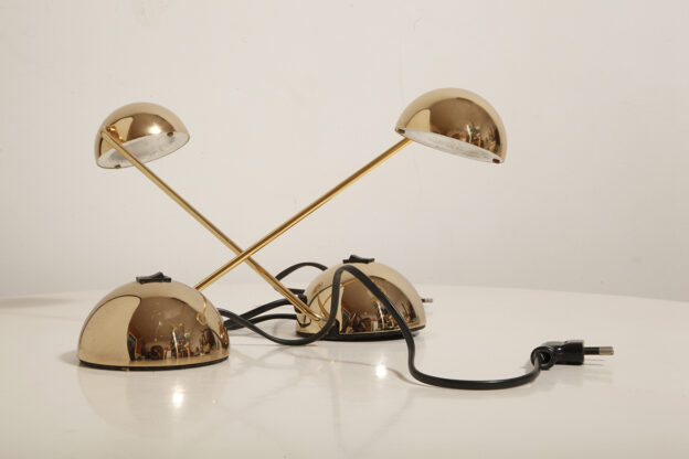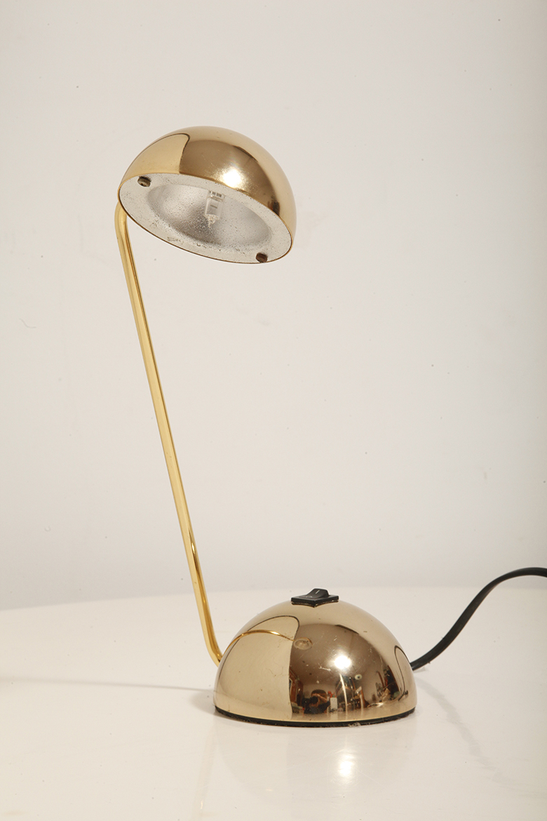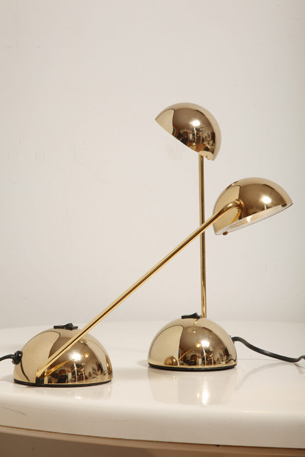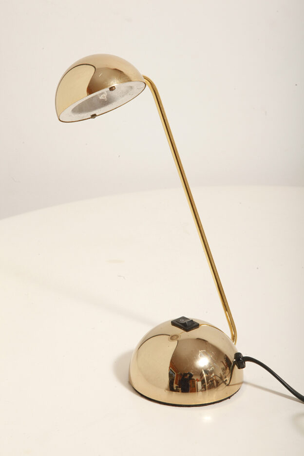 Ta lampa to wczesny powiew pojawiającego się stylu Memphis, może troszkę jeszcze nieśmiało, ale w tym właśnie kierunku. Zabawa proporcjami i geometrycznymi bryłami. A do tego złotość, czyli na bogato.