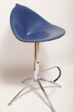 Projekt stołków (mamy dwie sztuki) składa się z chromowanej stalowej ramy z podnóżkiem z siedziskiem pokrytym niebieską grubą skórą naturalną.