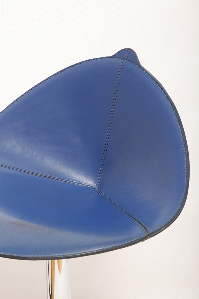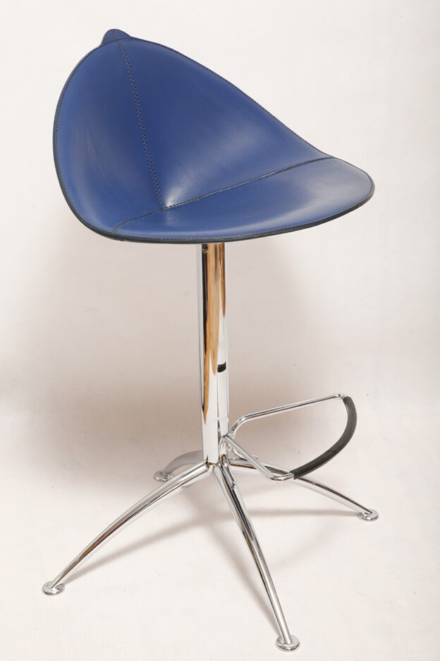 Projekt stołków (mamy dwie sztuki) składa się z chromowanej stalowej ramy z podnóżkiem z siedziskiem pokrytym niebieską grubą skórą naturalną.