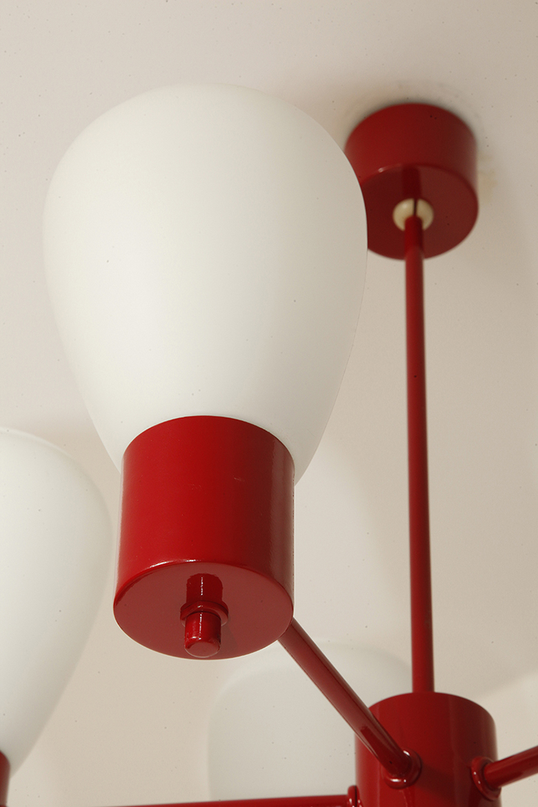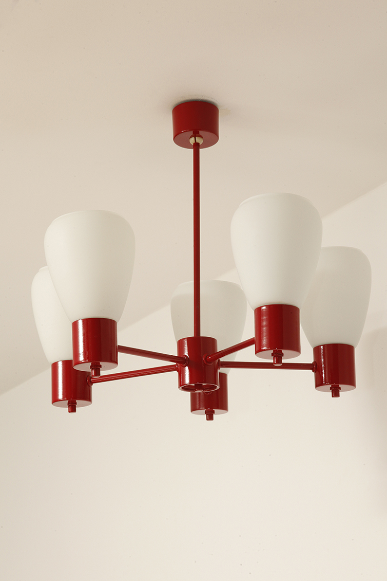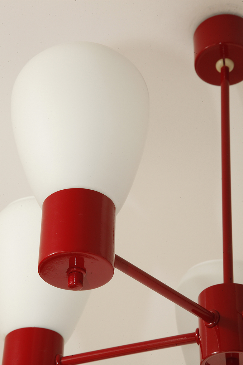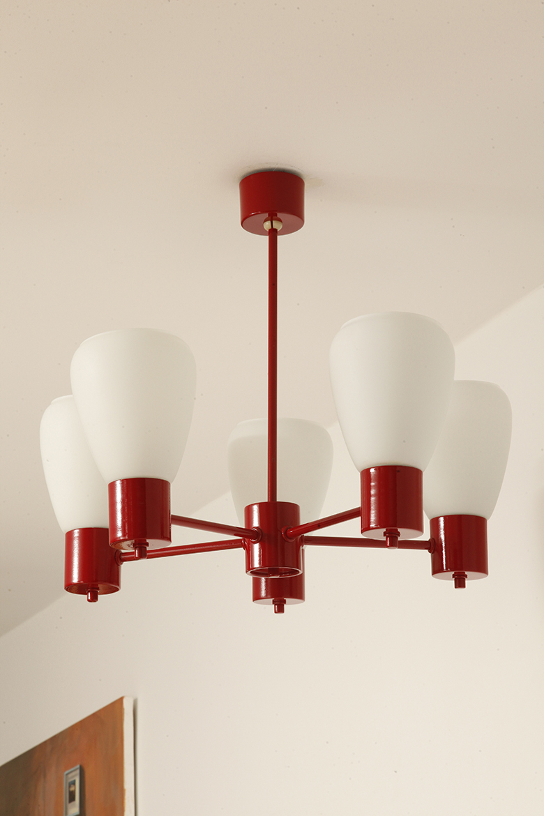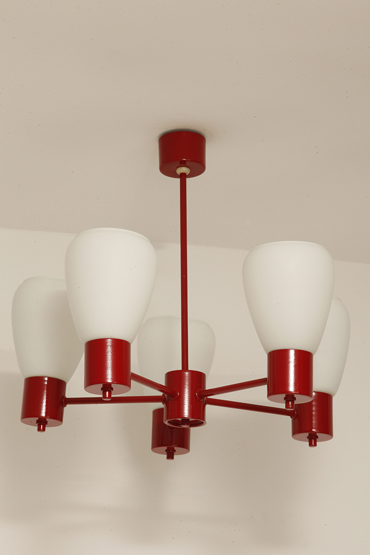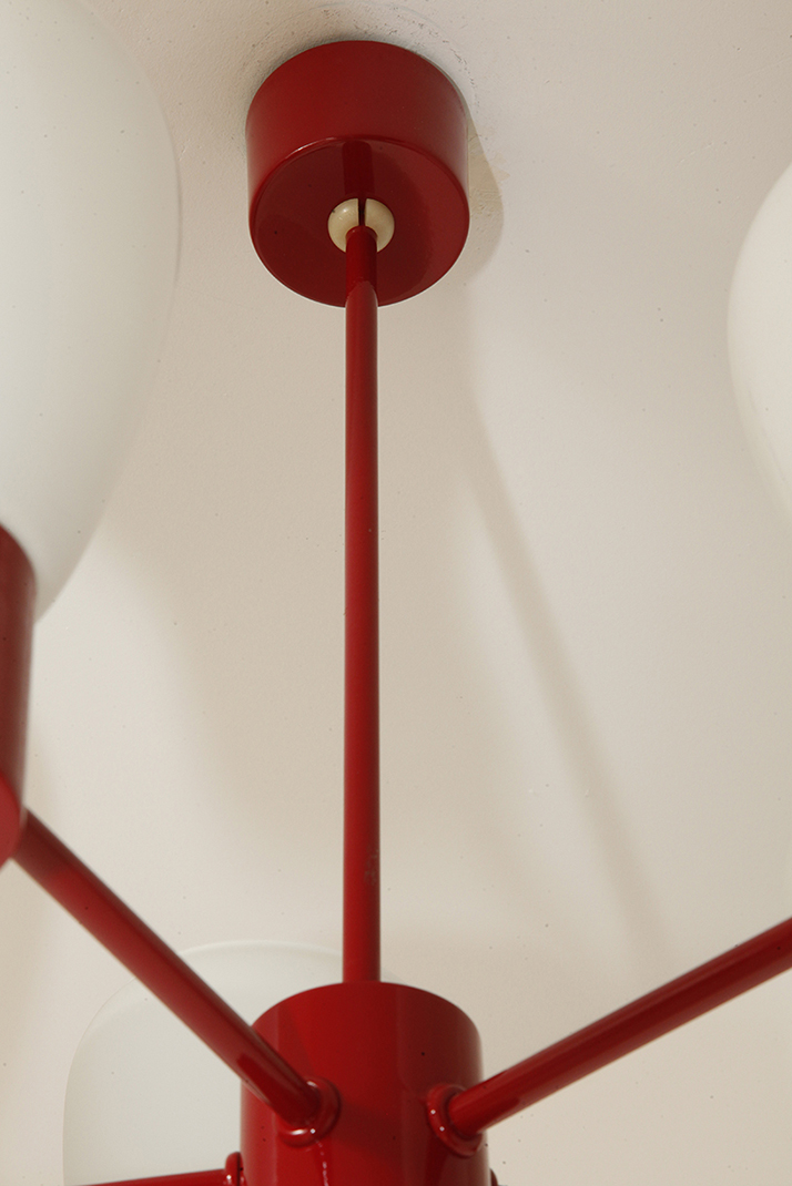 Pięciopunktowa czerwona metalowa lampa sufitowa/żyrandol ze szklanymi mlecznobiałymi kloszami, Niemcy, lata 60/70.